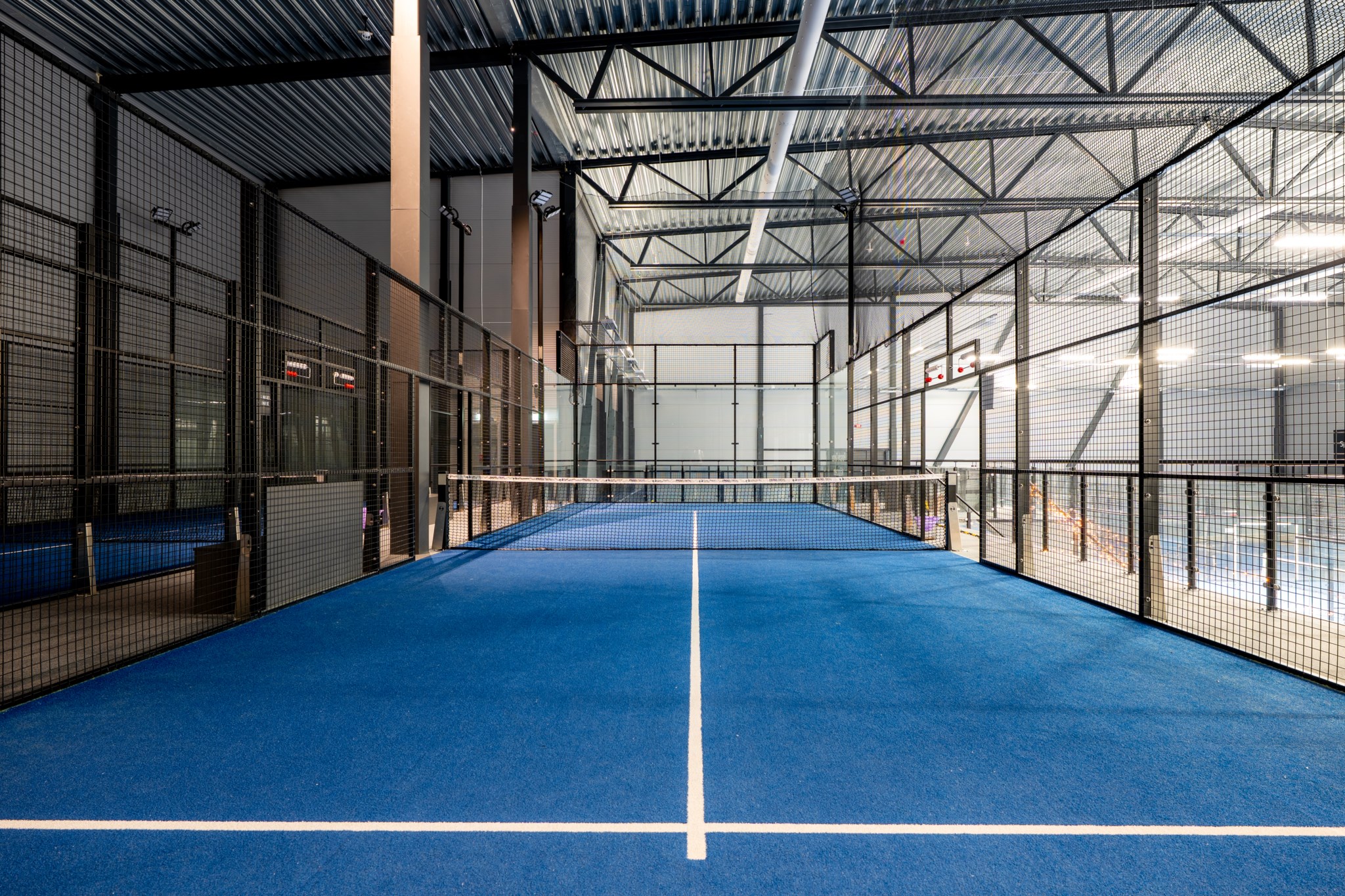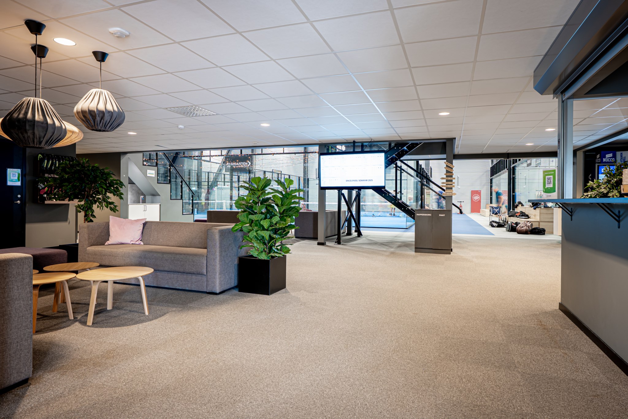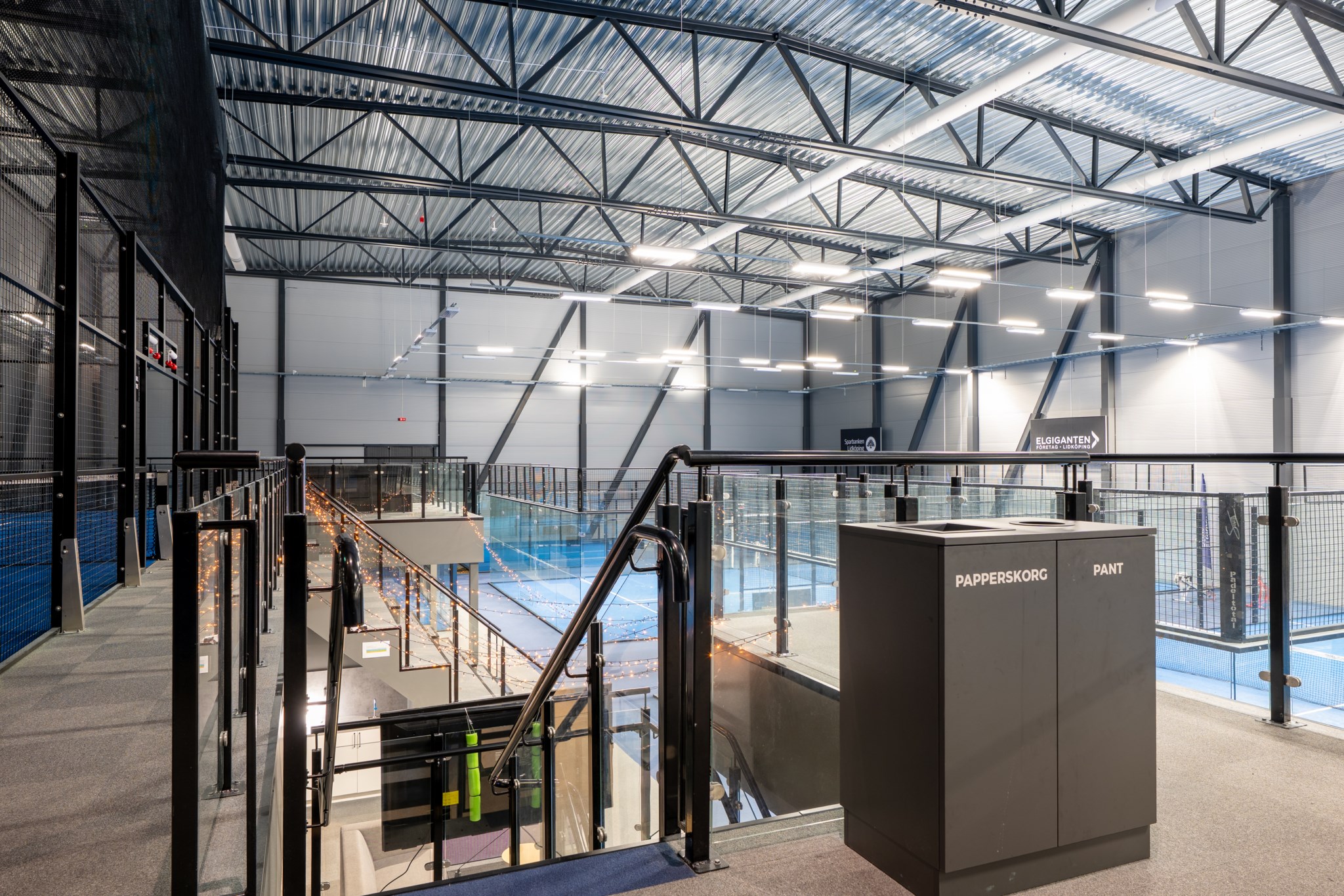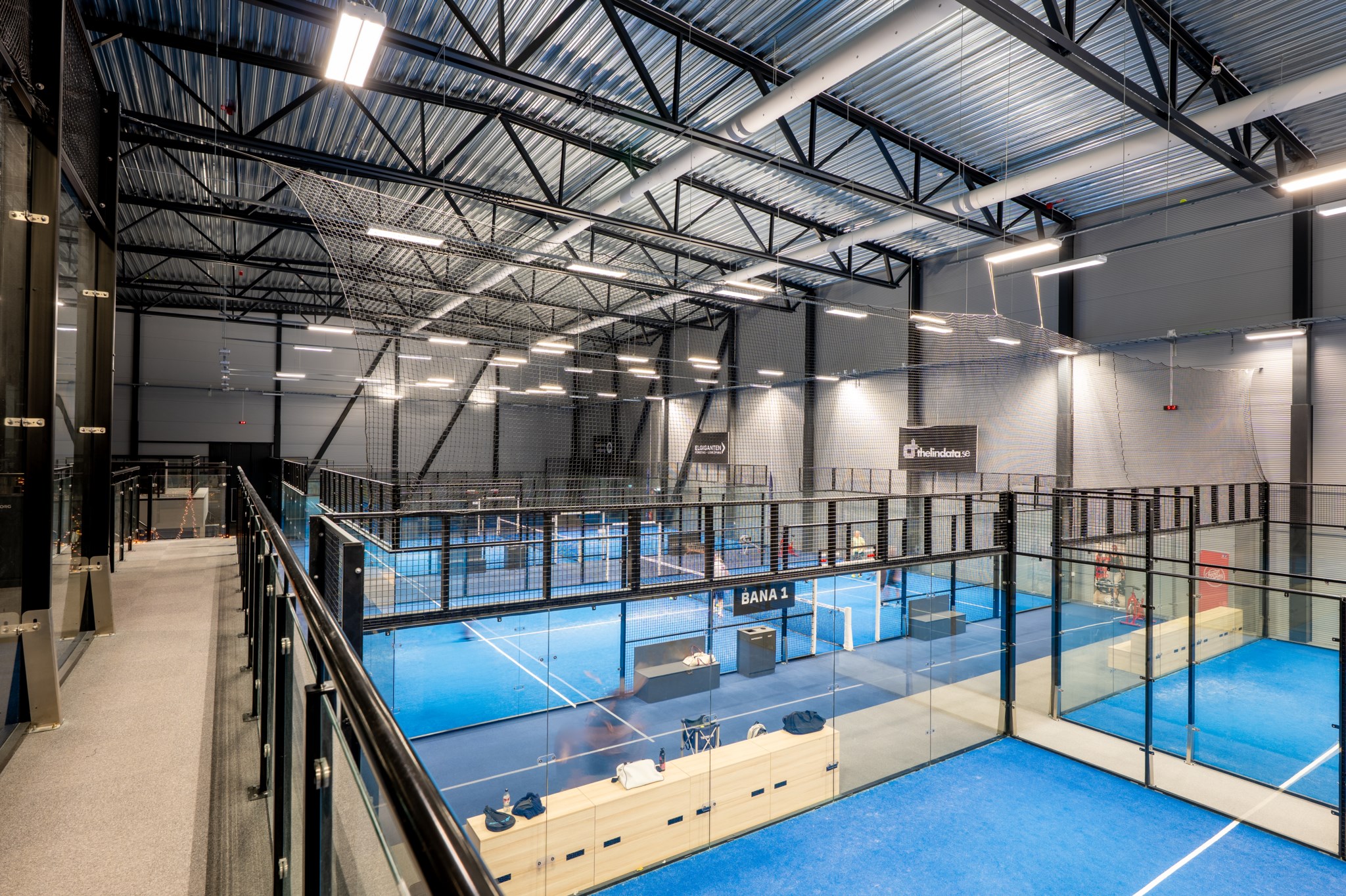 Hallen som uppfördes 2021-22 håller en genomgående hög nivå med entréplan som är fördelat genom 9 padelbanor, reception,