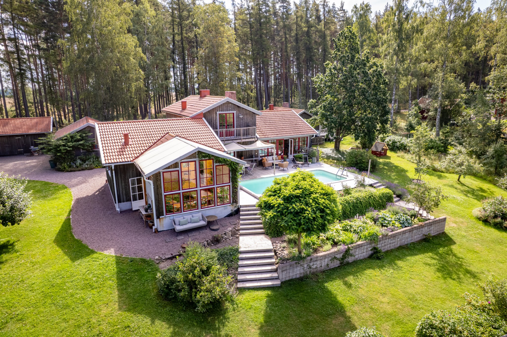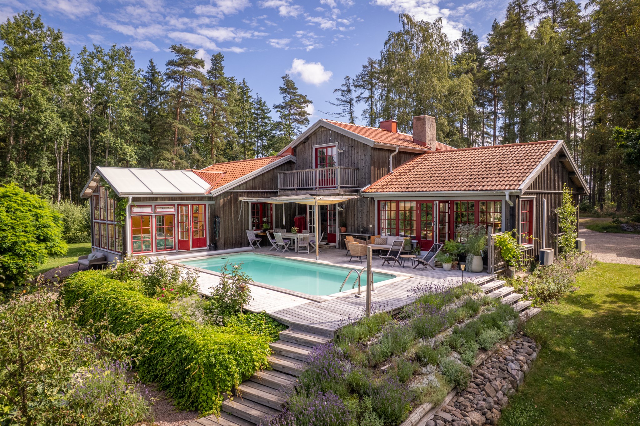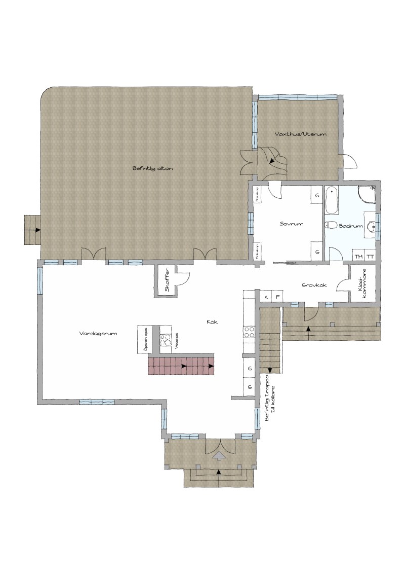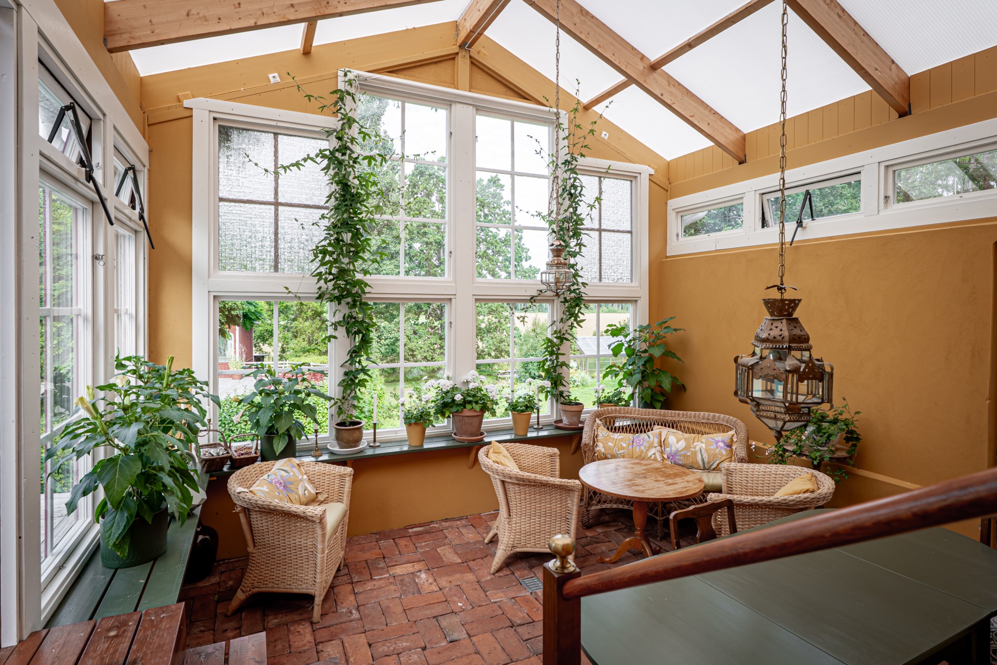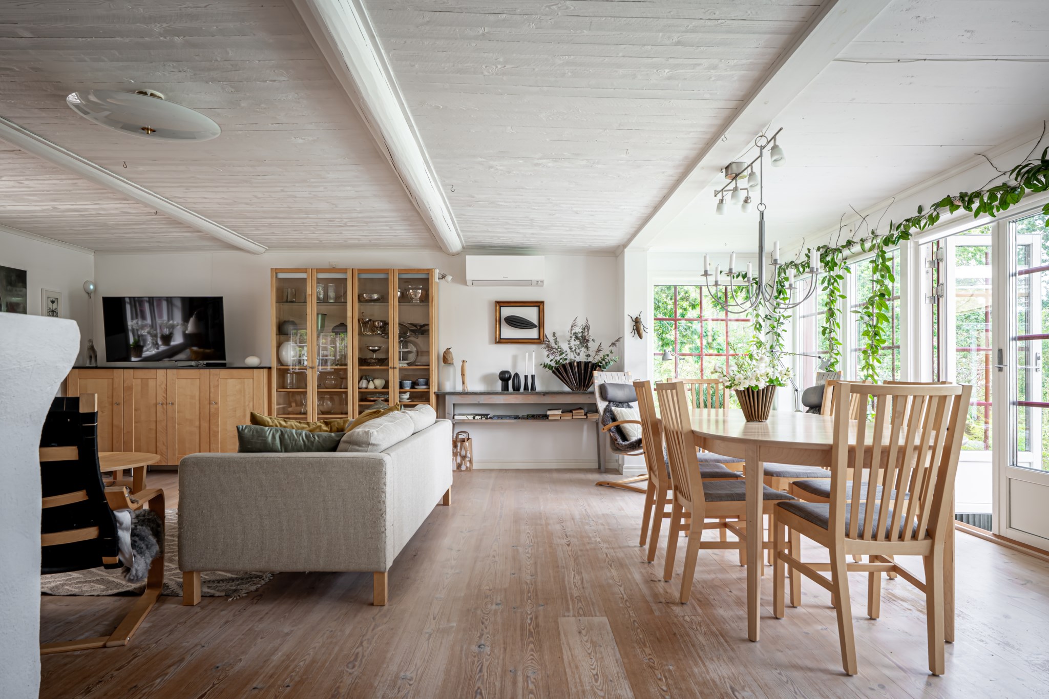 Välkommen in i den luftiga hallen, här går trappan till övervåningen upp. Stort lantligt kök som ansluter till det stora vardagsrummet med pardörrar ut till den stora terrassen med poolen. Kök och vardagsrum avgränsas av stor eldstad med vedspis åt köket och öppen spis mot vardagsrummet. Från köket når man master bedroom samt ett stort helkaklat badrum samt klädkammare, här finns även husets groventré. Från sovrummet kan man även gå ut till det vidbyggda orangeriet som är ett uterum stor del av året.