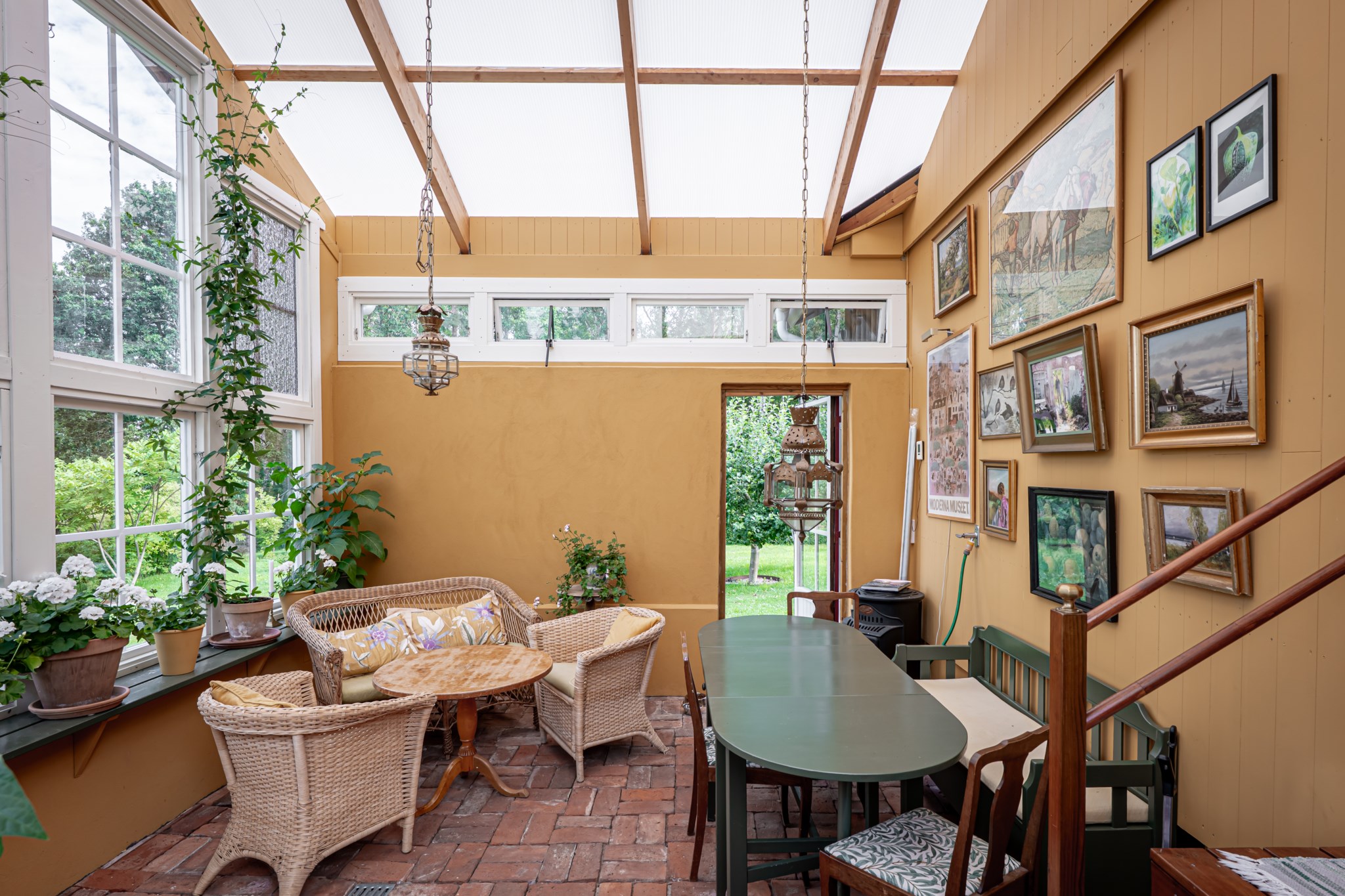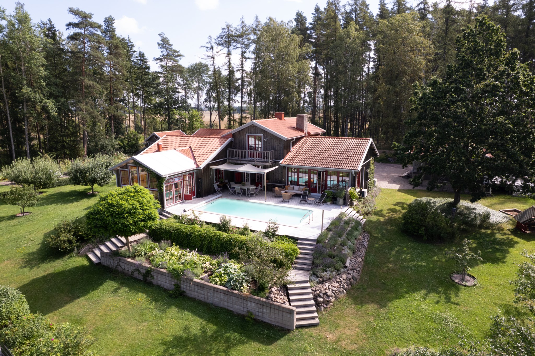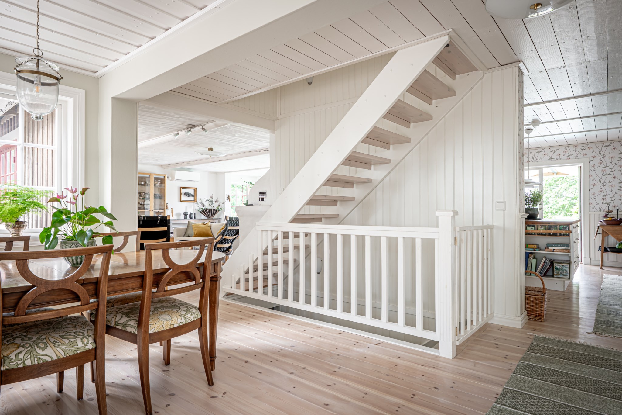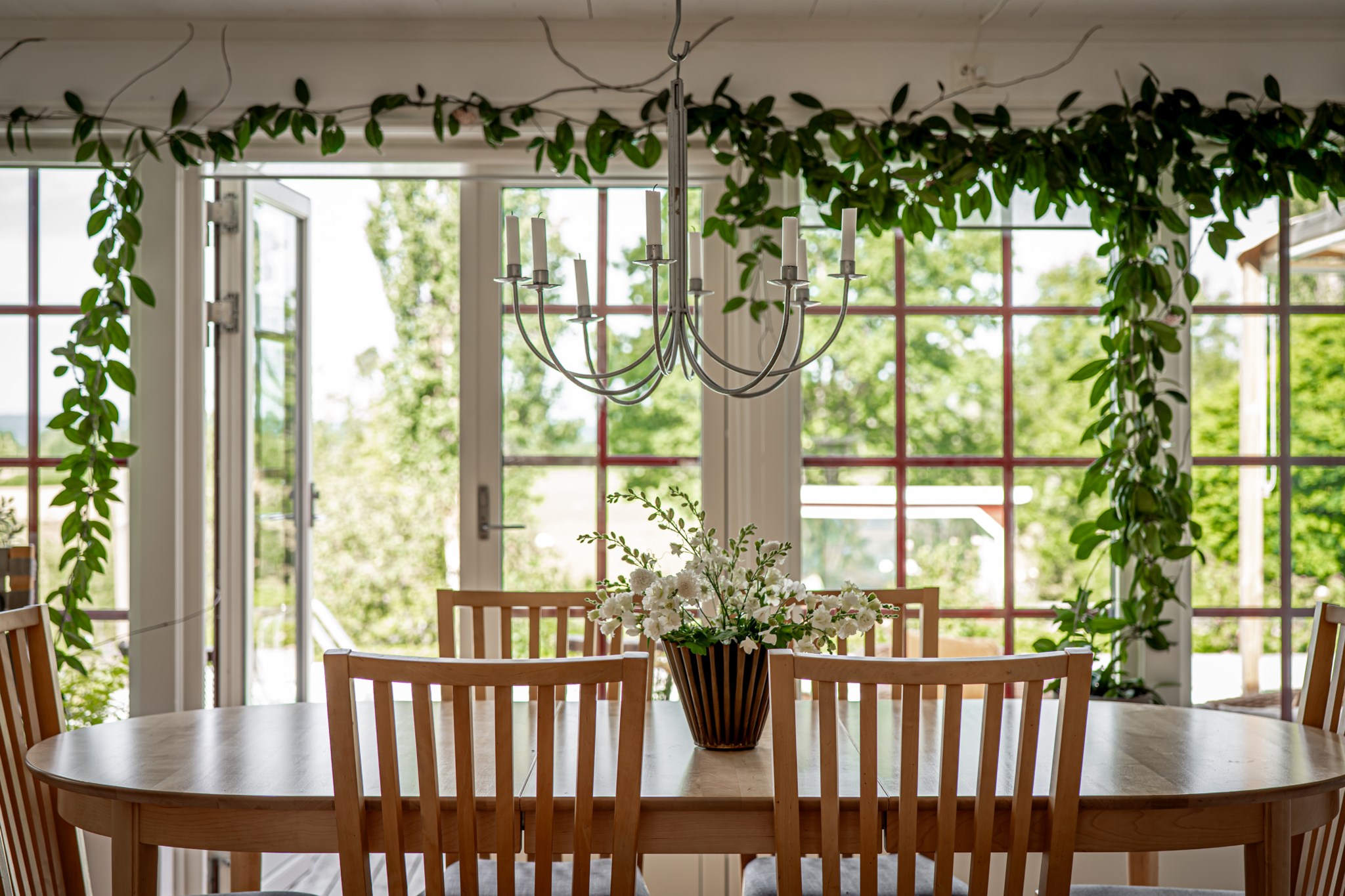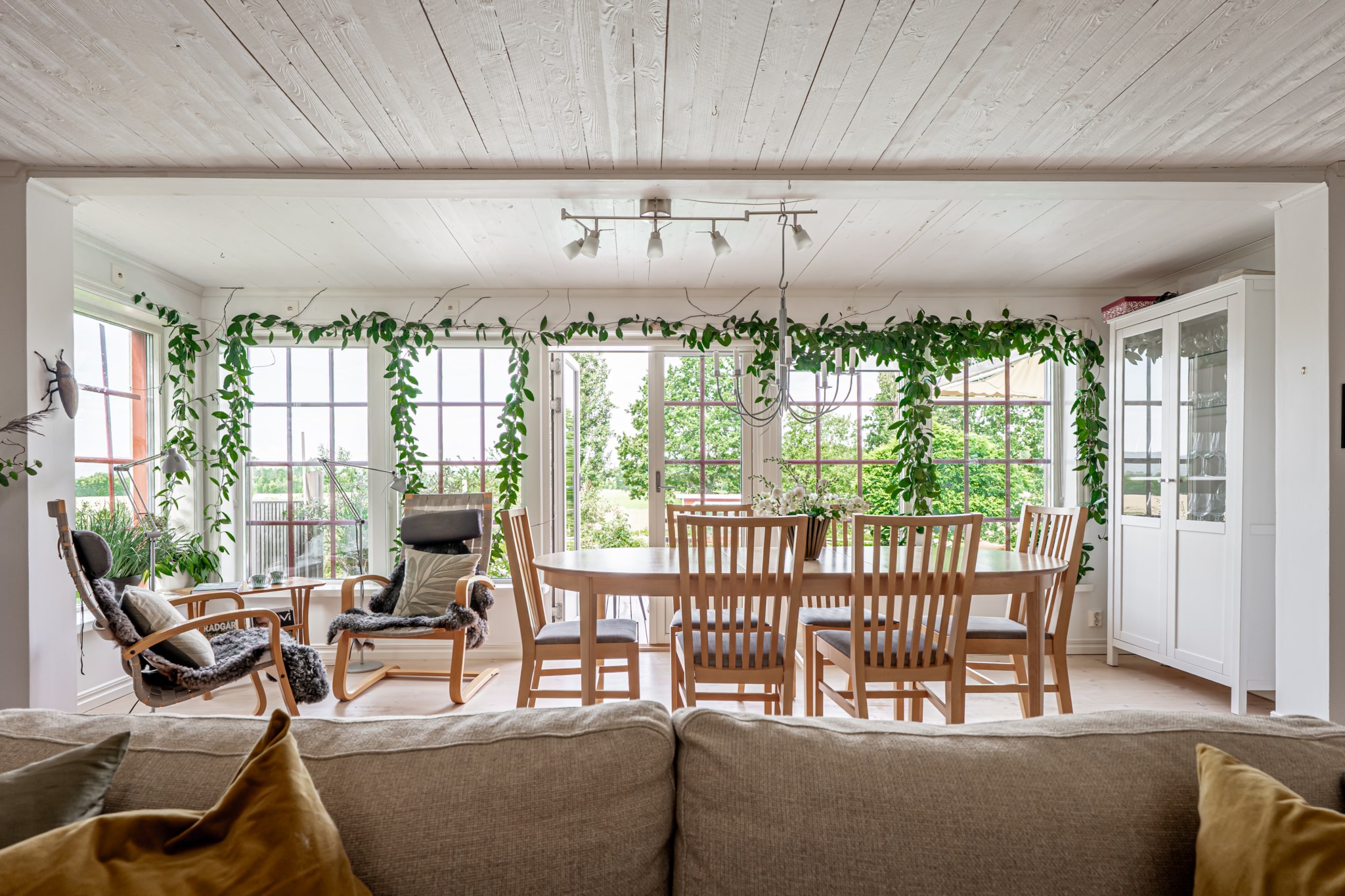 Välkommen in i den luftiga hallen, här går trappan till övervåningen upp. Stort lantligt kök som ansluter till det stora vardagsrummet med pardörrar ut till den stora terrassen med poolen. Kök och vardagsrum avgränsas av stor eldstad med vedspis åt köket och öppen spis mot vardagsrummet. Från köket når man master bedroom samt ett stort helkaklat badrum samt klädkammare, här finns även husets groventré. Från sovrummet kan man även gå ut till det vidbyggda orangeriet som är ett uterum stor del av året.