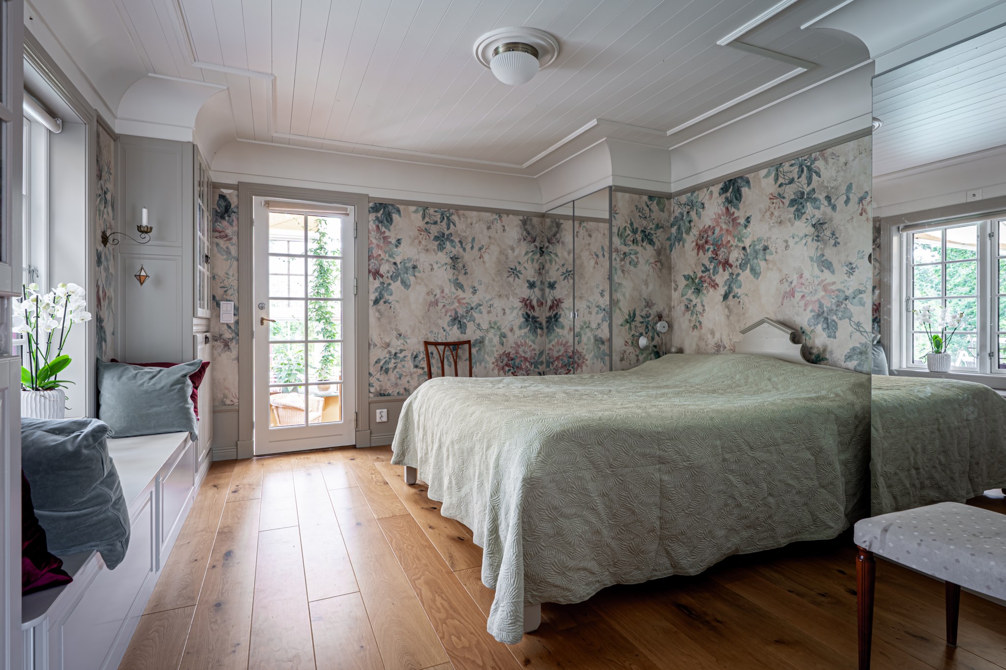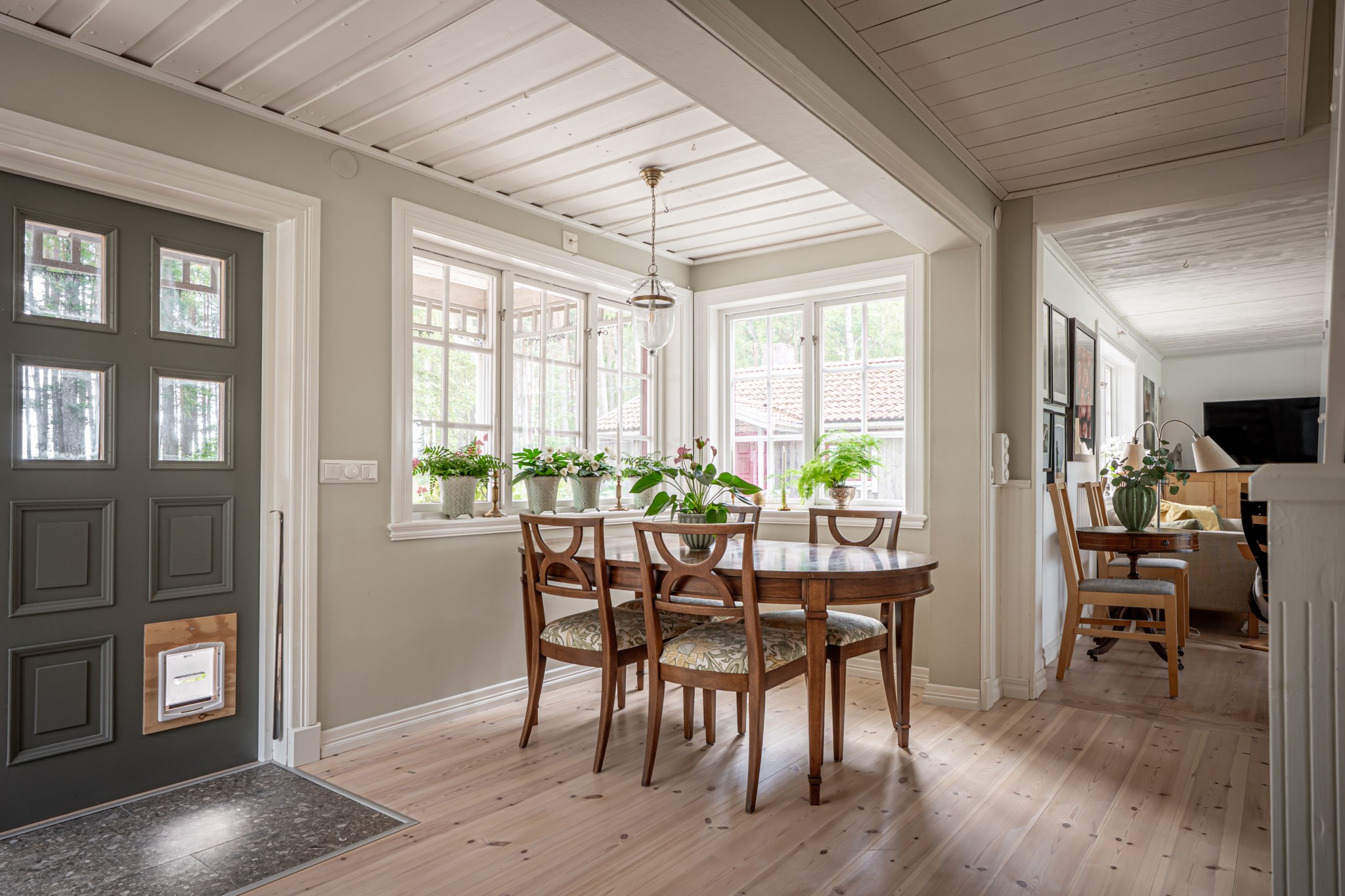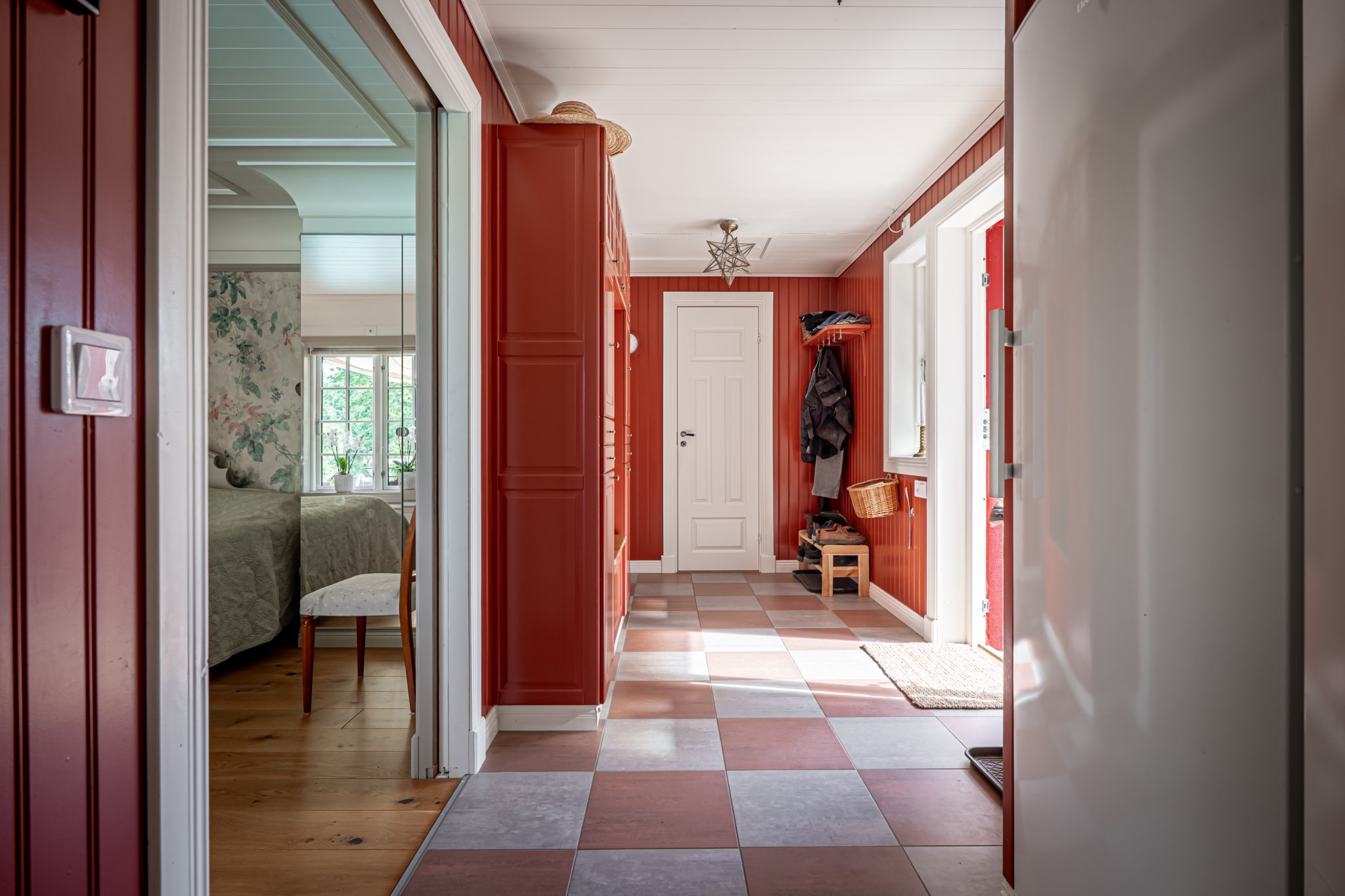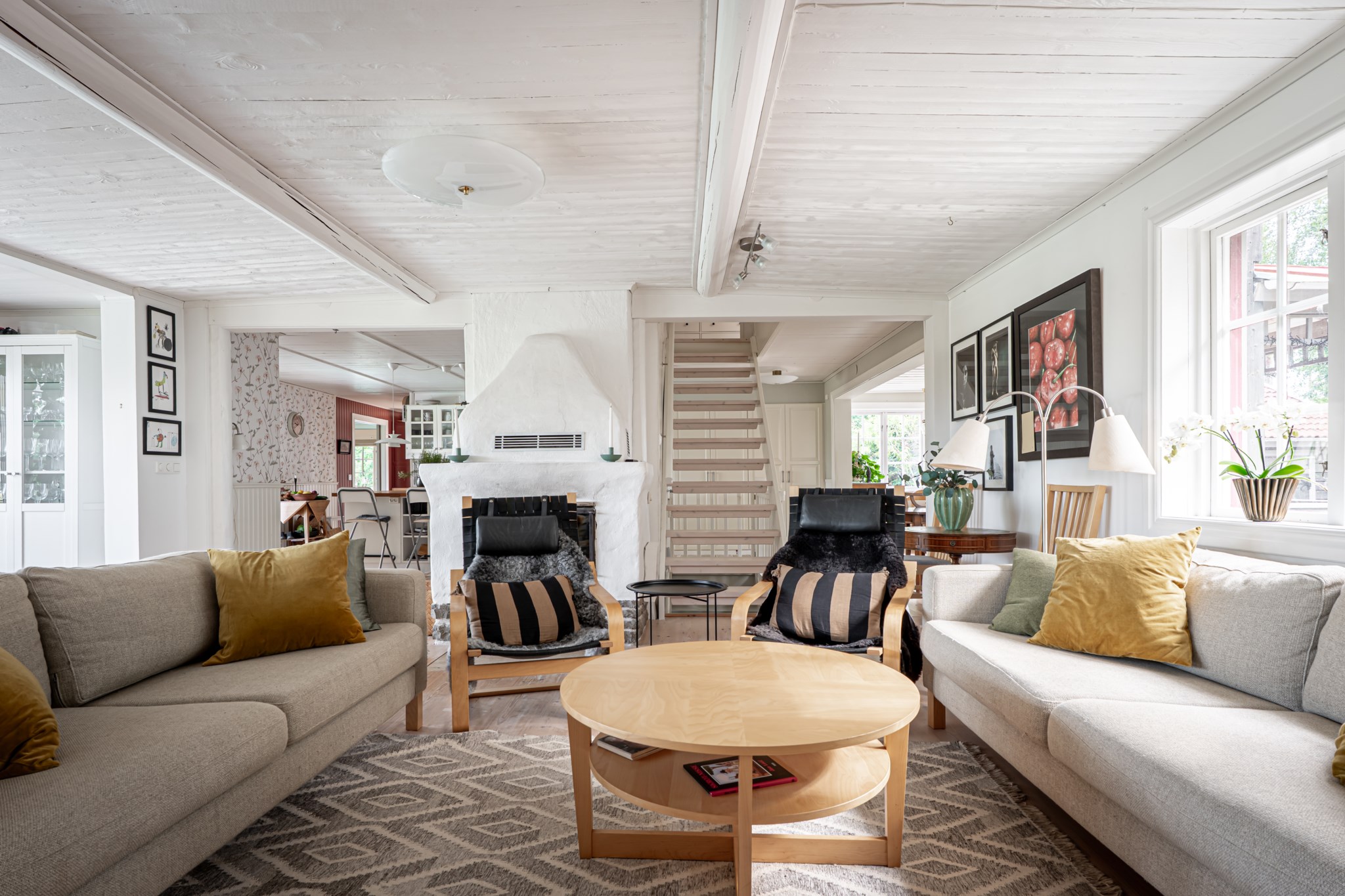 Välkommen in i den luftiga hallen, här går trappan till övervåningen upp. Stort lantligt kök som ansluter till det stora vardagsrummet med pardörrar ut till den stora terrassen med poolen. Kök och vardagsrum avgränsas av stor eldstad med vedspis åt köket och öppen spis mot vardagsrummet. Från köket når man master bedroom samt ett stort helkaklat badrum samt klädkammare, här finns även husets groventré. Från sovrummet kan man även gå ut till det vidbyggda orangeriet som är ett uterum stor del av året.