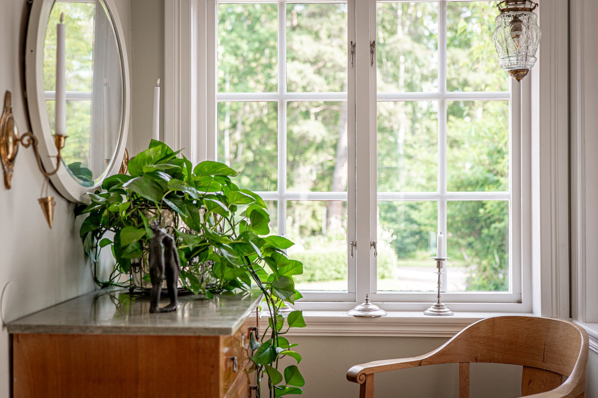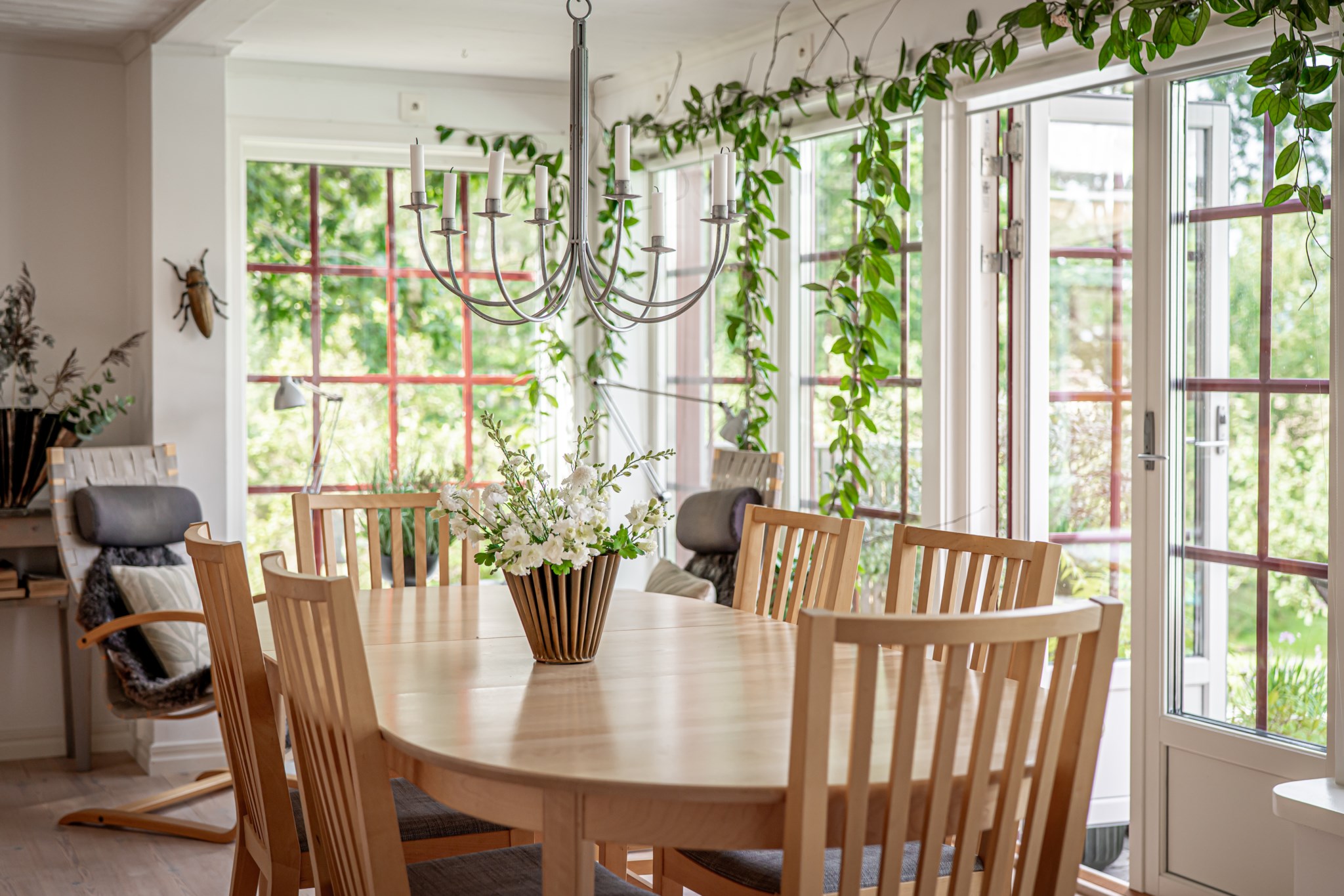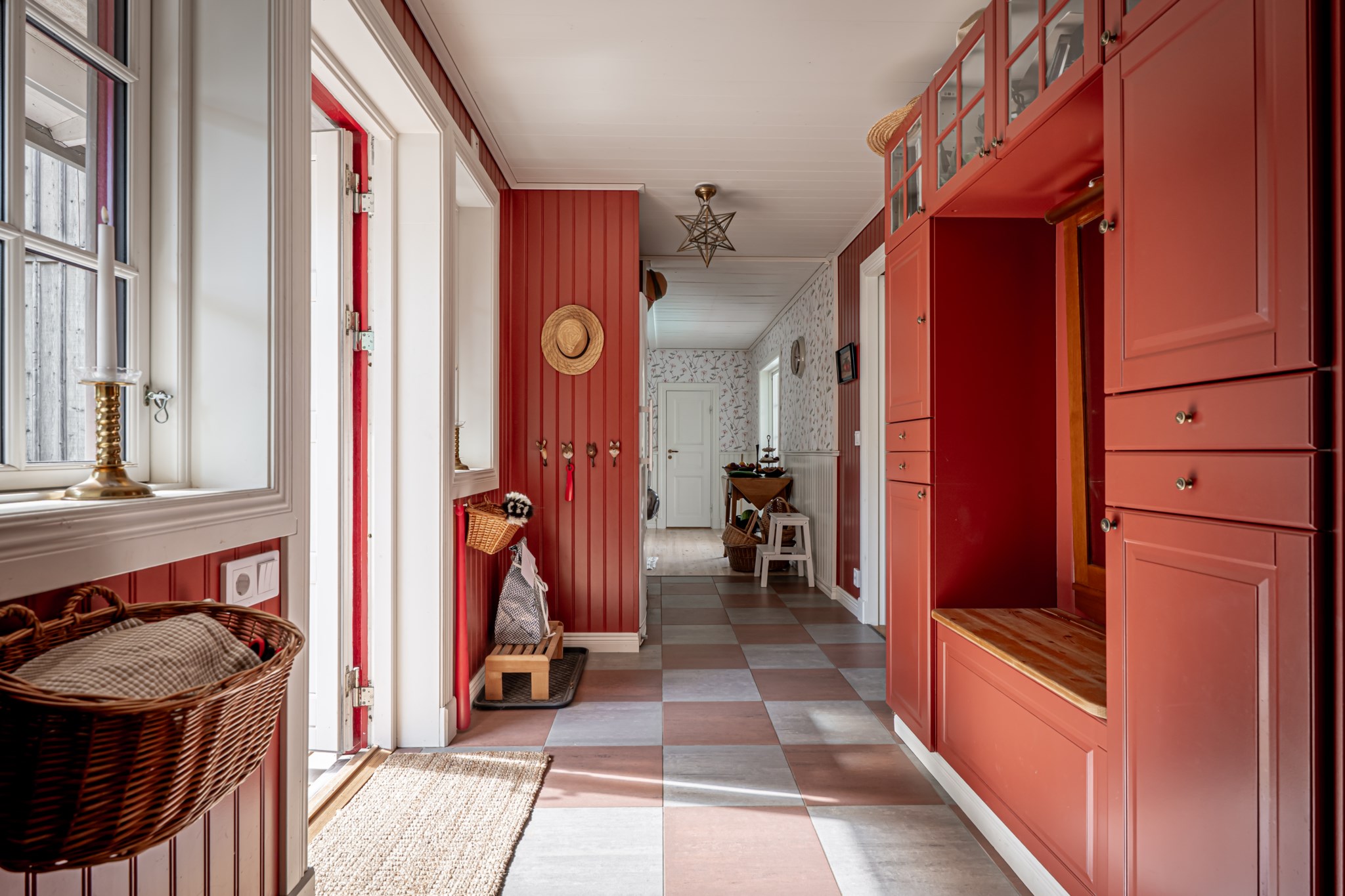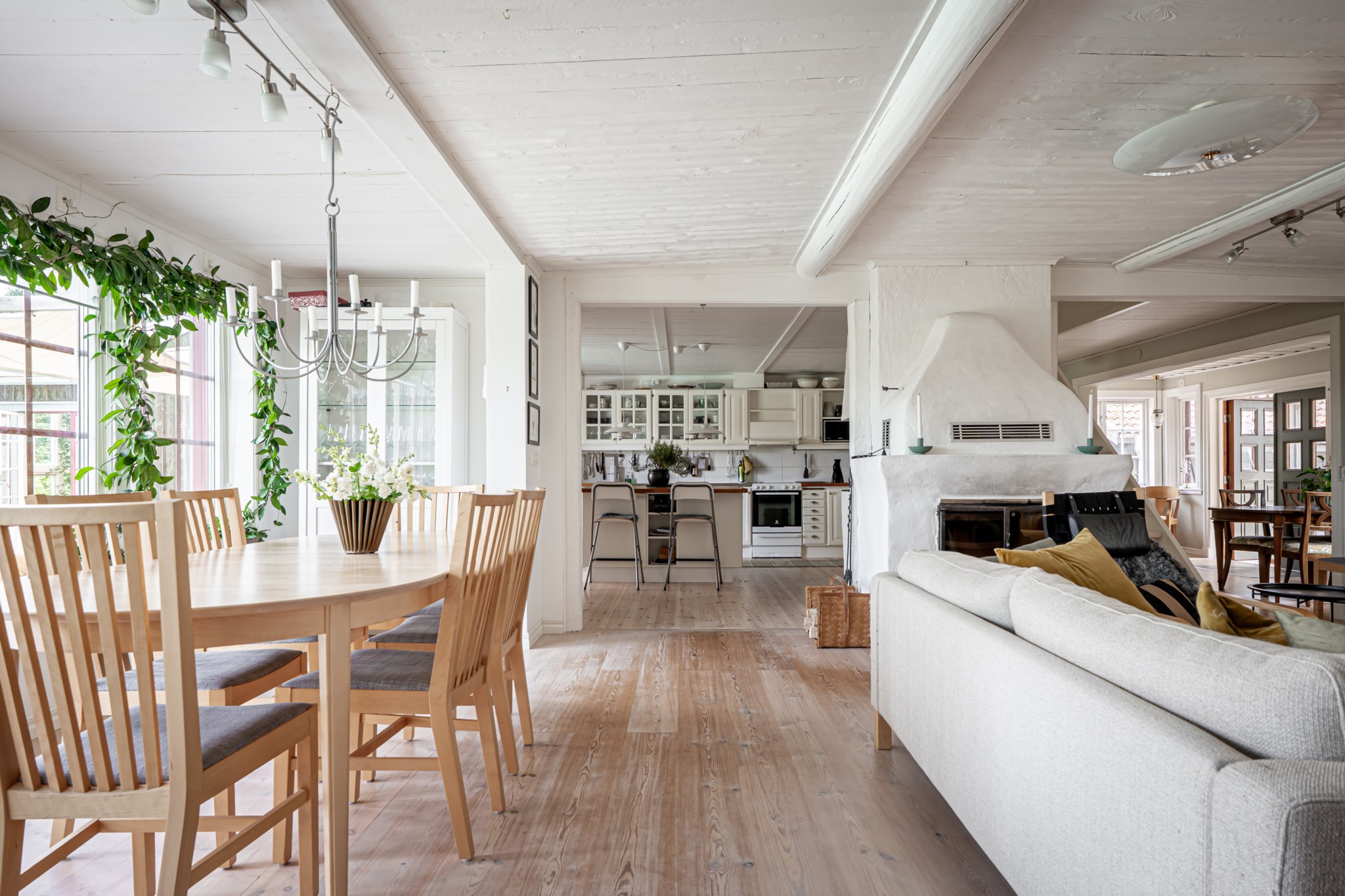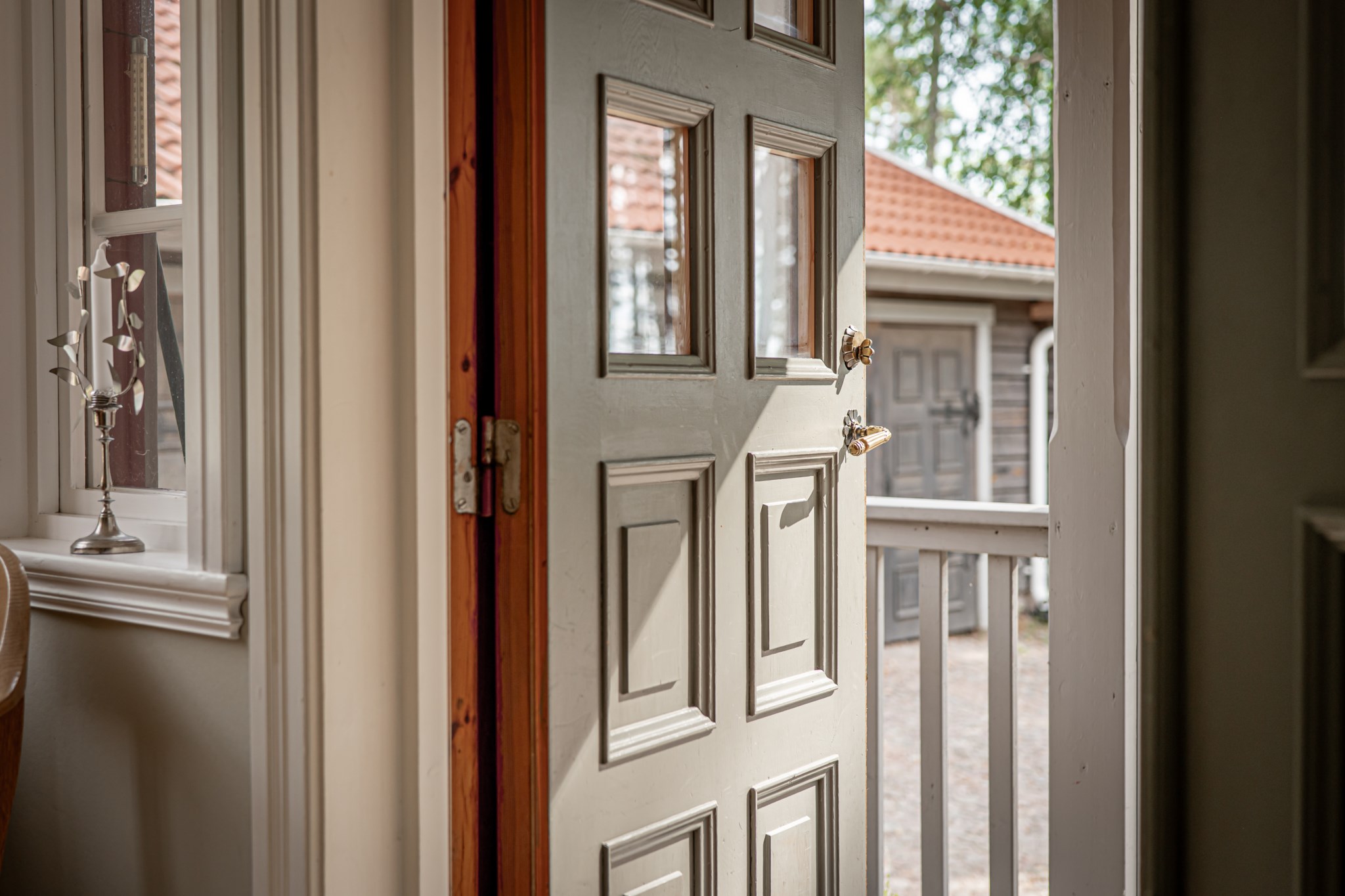 Välkommen in i den luftiga hallen, här går trappan till övervåningen upp. Stort lantligt kök som ansluter till det stora vardagsrummet med pardörrar ut till den stora terrassen med poolen. Kök och vardagsrum avgränsas av stor eldstad med vedspis åt köket och öppen spis mot vardagsrummet. Från köket når man master bedroom samt ett stort helkaklat badrum samt klädkammare, här finns även husets groventré. Från sovrummet kan man även gå ut till det vidbyggda orangeriet som är ett uterum stor del av året.