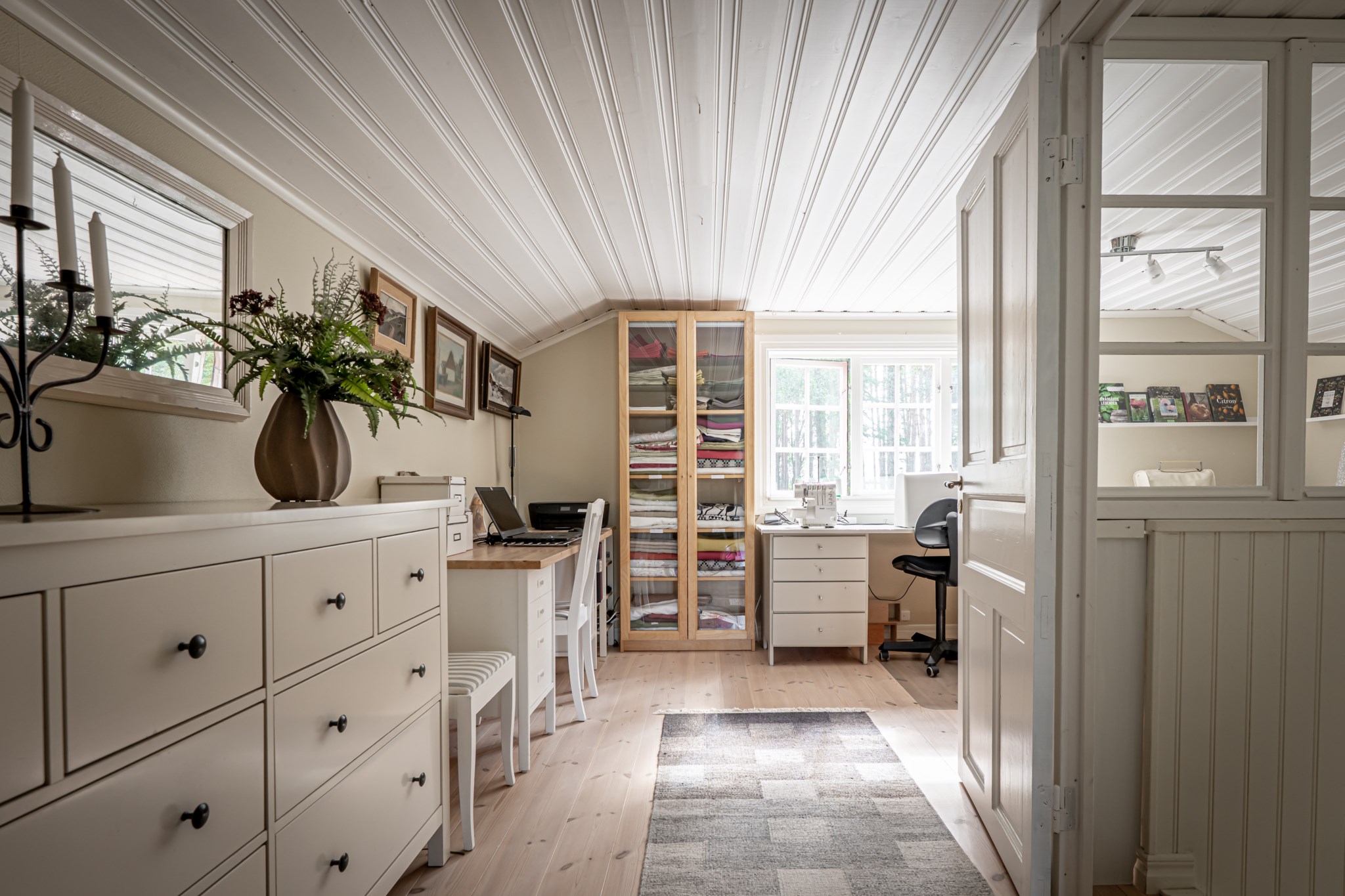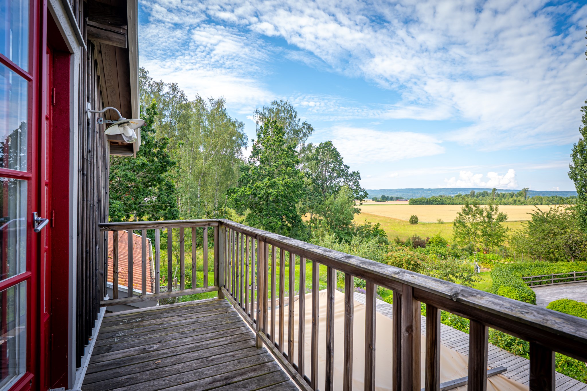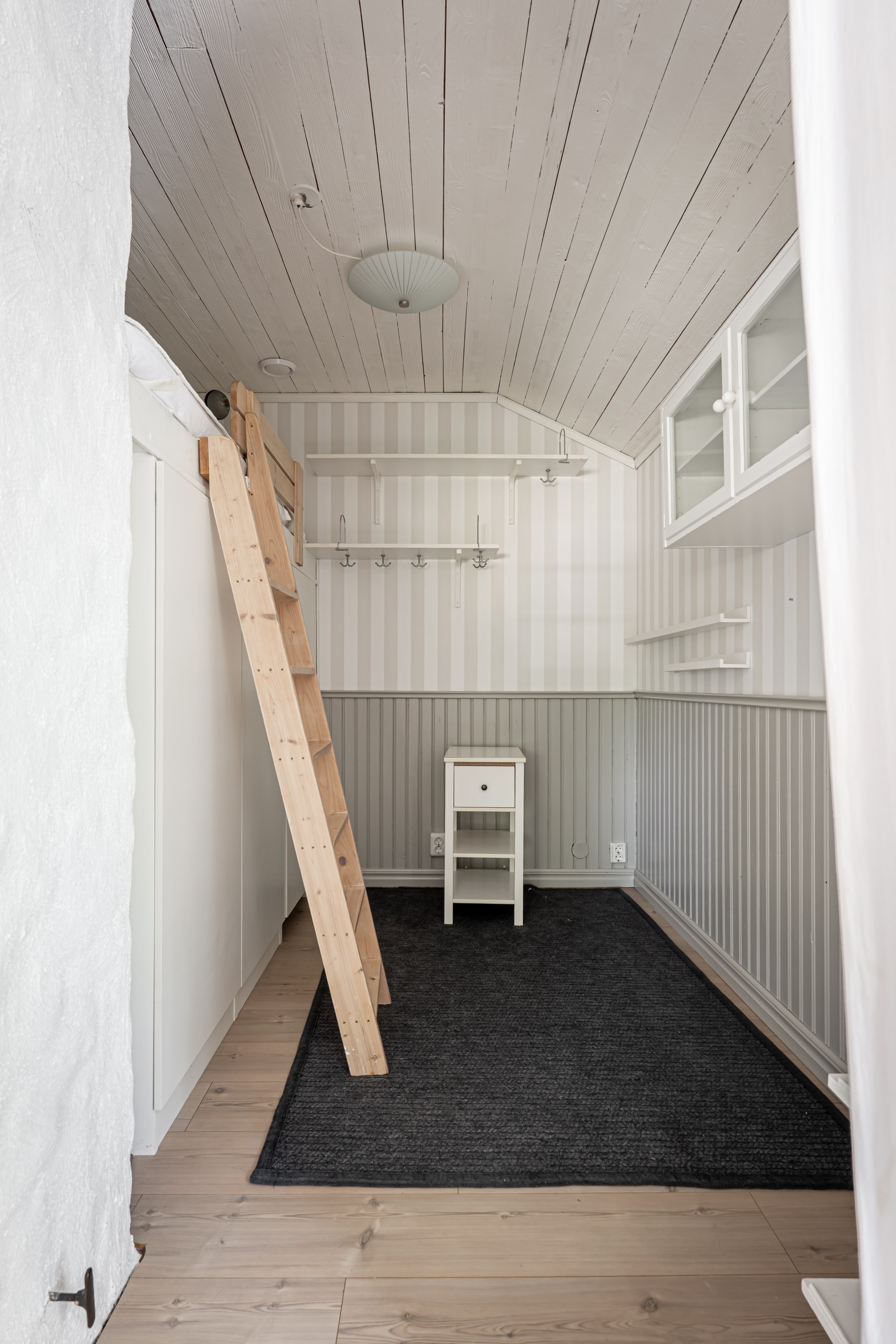 En tappa upp finns ett allrum/arbetsrum samt WC och ett härligt sovrum med balkong där man kan avnjuta när solen går ner över Billingen i väster.