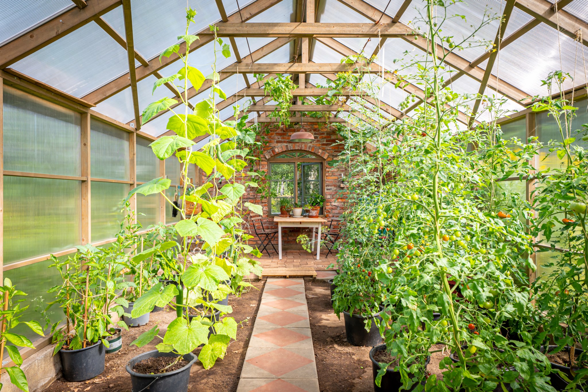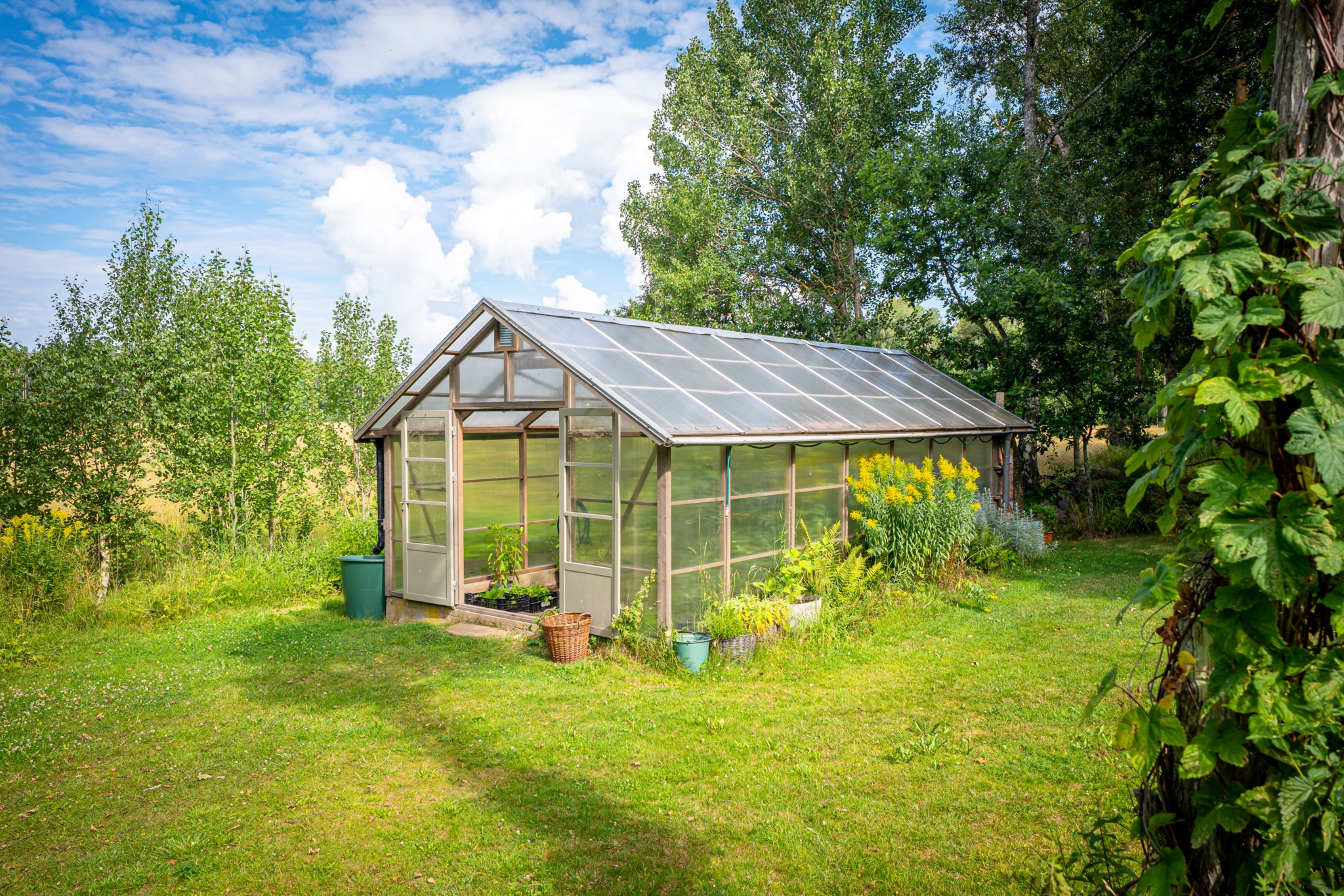 Växthuset nere i trädgården med känsla av Provence där ena kortsidan är uppmurad i handslaget tegel från Horns tegelbruk.