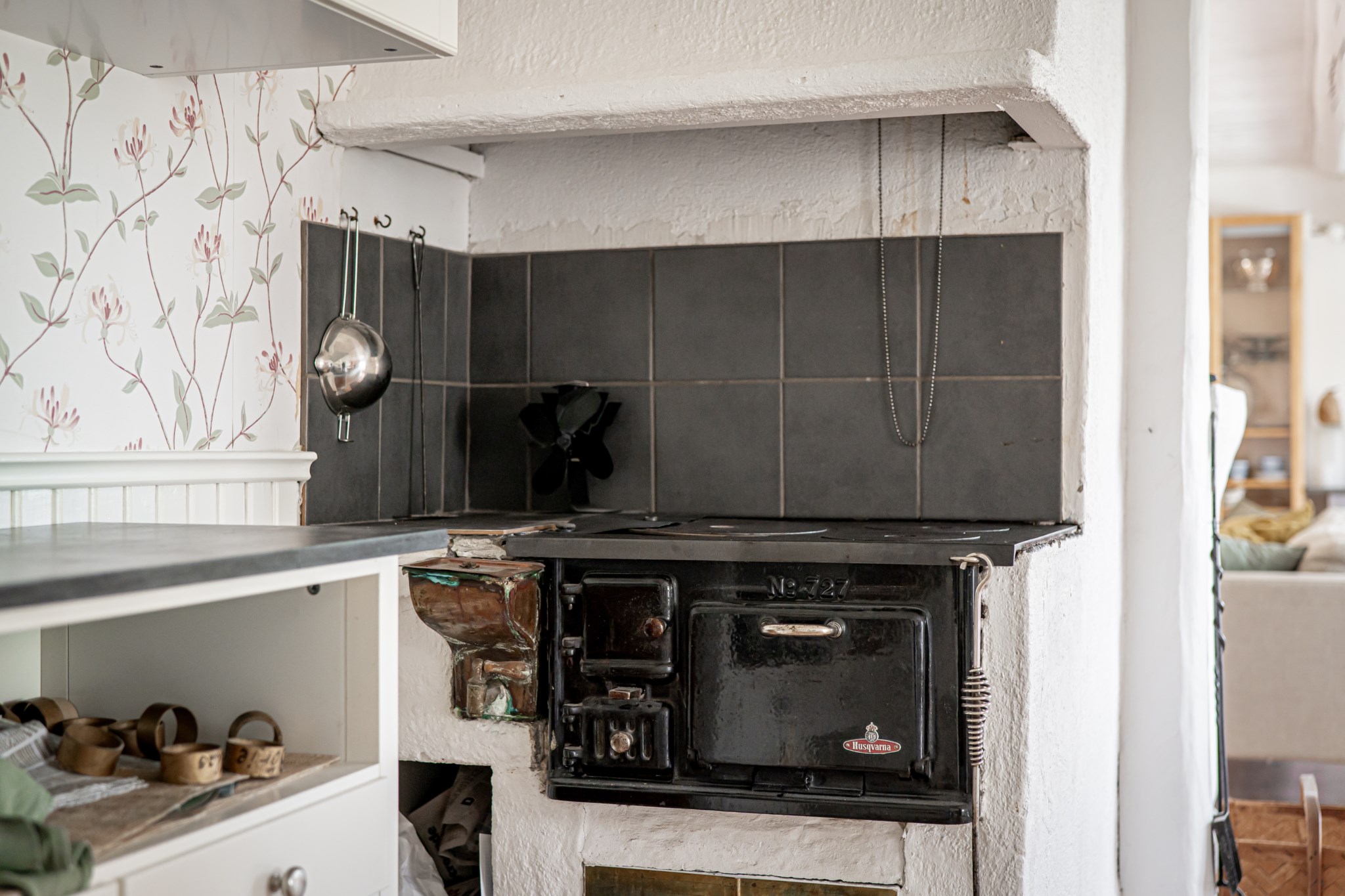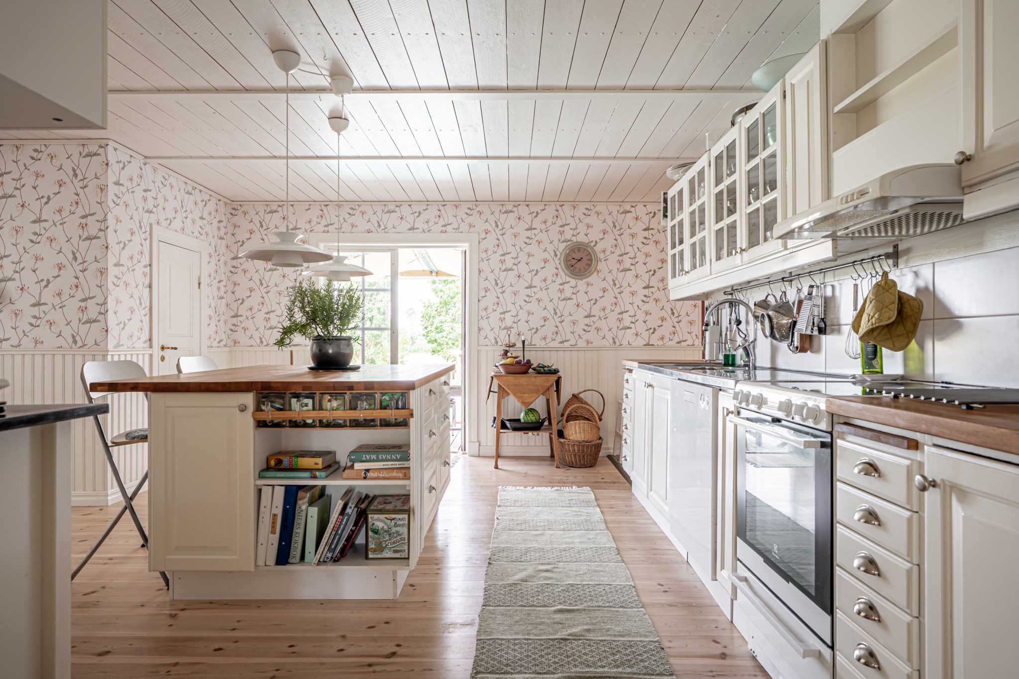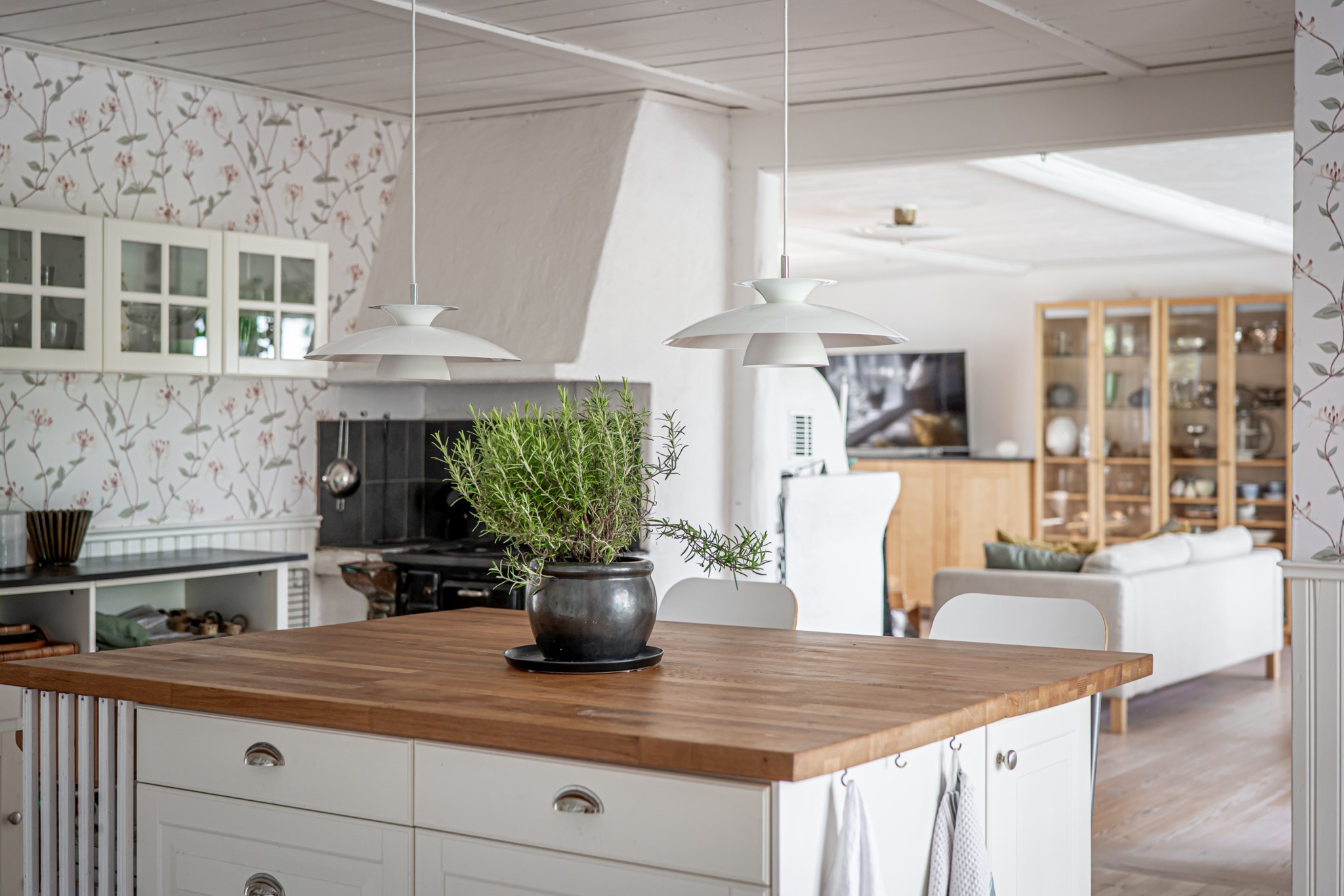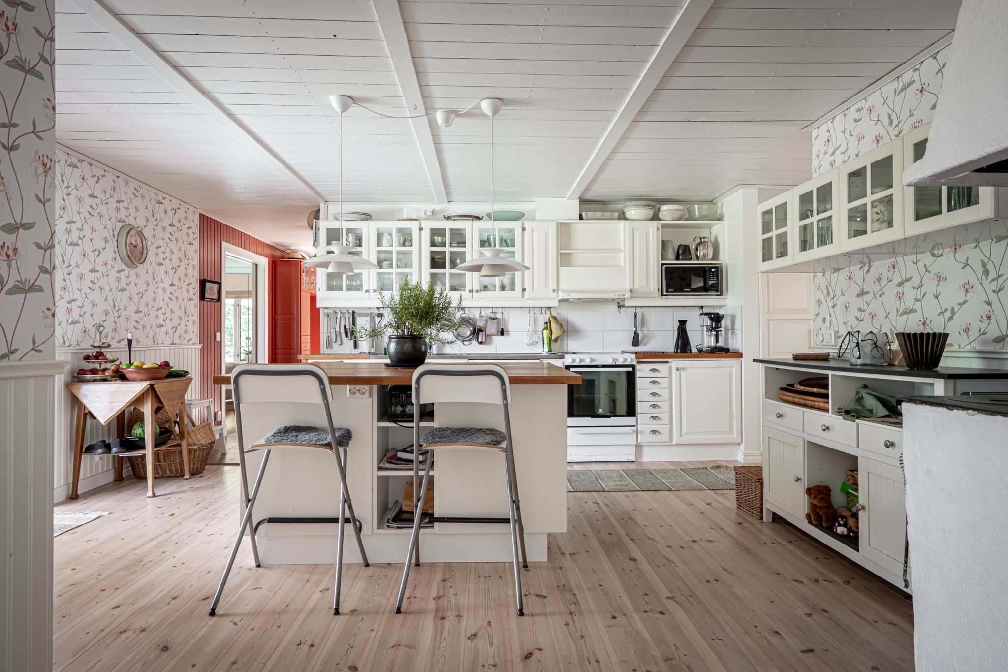 Ett vitt klassiskt kök som delvis byggdes om i samband med tillbyggnaden av huset 2017. Här finns förutom sedvanliga vitvaror även vedspis.