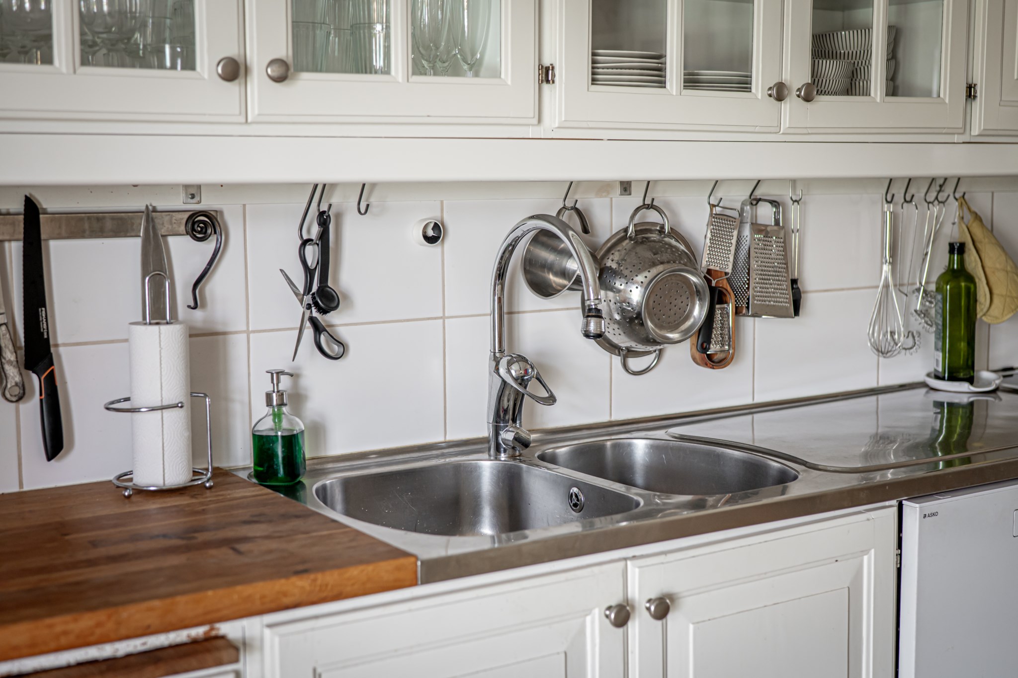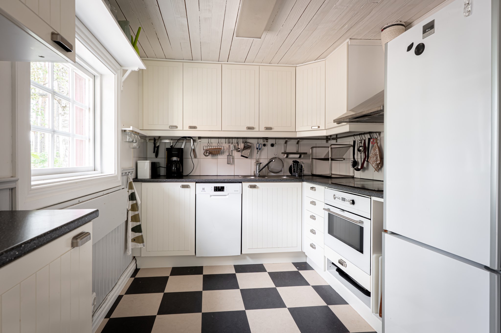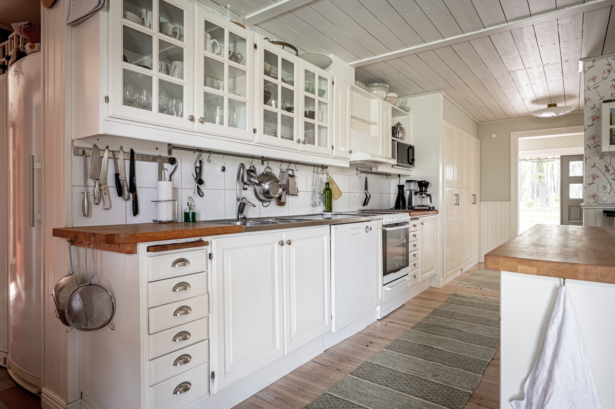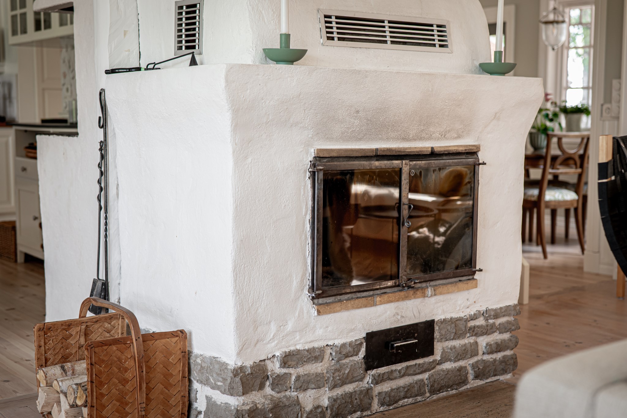 Ett vitt klassiskt kök som delvis byggdes om i samband med tillbyggnaden av huset 2017. Här finns förutom sedvanliga vitvaror även vedspis.