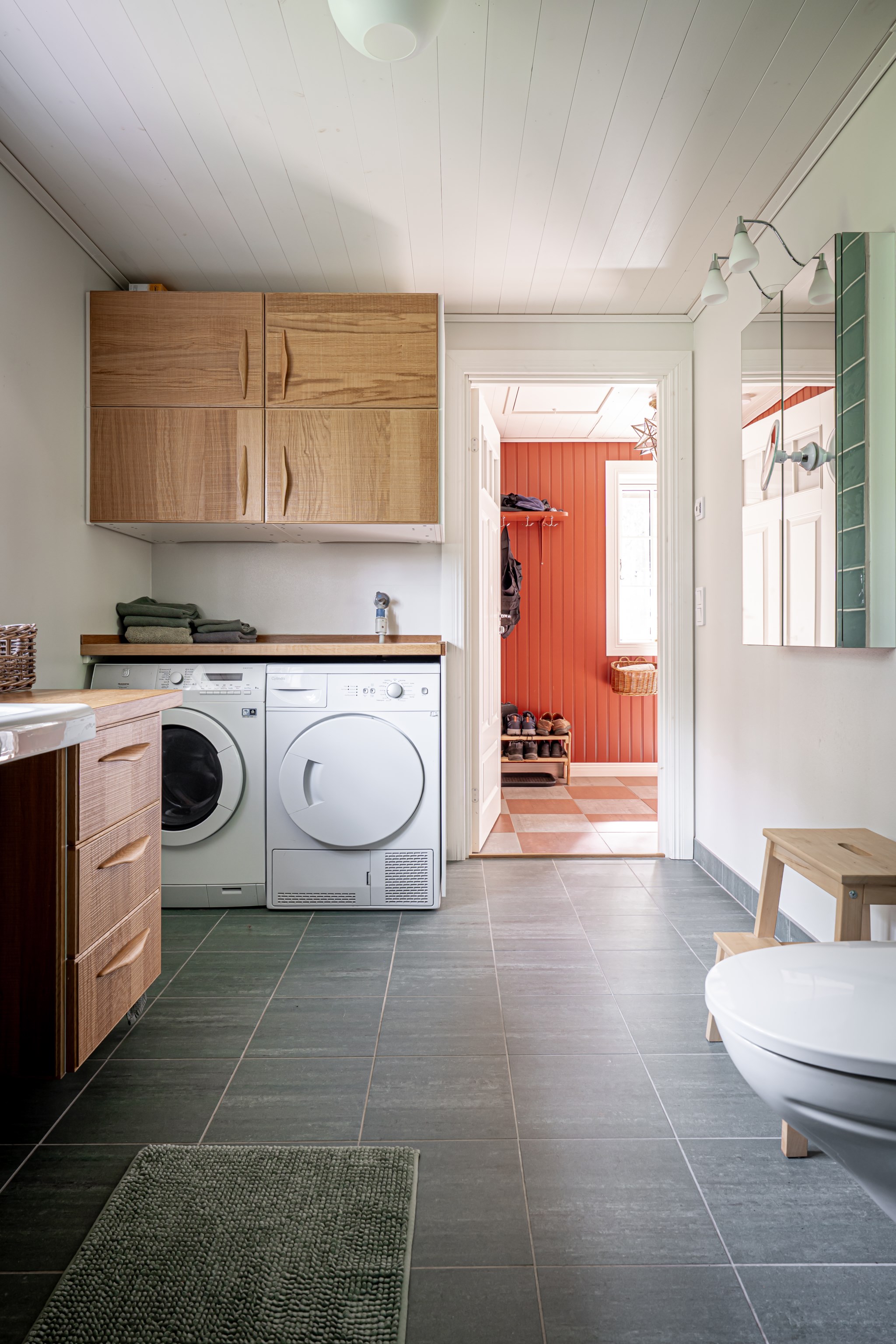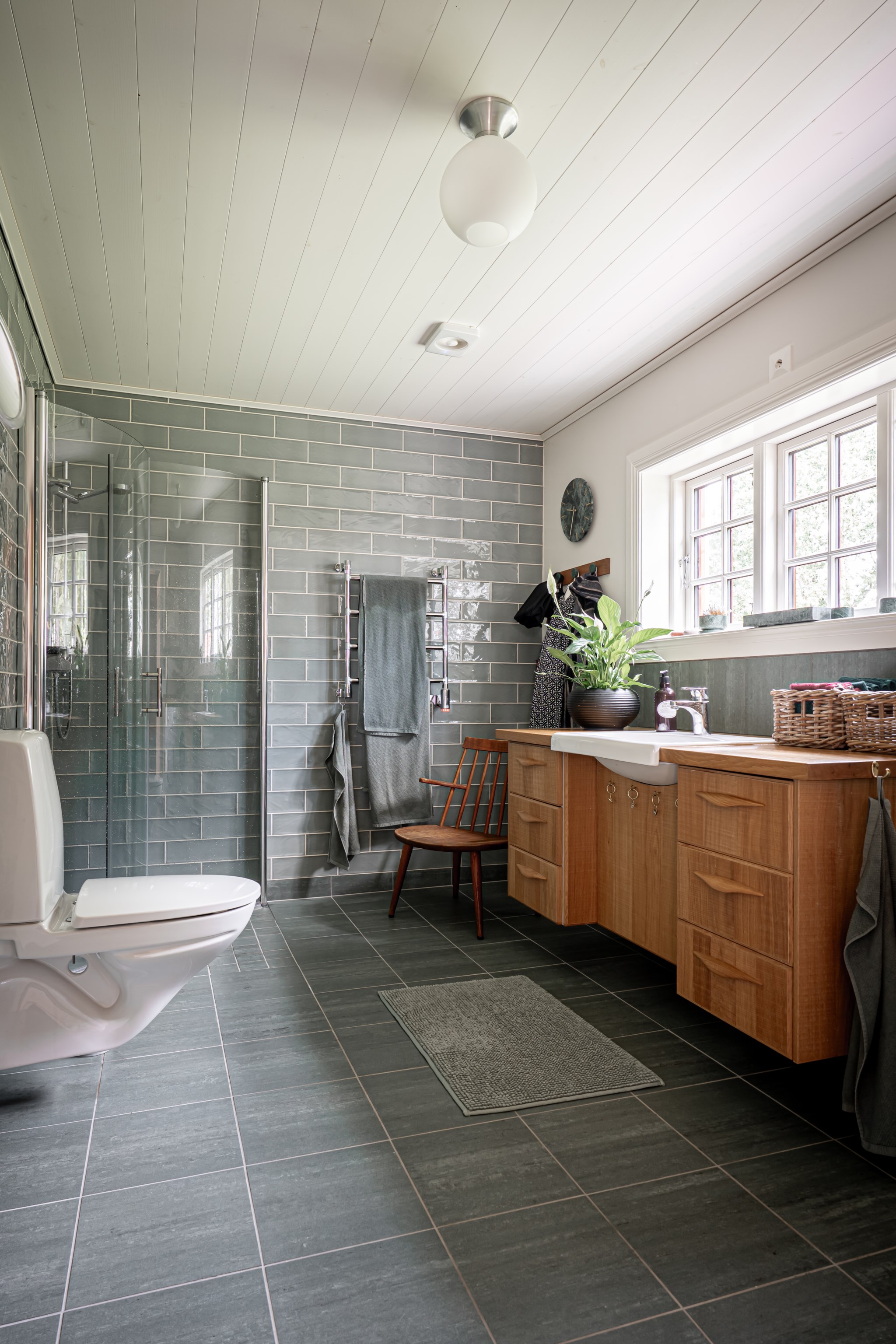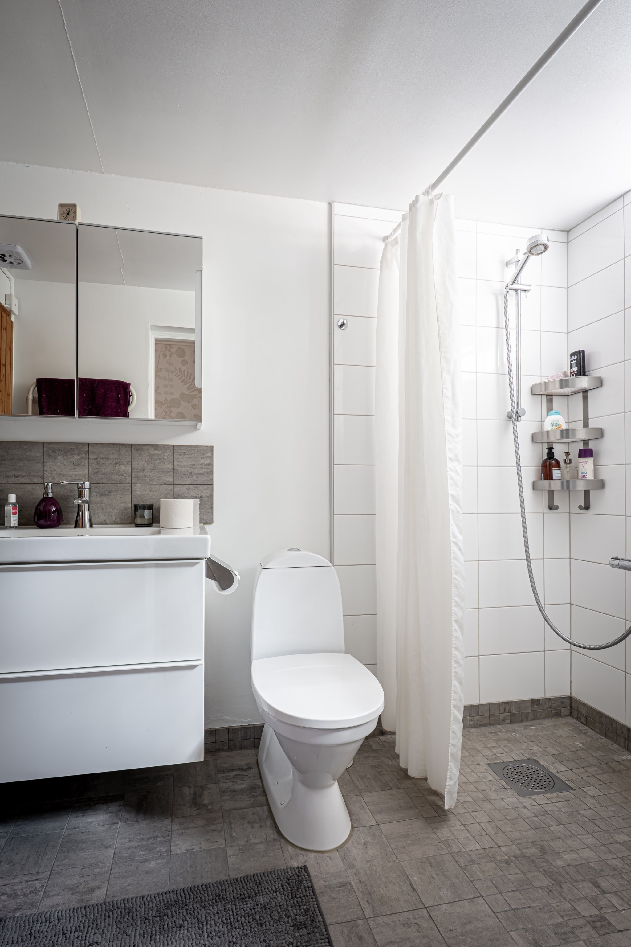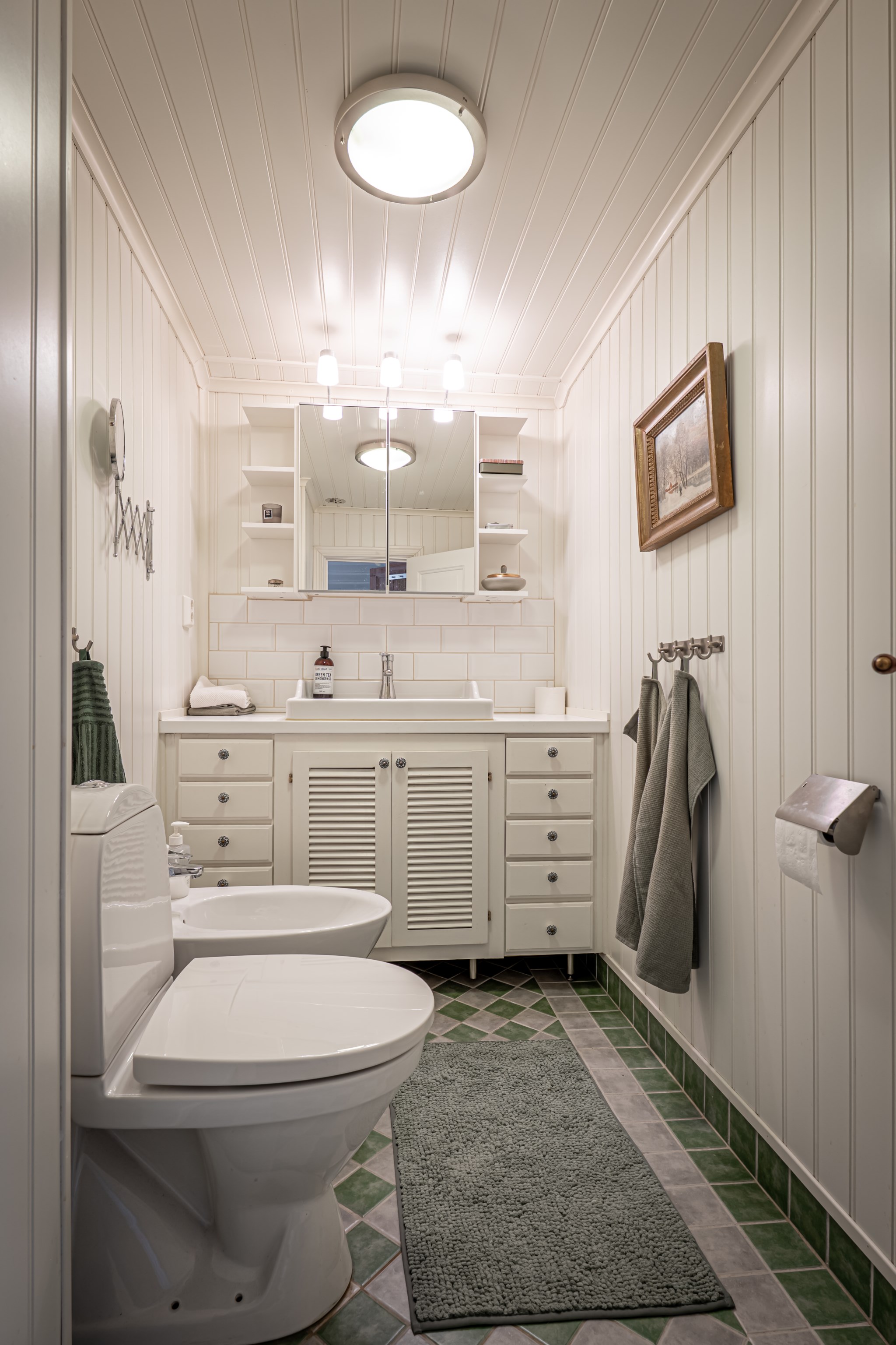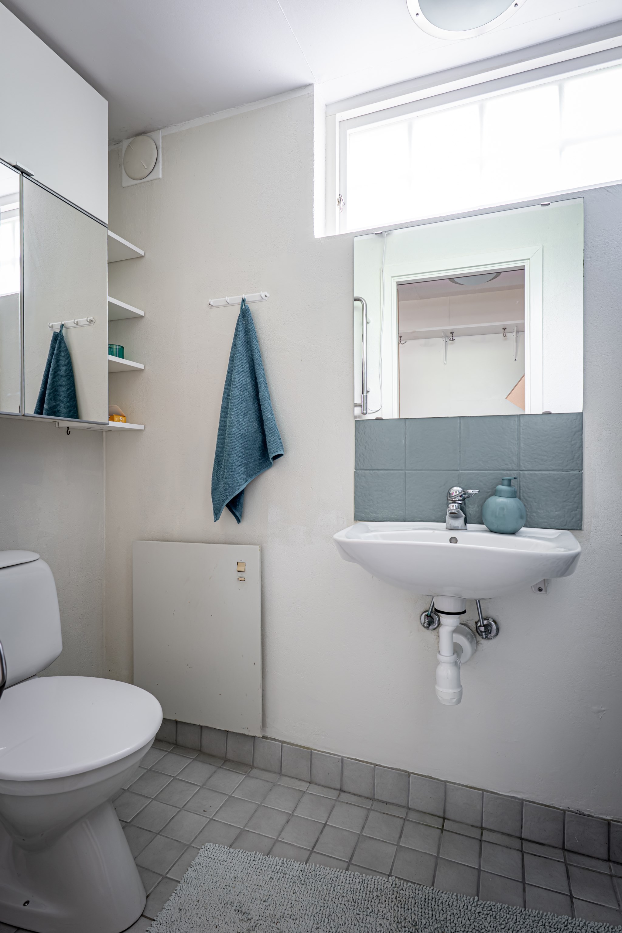 Badrum/WC 1: Stort badrum i tillbyggnaden från 2017, helkaklat med golvvärme, dusch, wc, stor tvättställs kommod samt handdukstork. Här ryms även tvättavdelning med tvättmaskin och torktumlare samt skåpsinrede. Badrum/WC 2: En trappa upp ligger ett wc med klinkergolv (golvvärme) och träpanel på väggarna , Wc, bidé samt tvättställskommod (ytskikt renoverade 2014). Badrum/WC 3: Är beläget i källarplan med kakel och klinker renoverat 2014 med dusch, wc samt bastuavdelning.