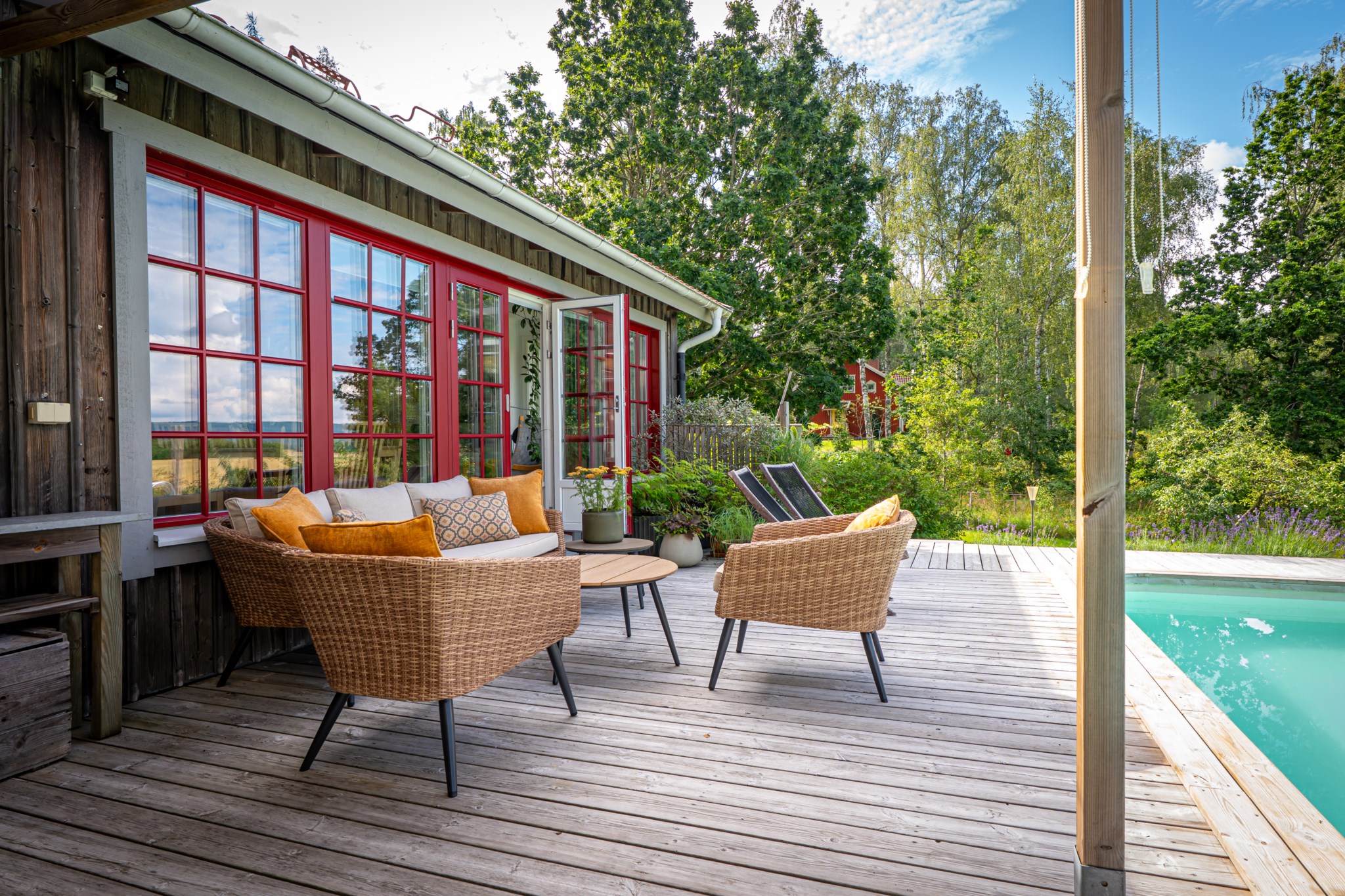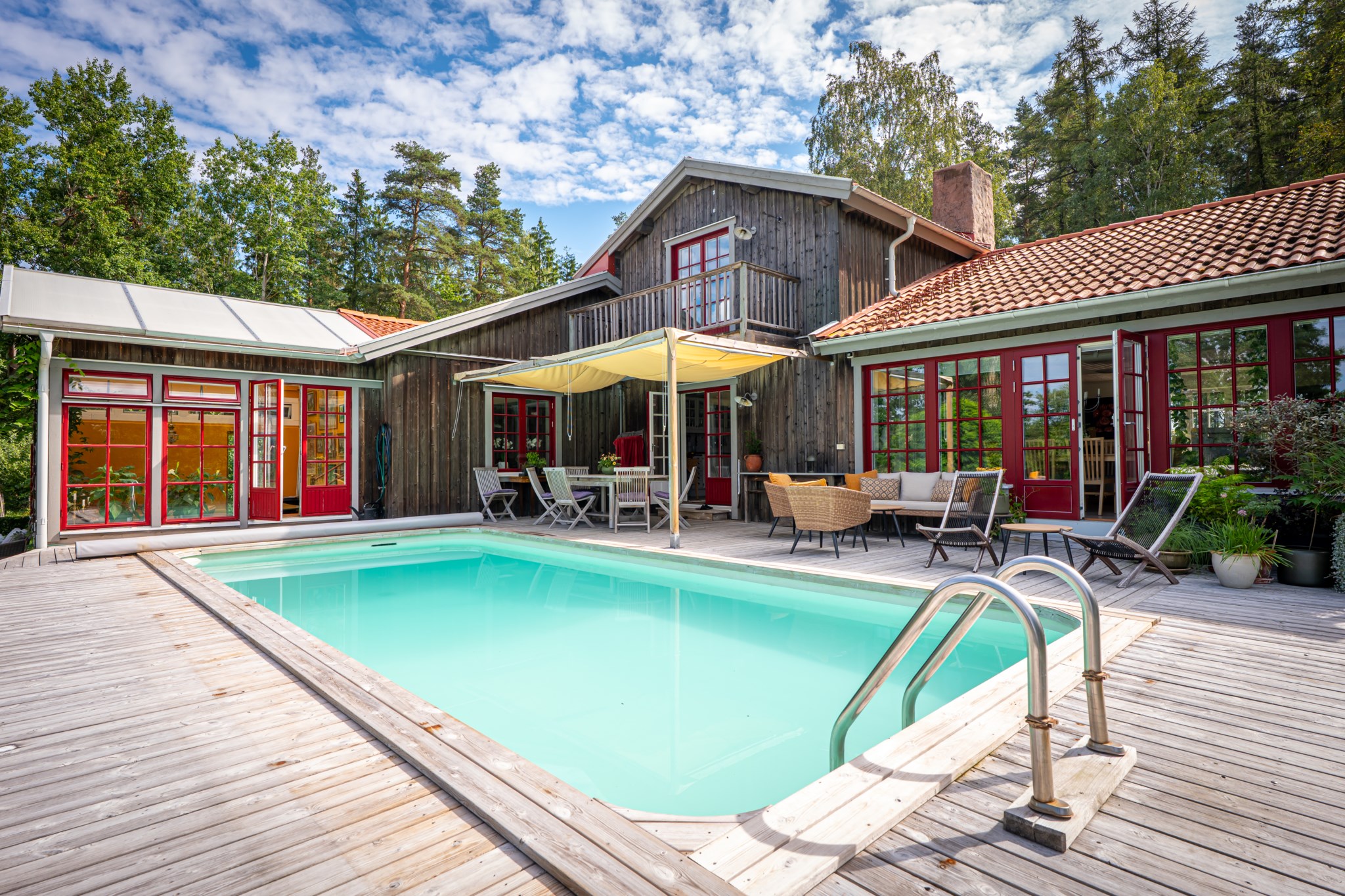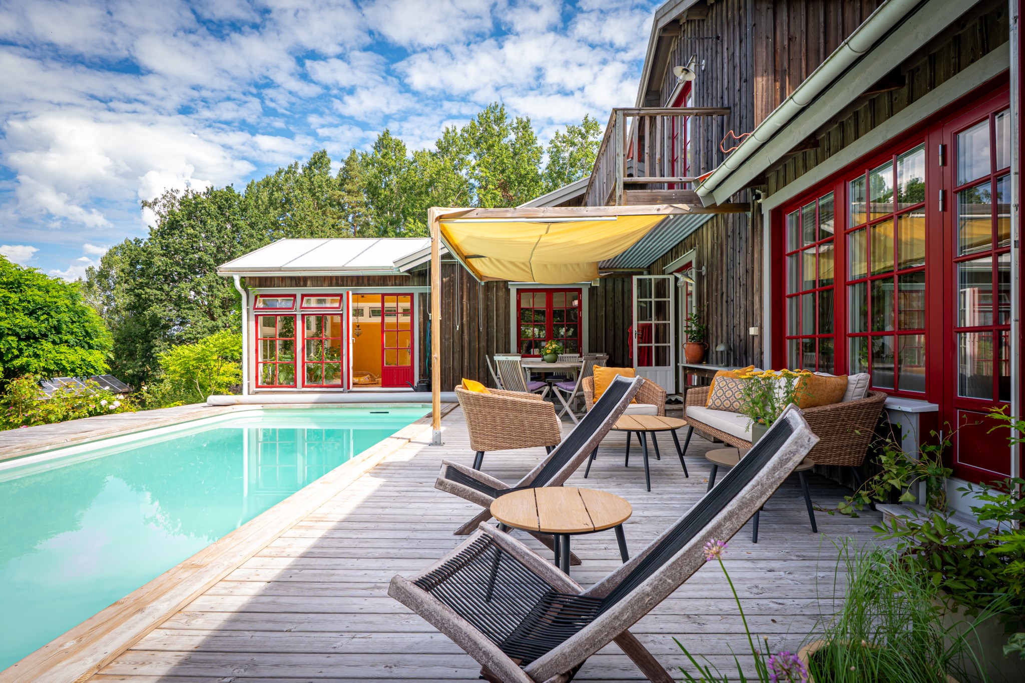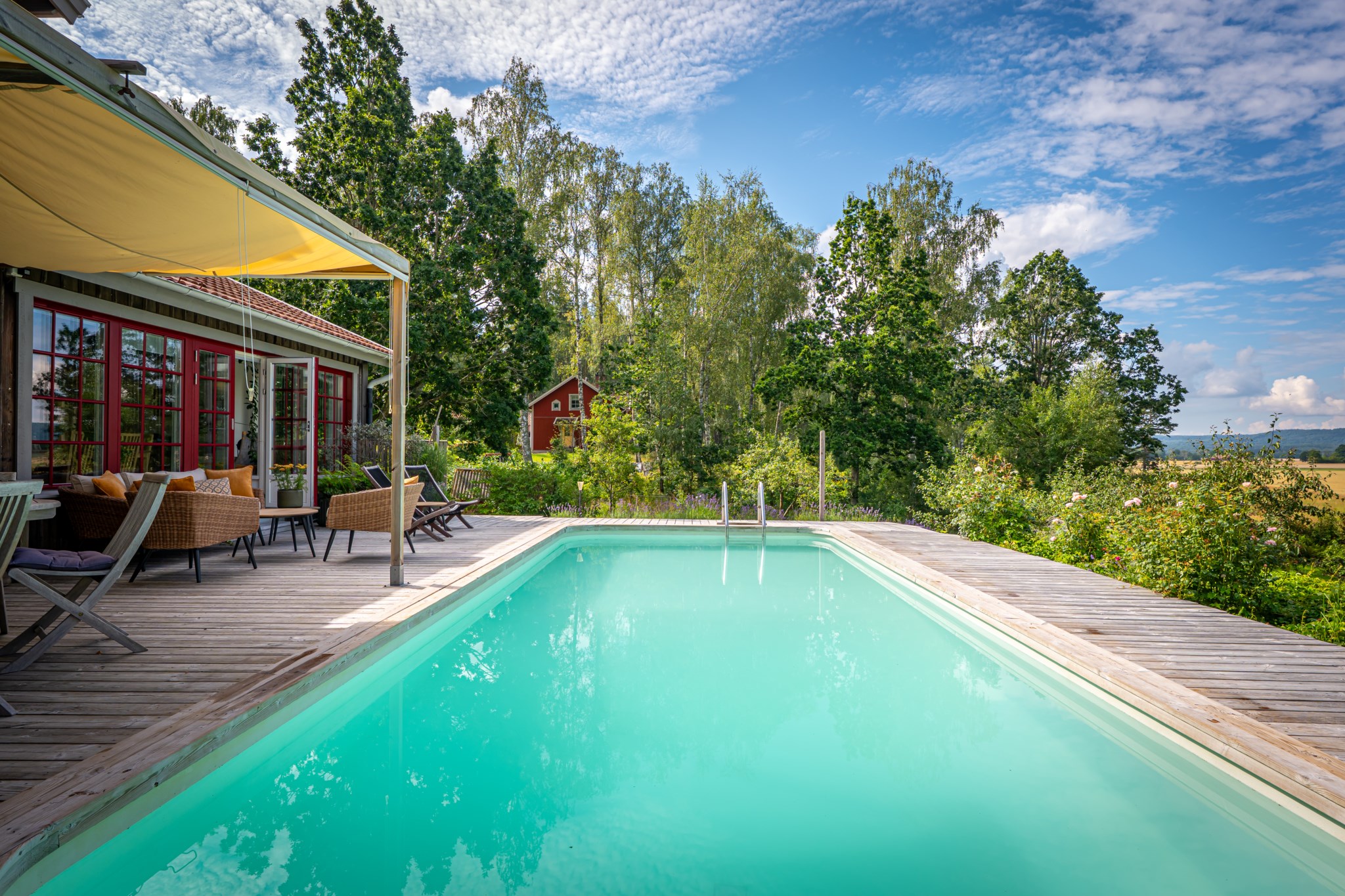 På den stora soliga terrassen ligger den platsgjutna poolen om 4x8 meter med ett djup på 1,8 m där det är som djupast. Filter och värmare är placerade i källaren.