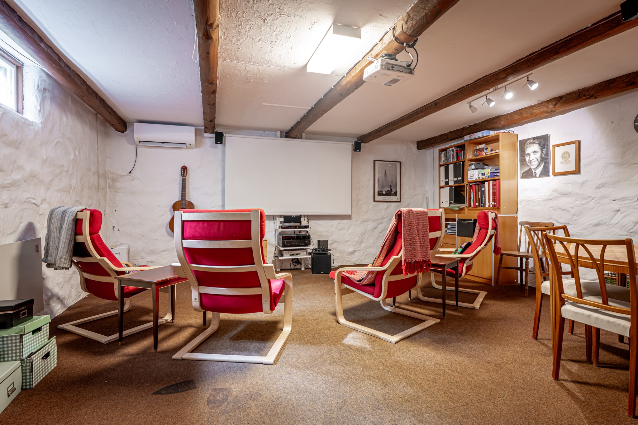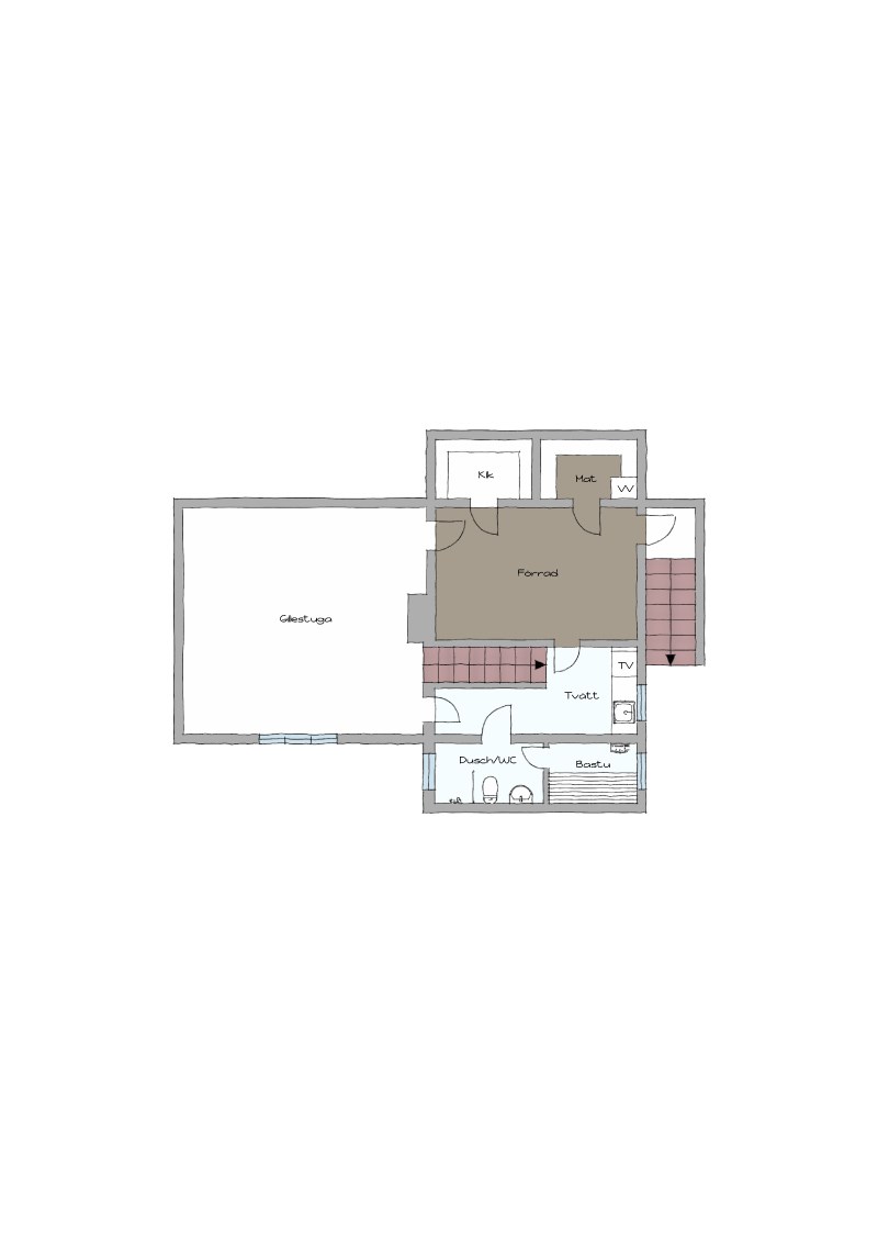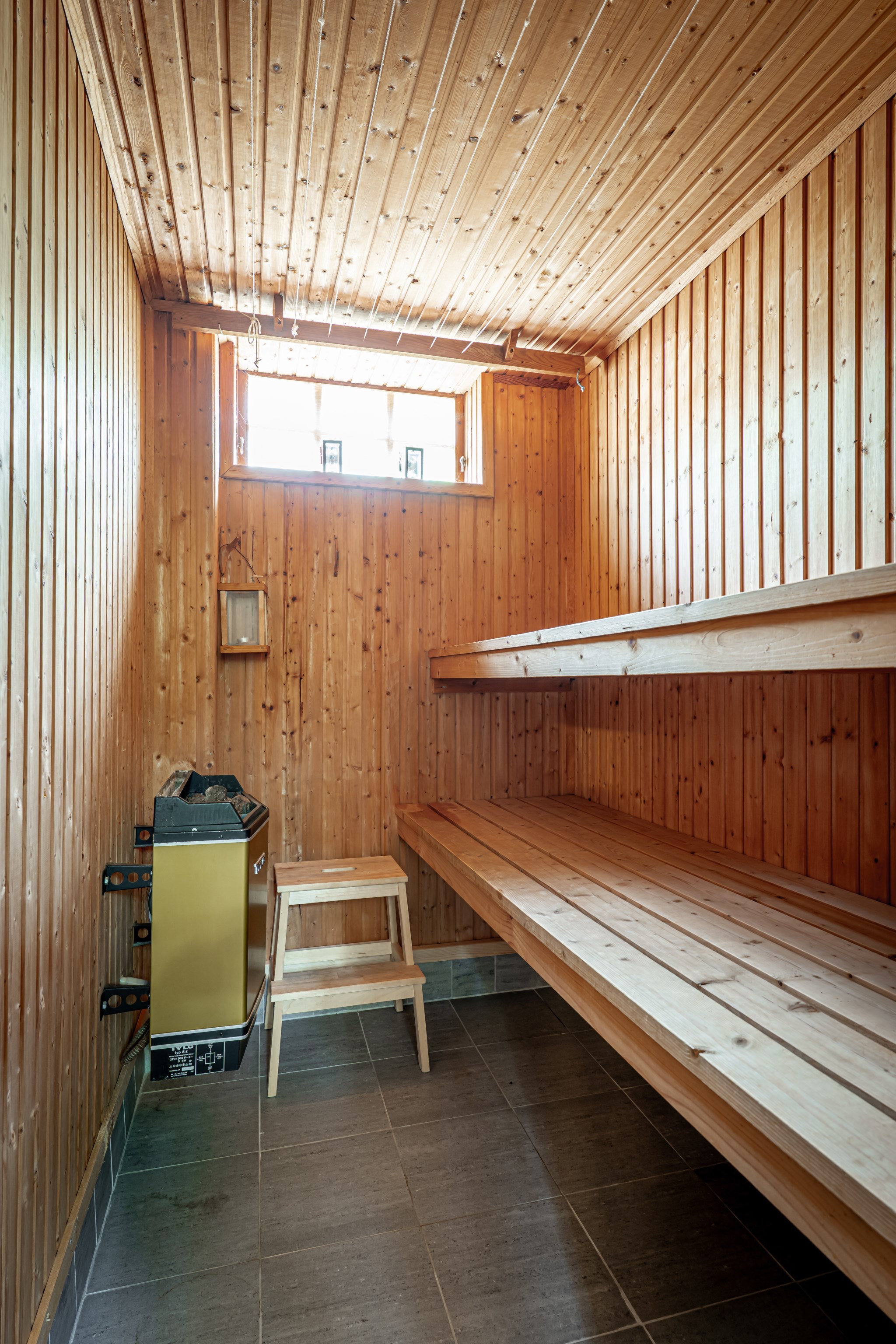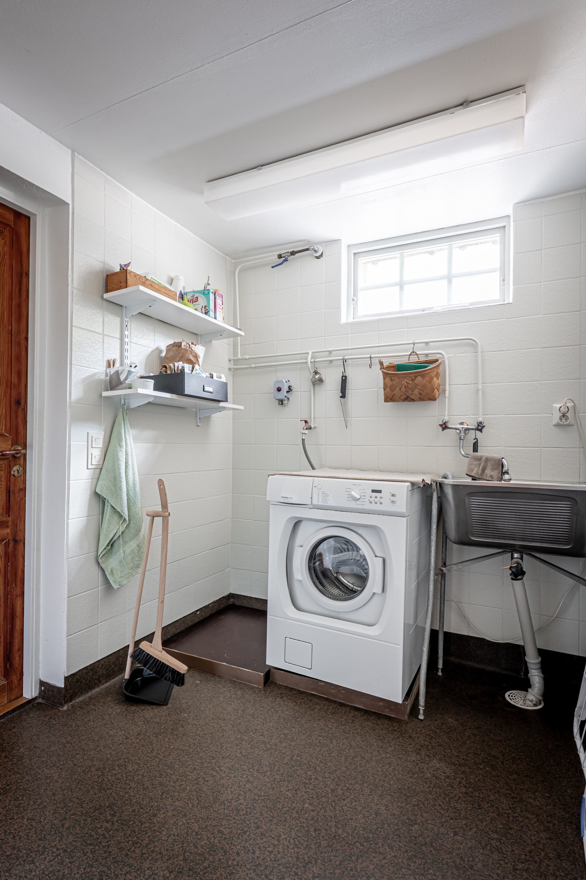Källare under del av huset med gillestuga med öppen spis, tvättstuga med tvättmaskin, badrum med bastu, förrådsutrymmen och matkällare.