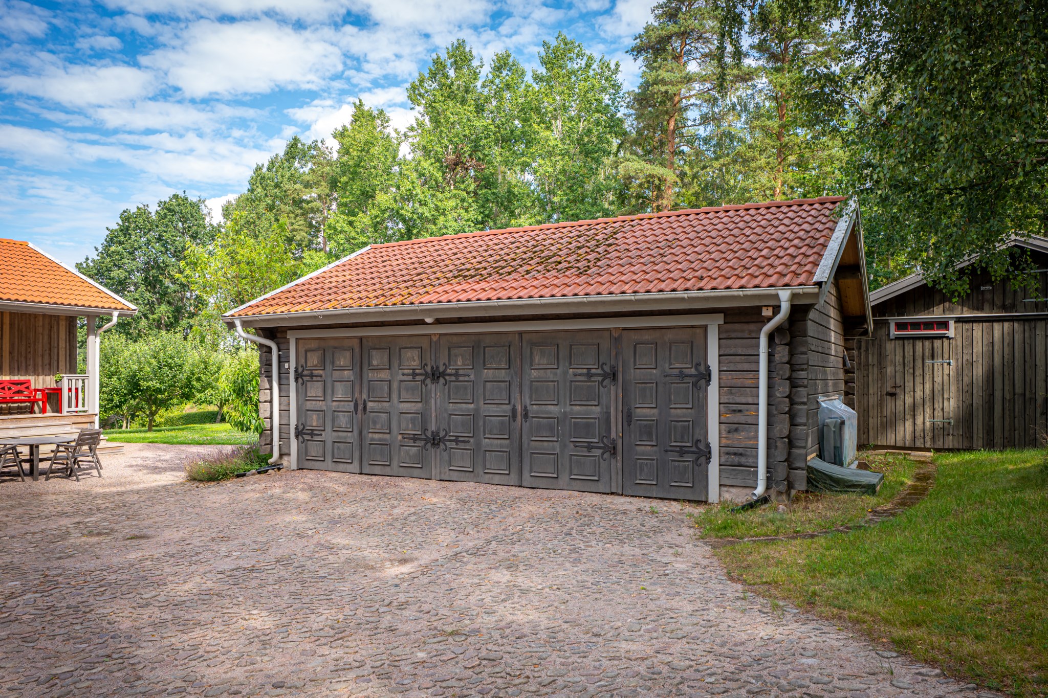 I den andra flygeln kring gårdsplanen mittemot gästhuset ligger det timrade dubbelgaraget med platta på mark under tegeltak, ca 40 kvm kallgarage.