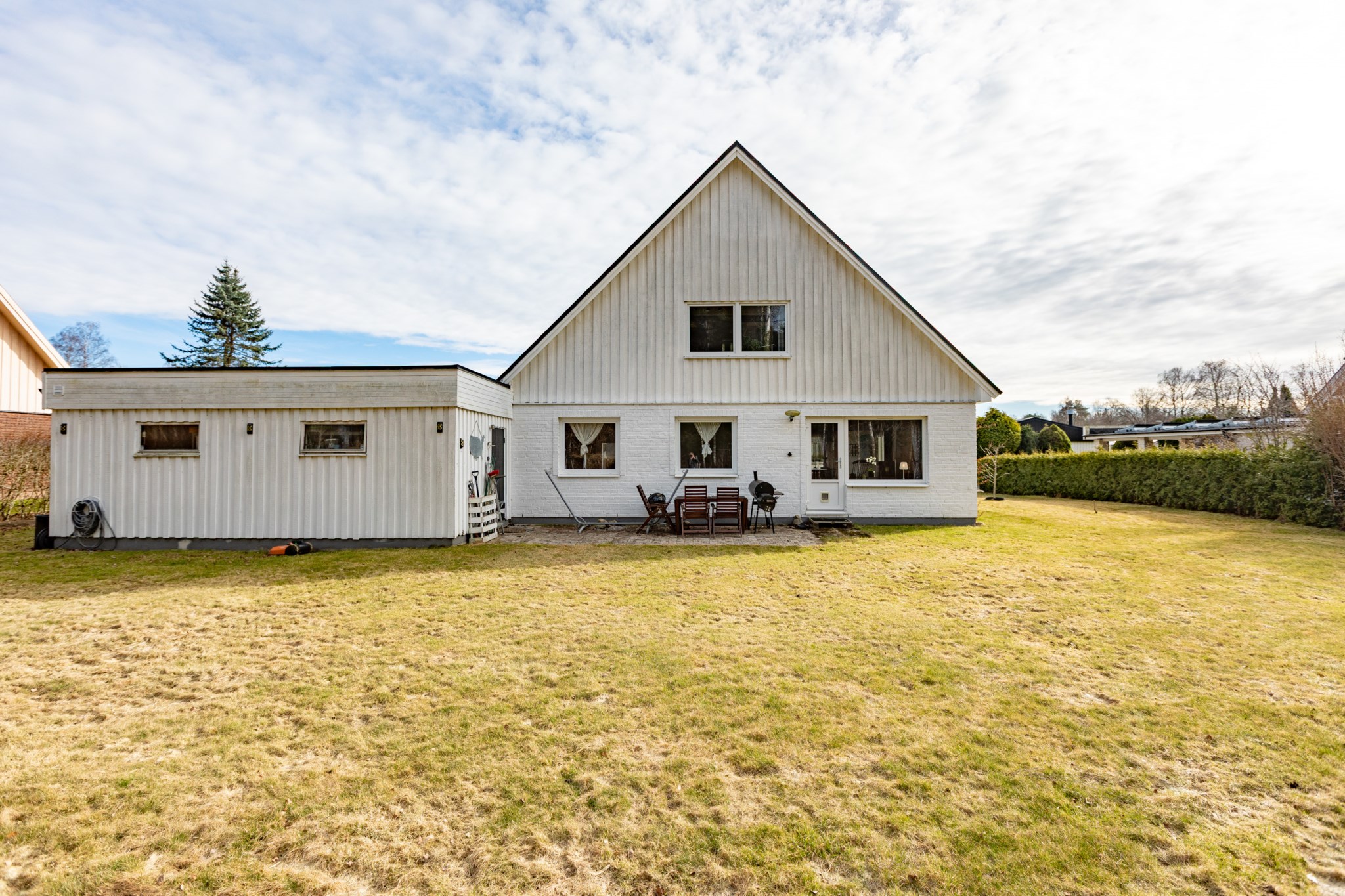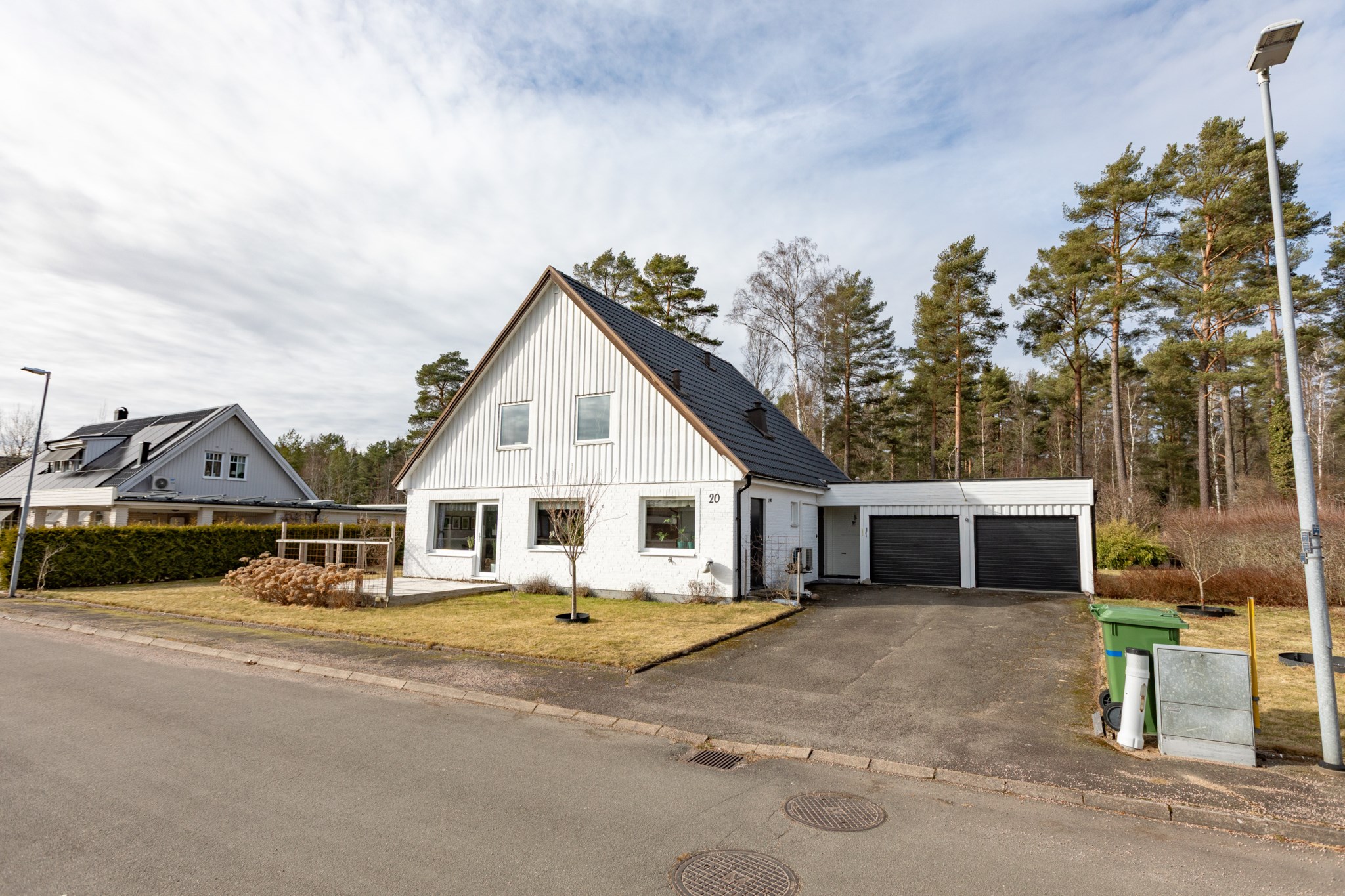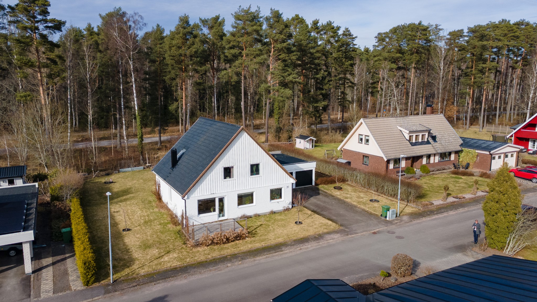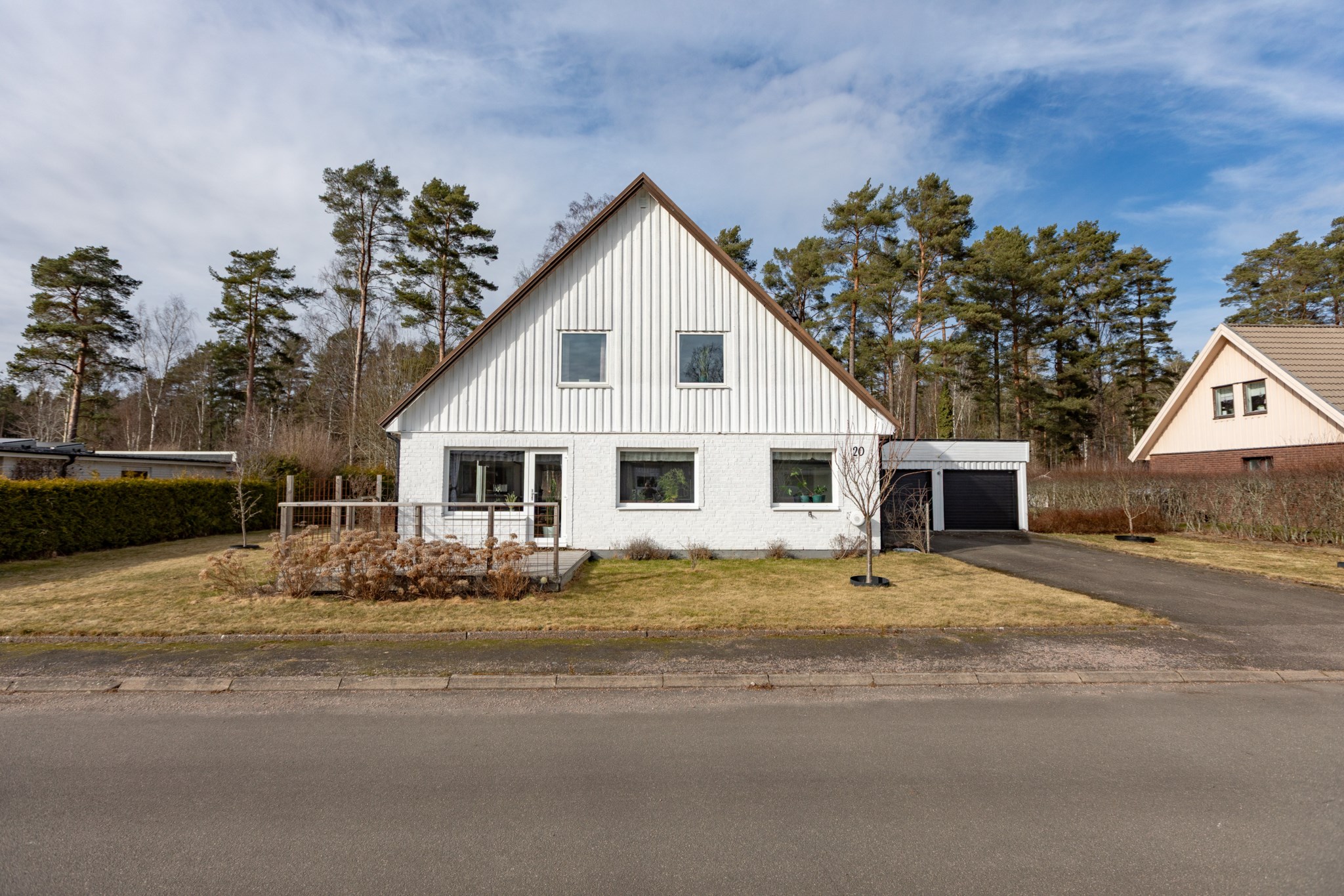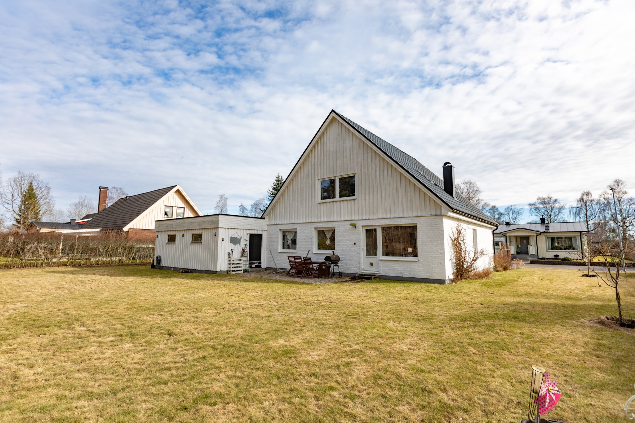 Bostadshuset är en friliggande 1½-plansvilla med tillbyggt dubbelgarage och förrådsdel. Tomten är generös och lättskött med plana gräsytor, insynsskyddad baksida och två uteplatser – en på framsidan och en på baksidan.