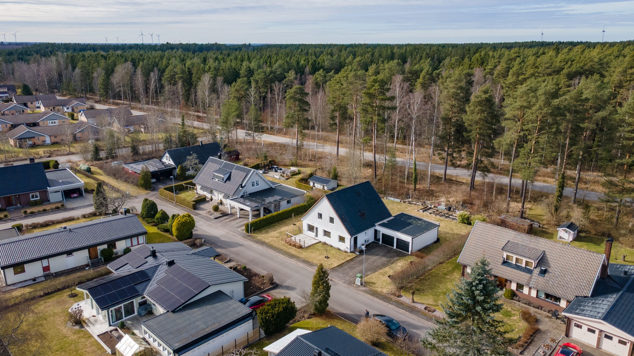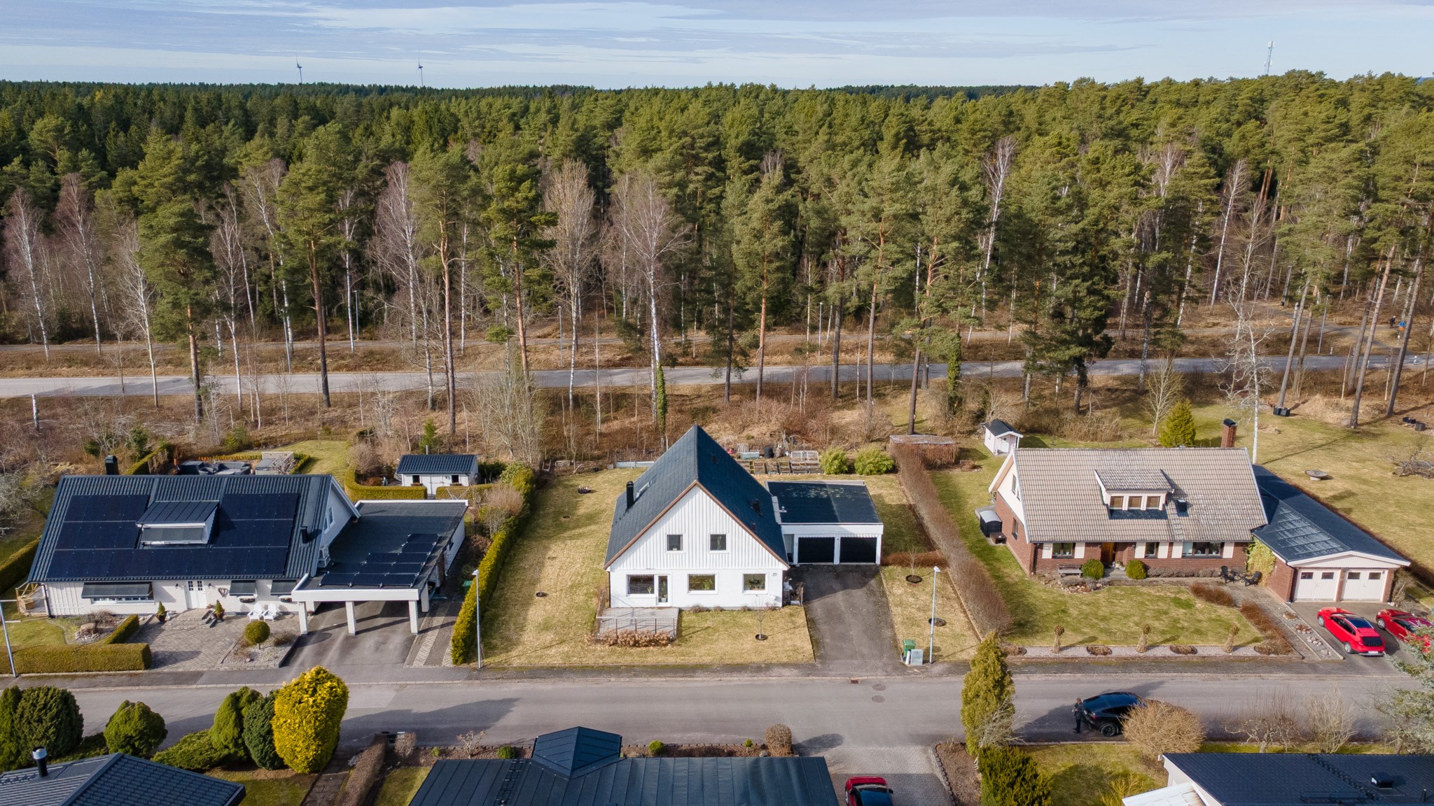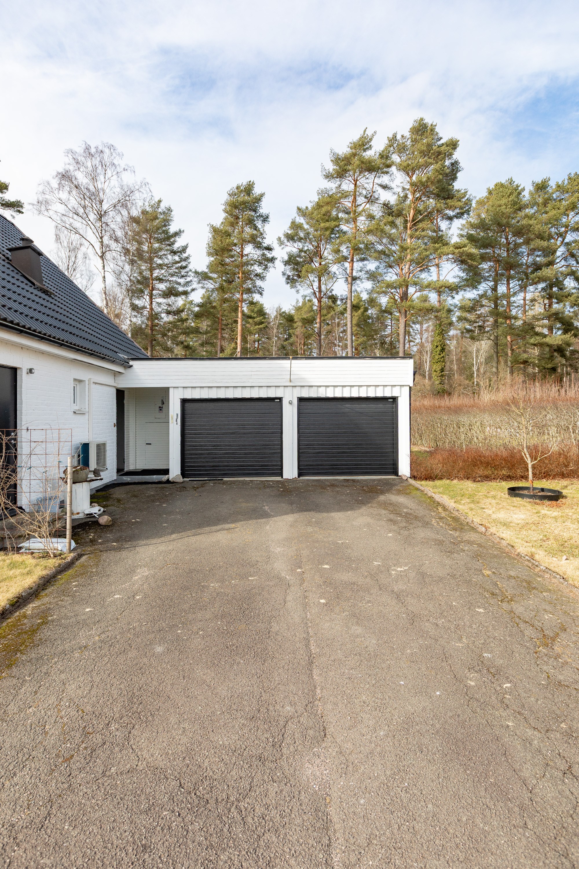 Uppfarten är asfalterad med plats för flera bilar, och i direkt anslutning till huset finns deubbelgaraget med separat ingång mot trädgårdssidan.