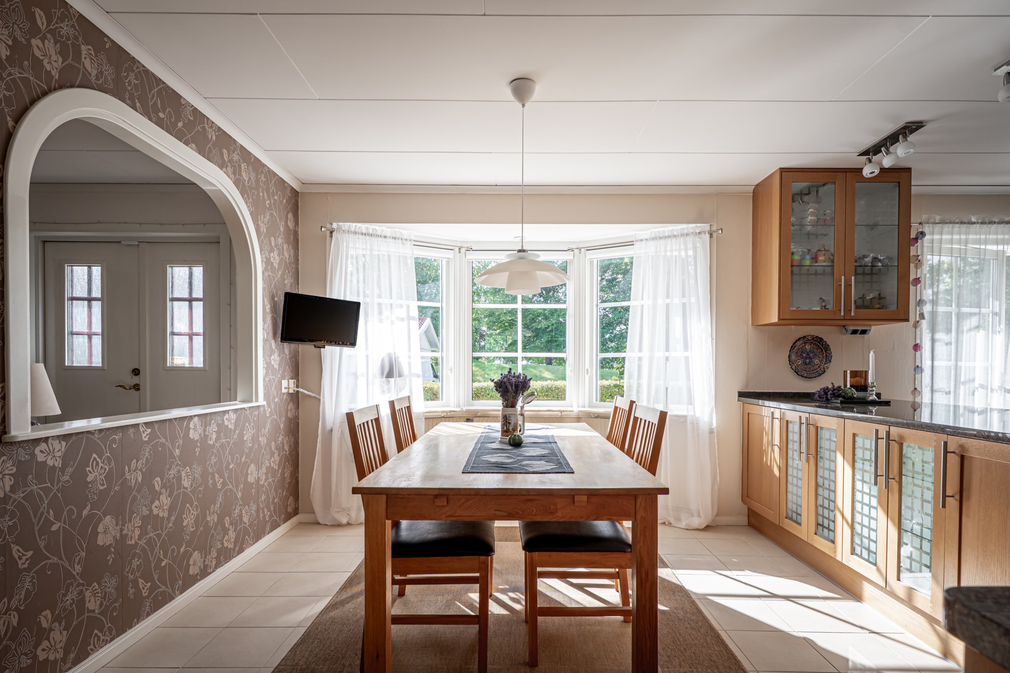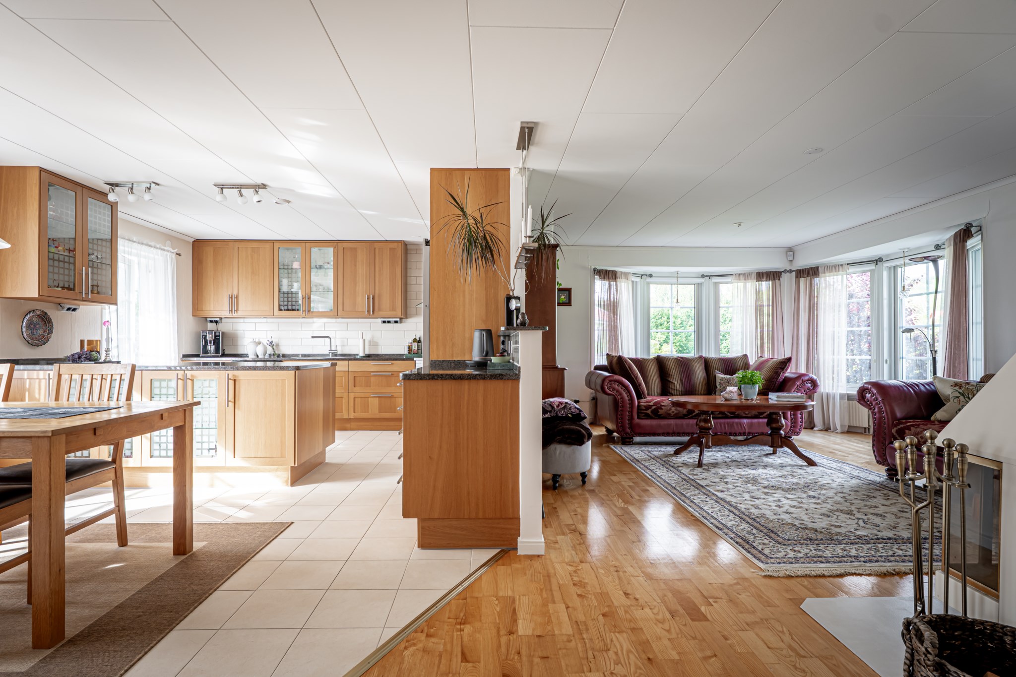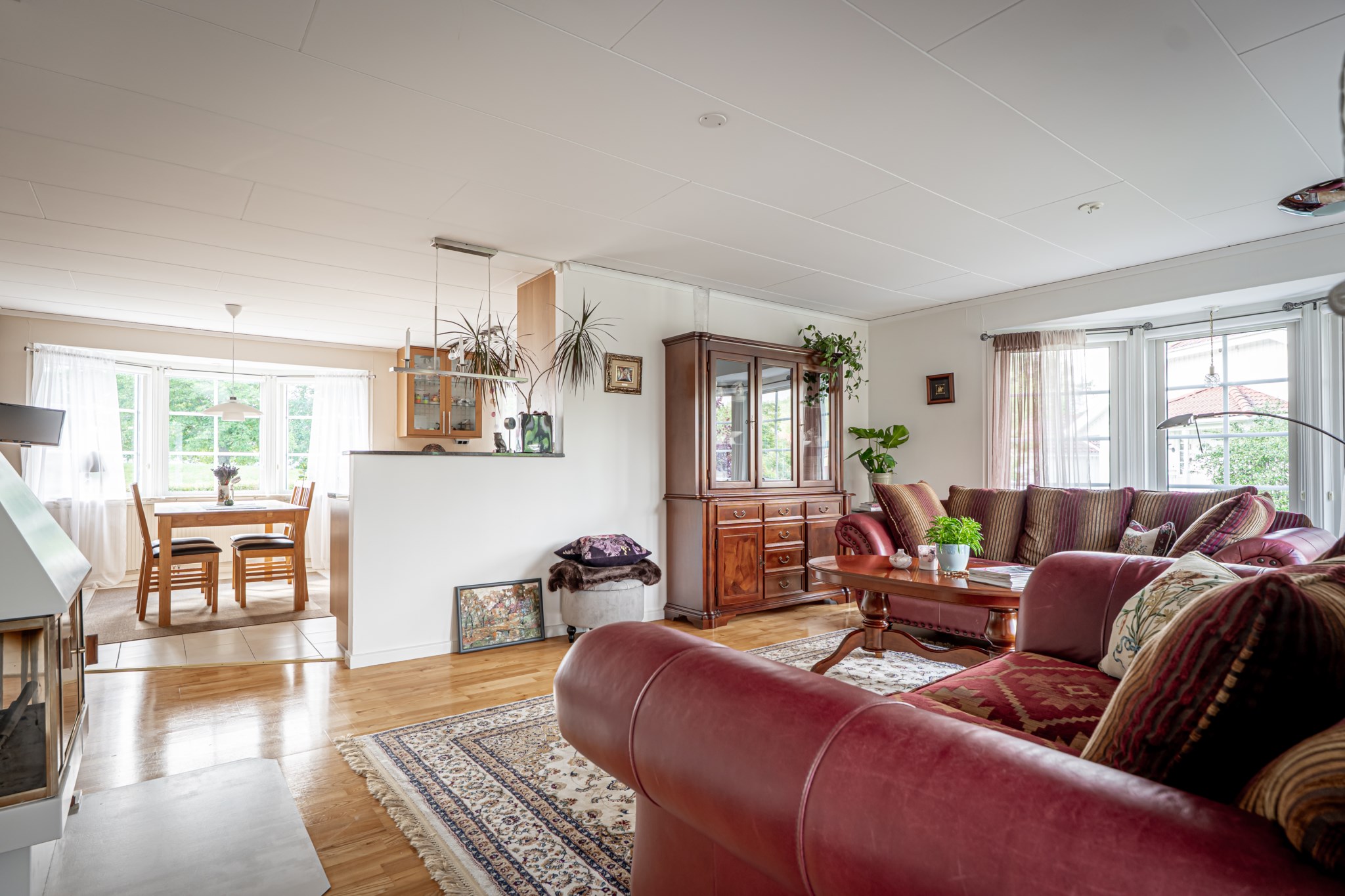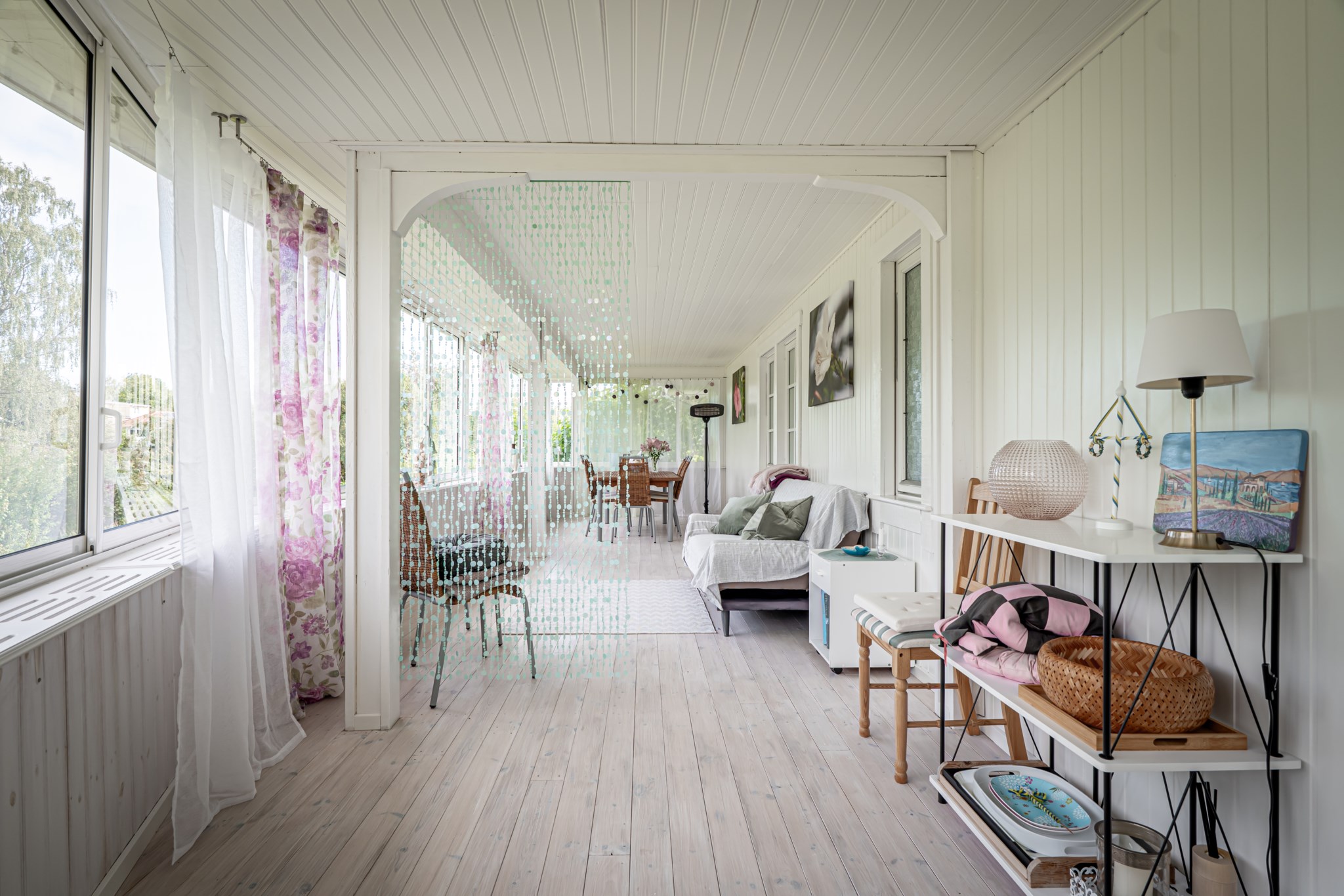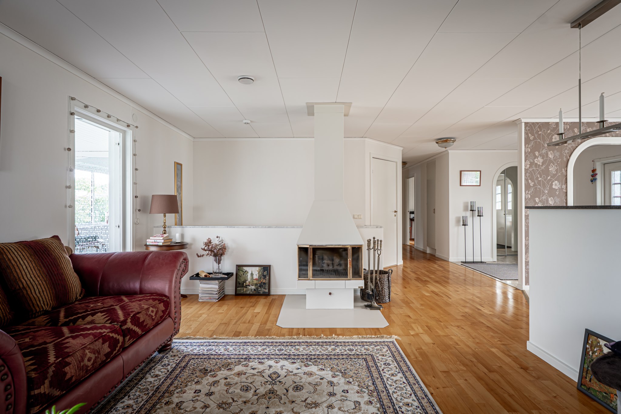 Vidare från köket i en öppen planlösning ligger vardagsrummet med eldstad samt utgång till det inglasade stora uterummet som används som sällskapsyta stor del av året.