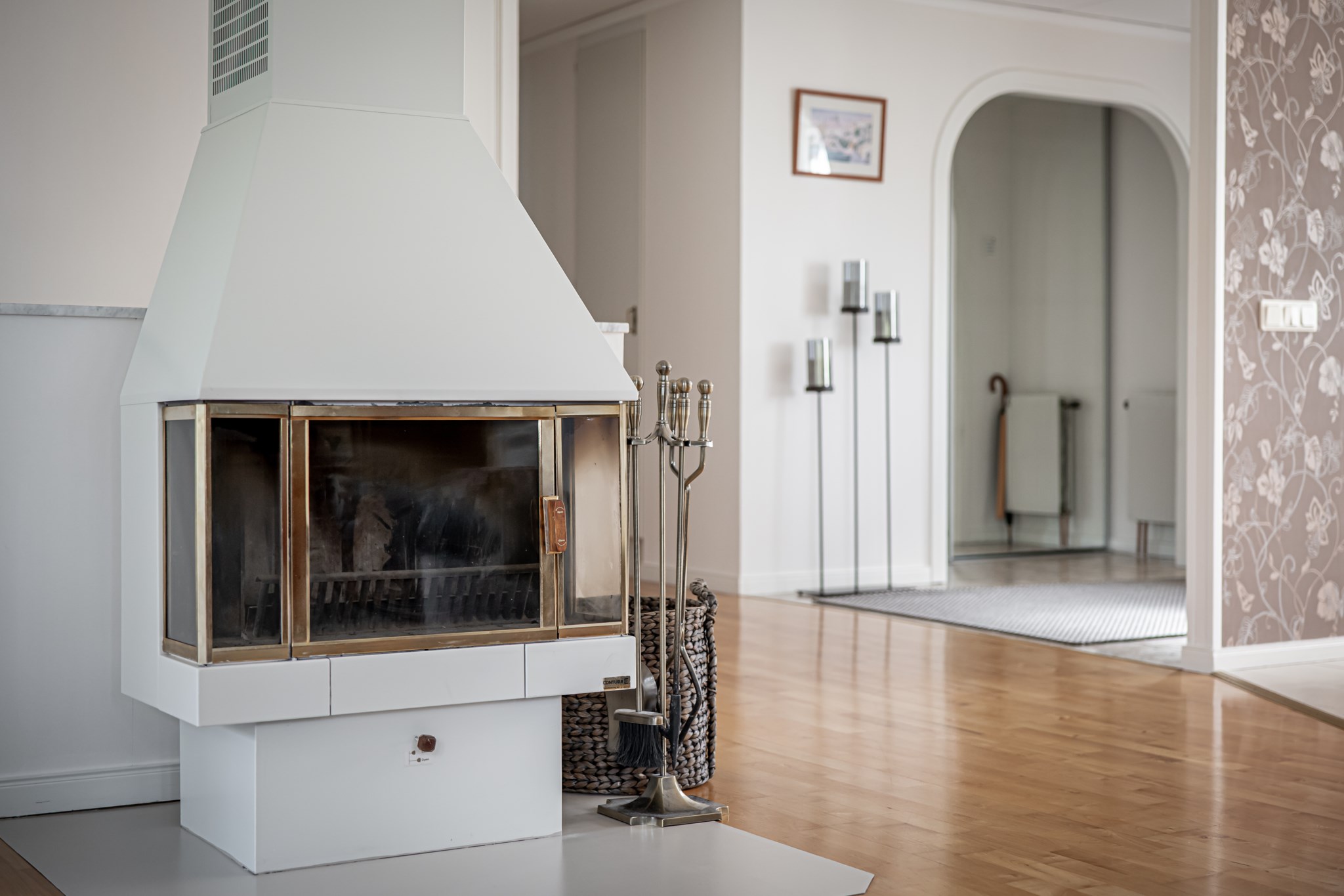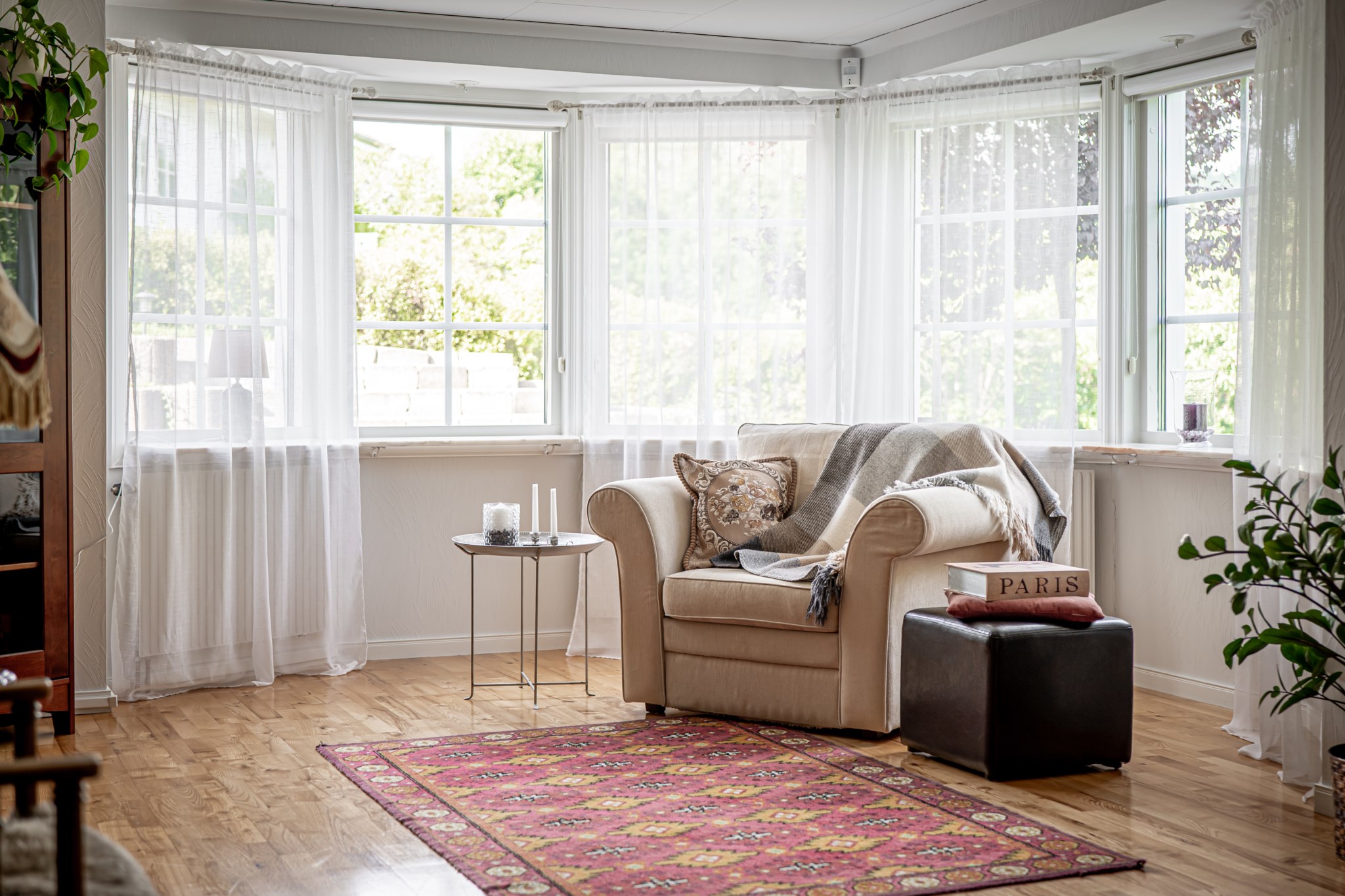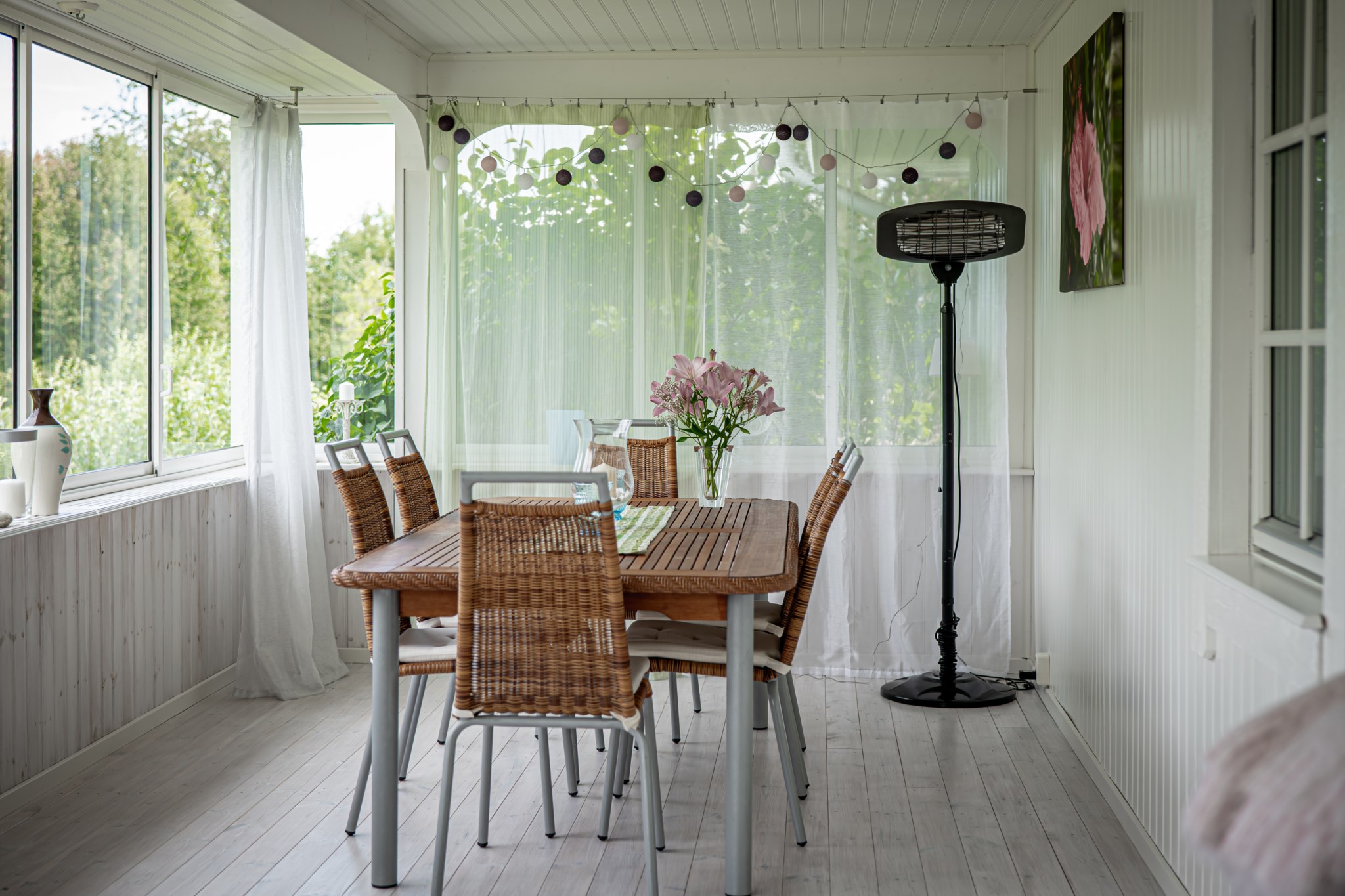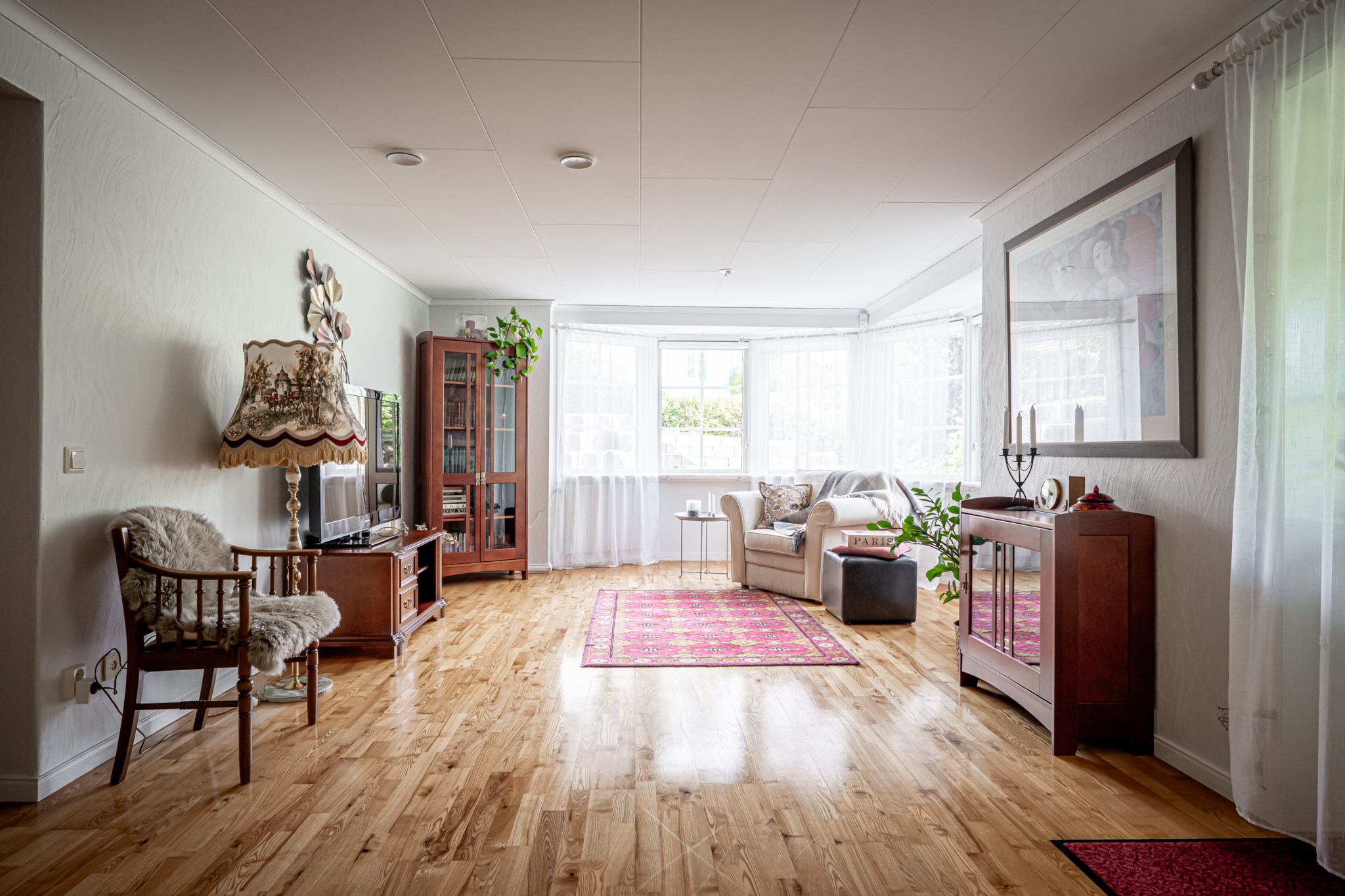 Vidare från köket i en öppen planlösning ligger vardagsrummet med eldstad samt utgång till det inglasade stora uterummet som används som sällskapsyta stor del av året.