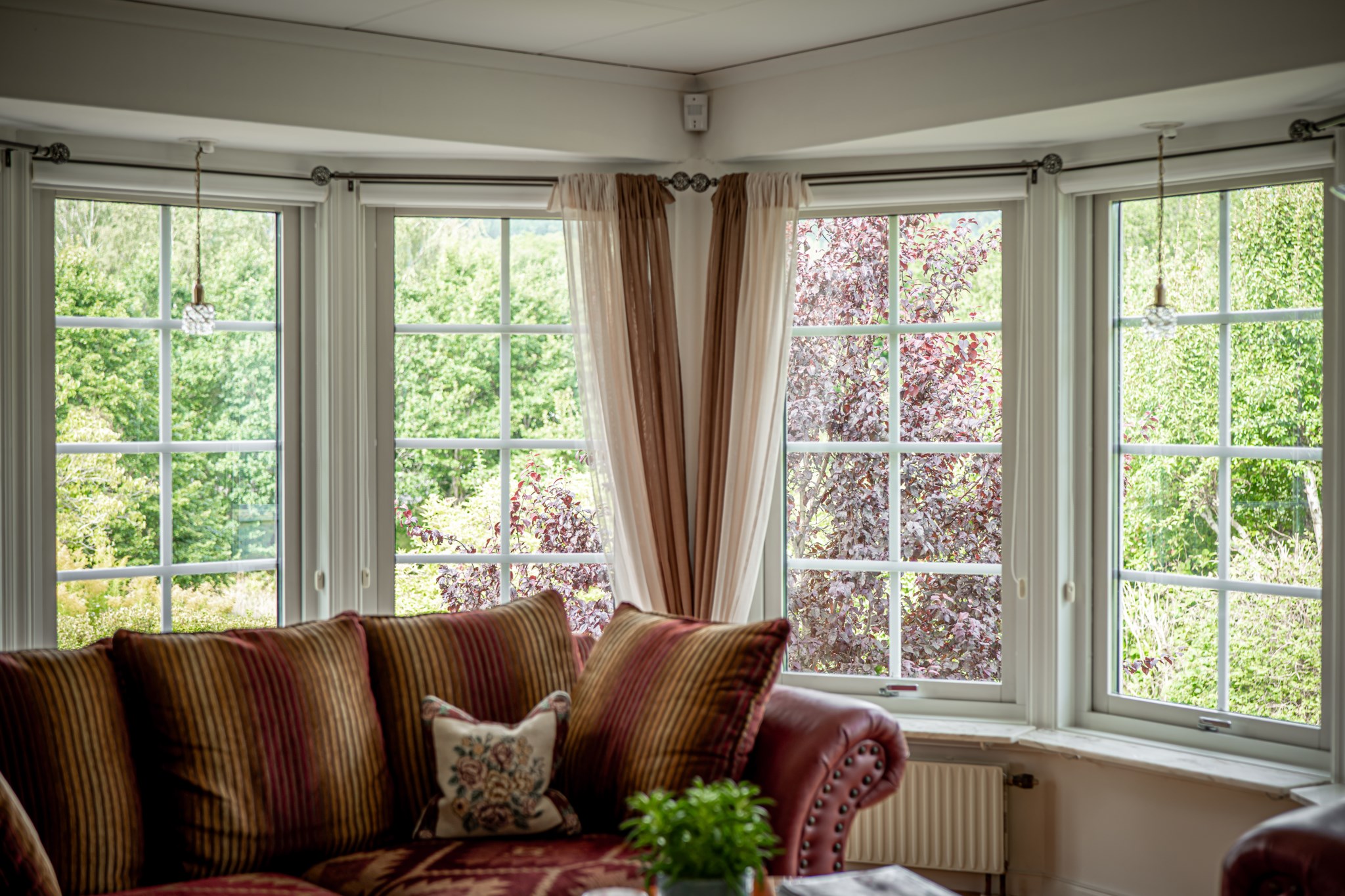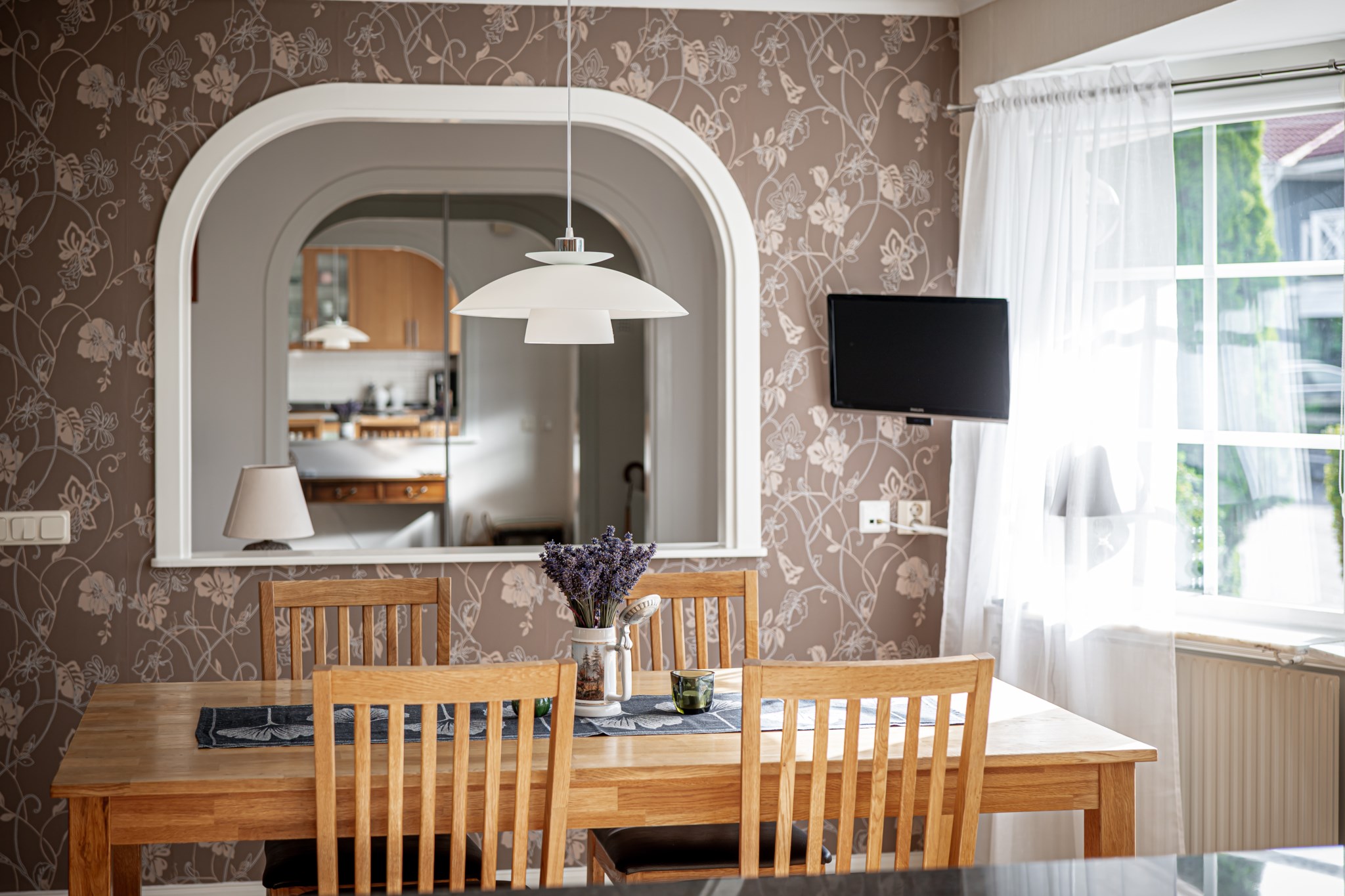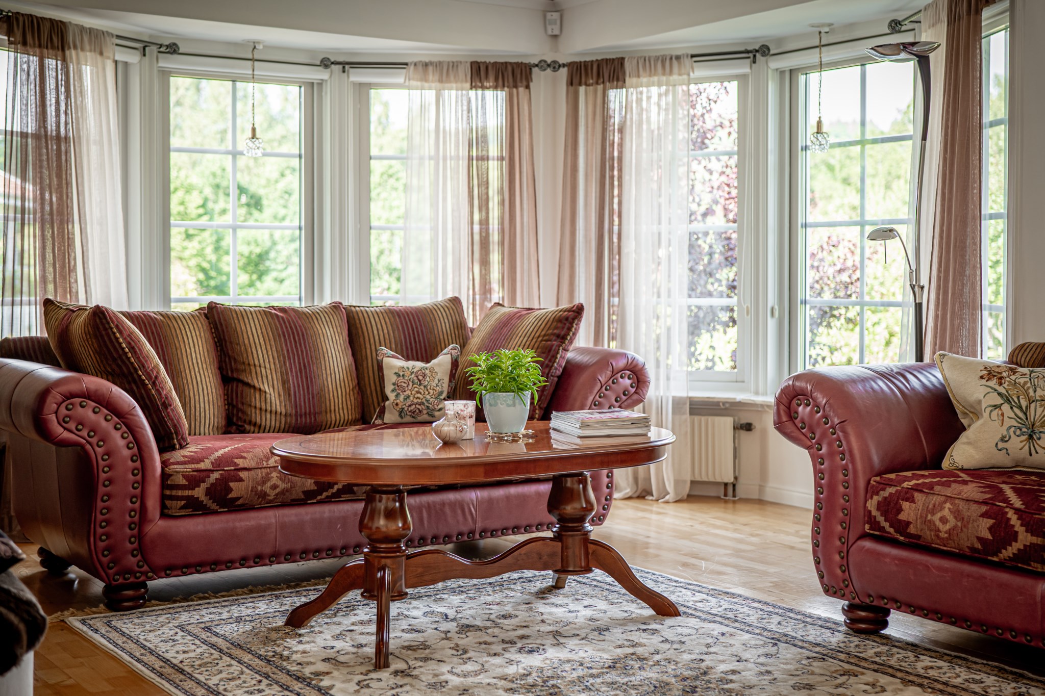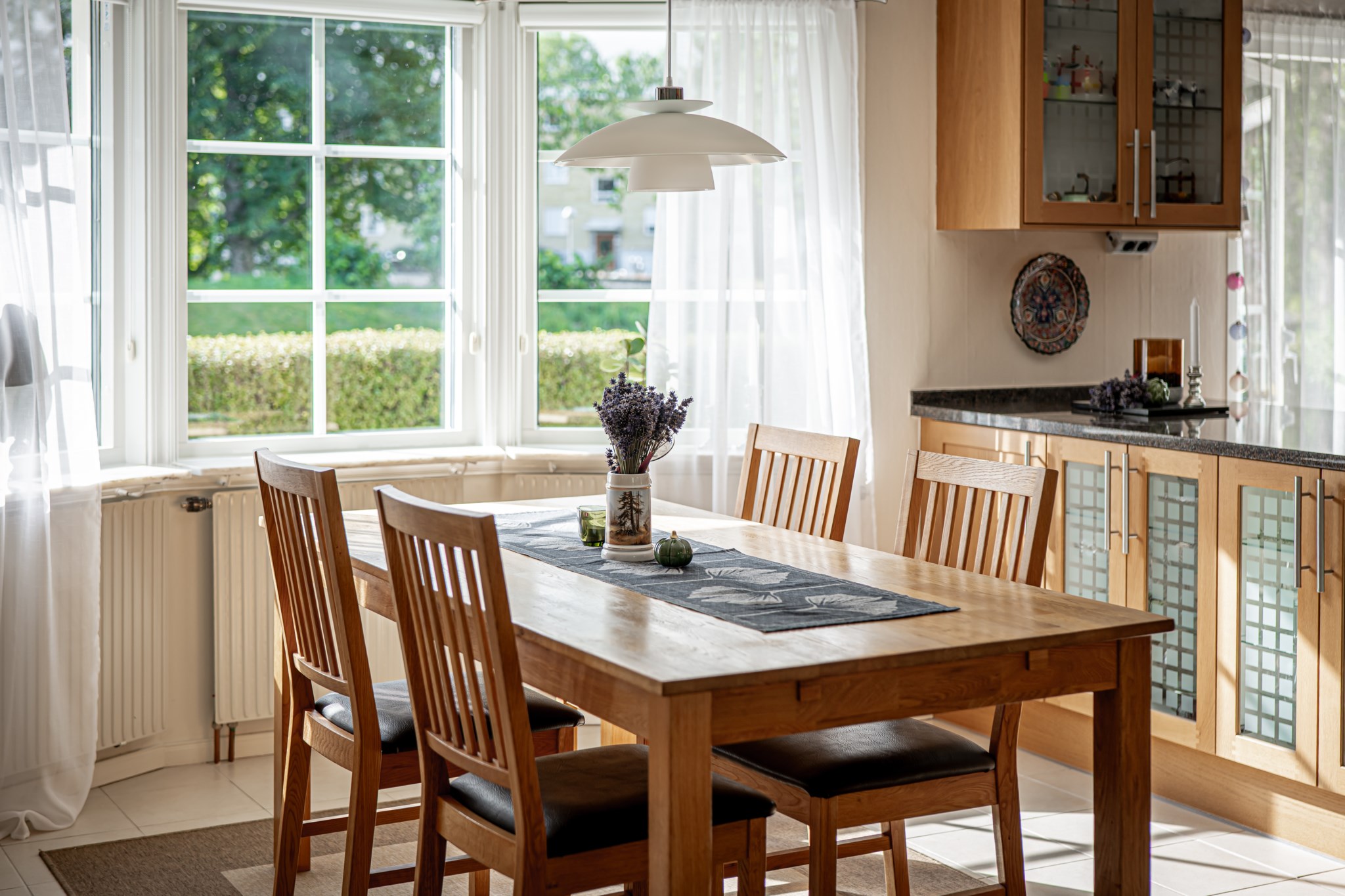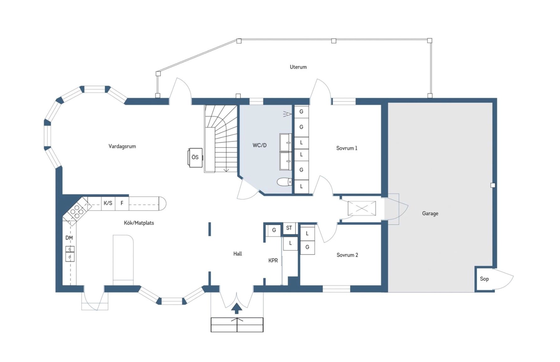 Vidare från köket i en öppen planlösning ligger vardagsrummet med eldstad samt utgång till det inglasade stora uterummet som används som sällskapsyta stor del av året.