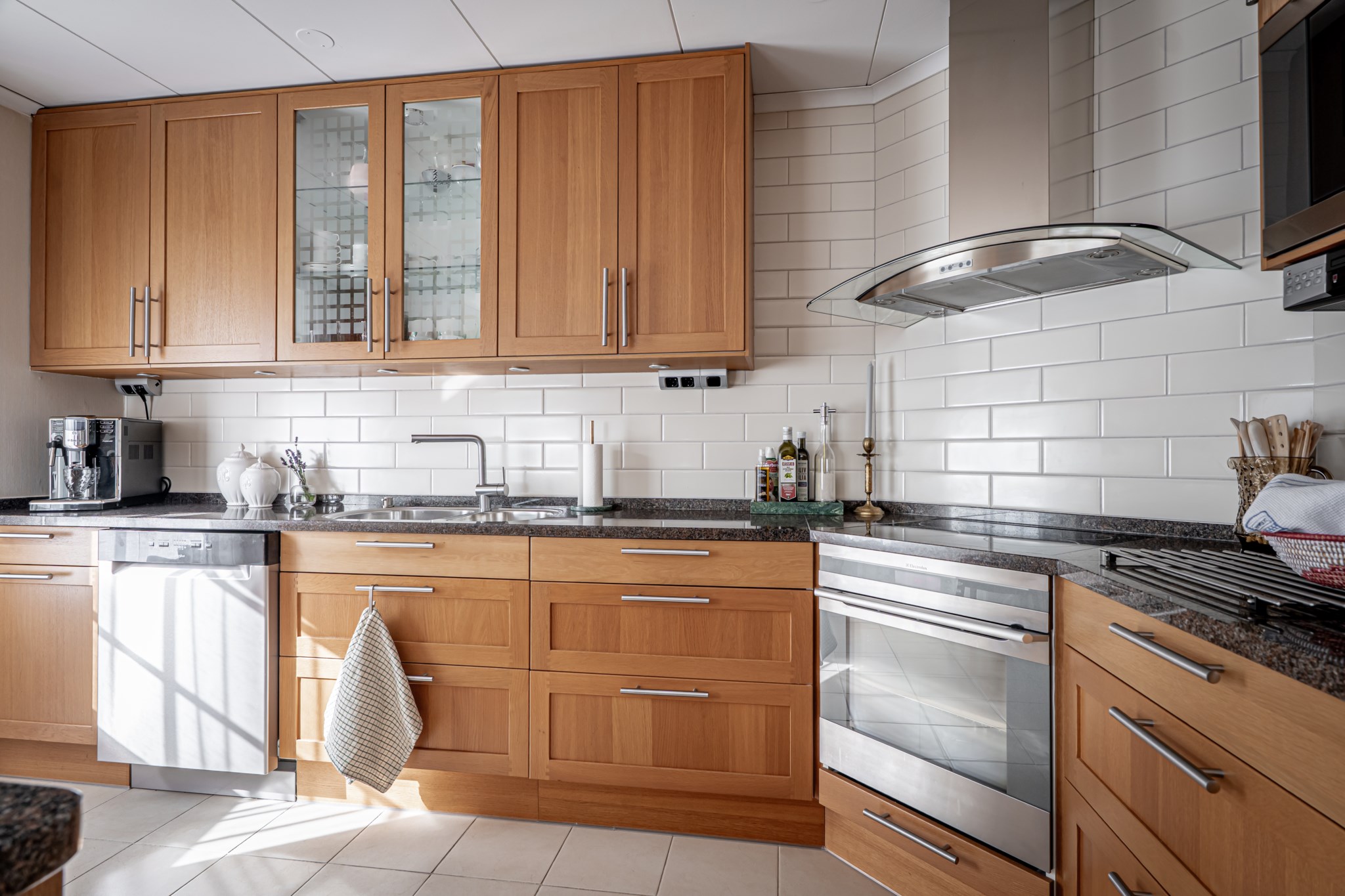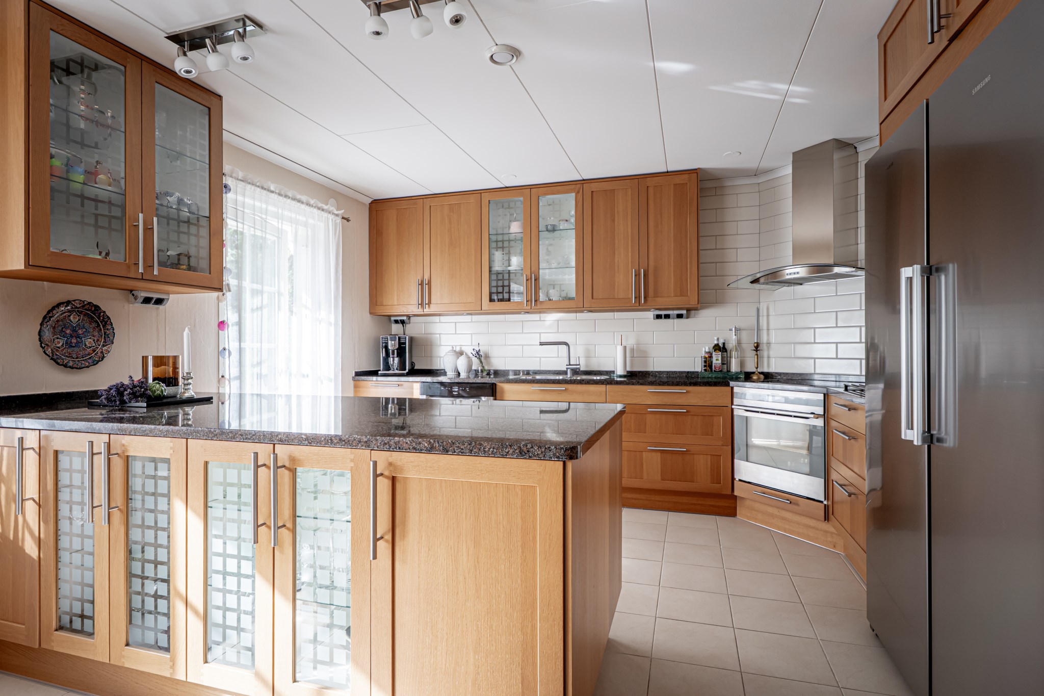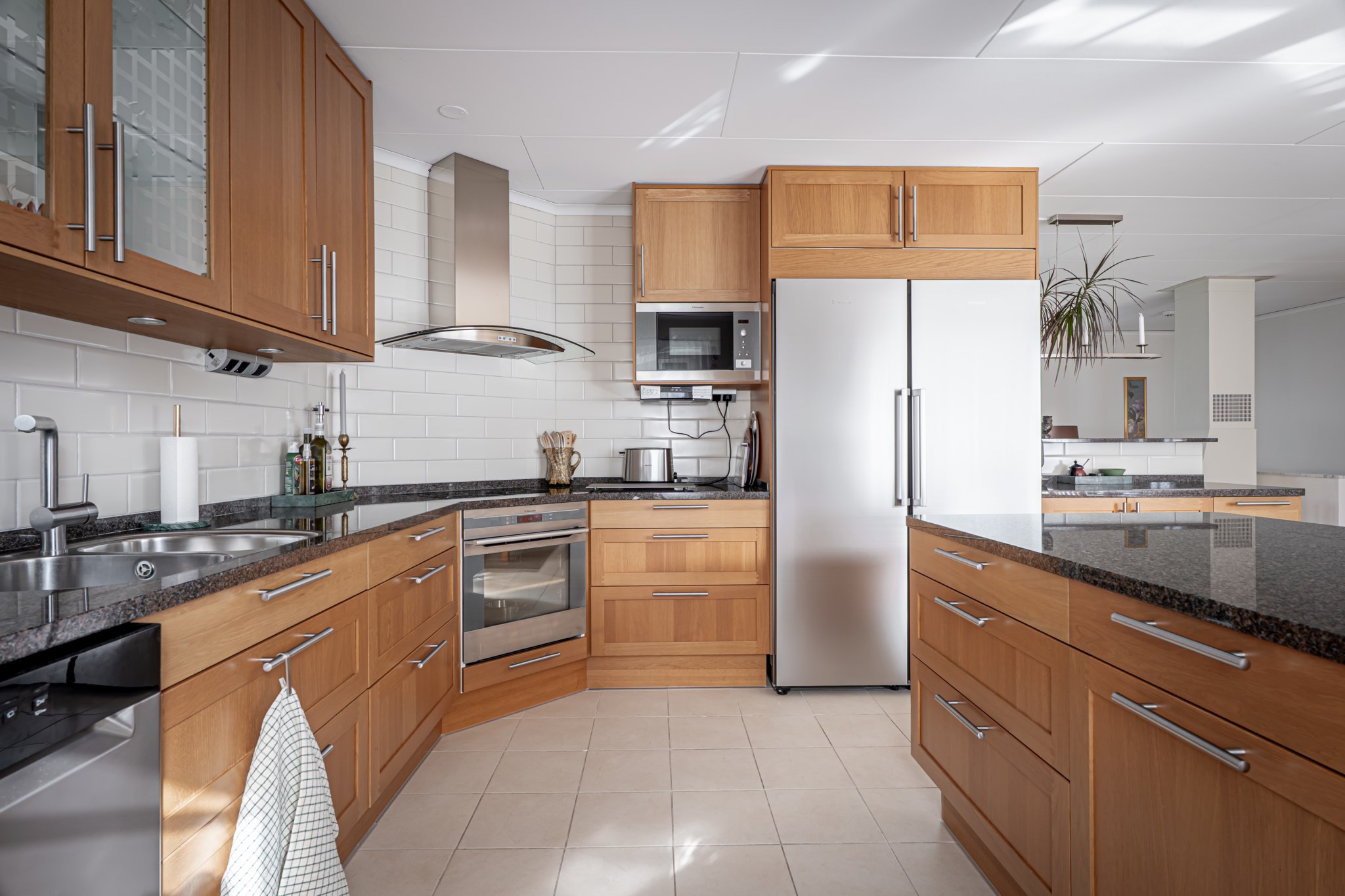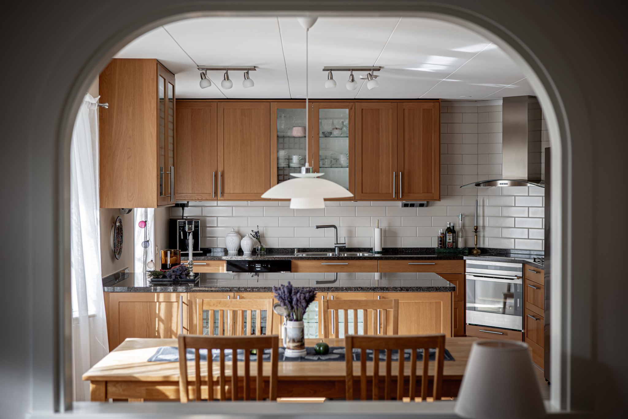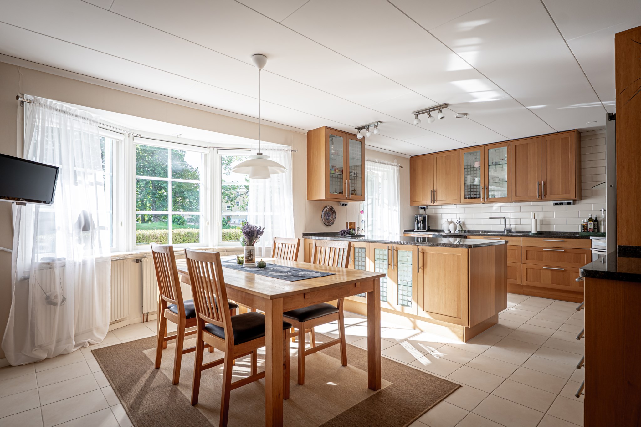 Ett rymligt och gediget kök med matplats i burspråket mot gatan. Solida kvalitéer med massiva ekluckor och mycket granit i bänkskivor. Köket är från 2006.