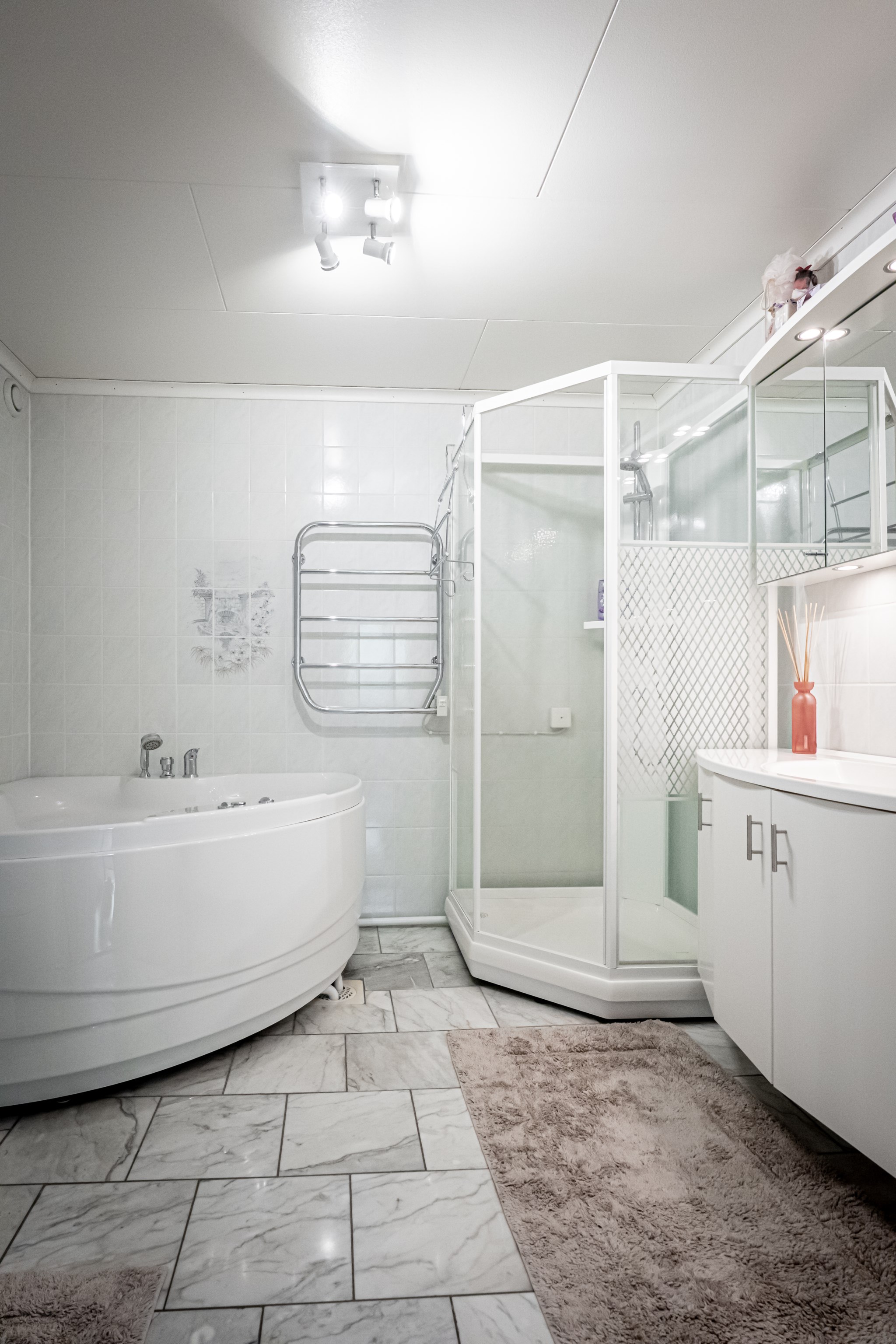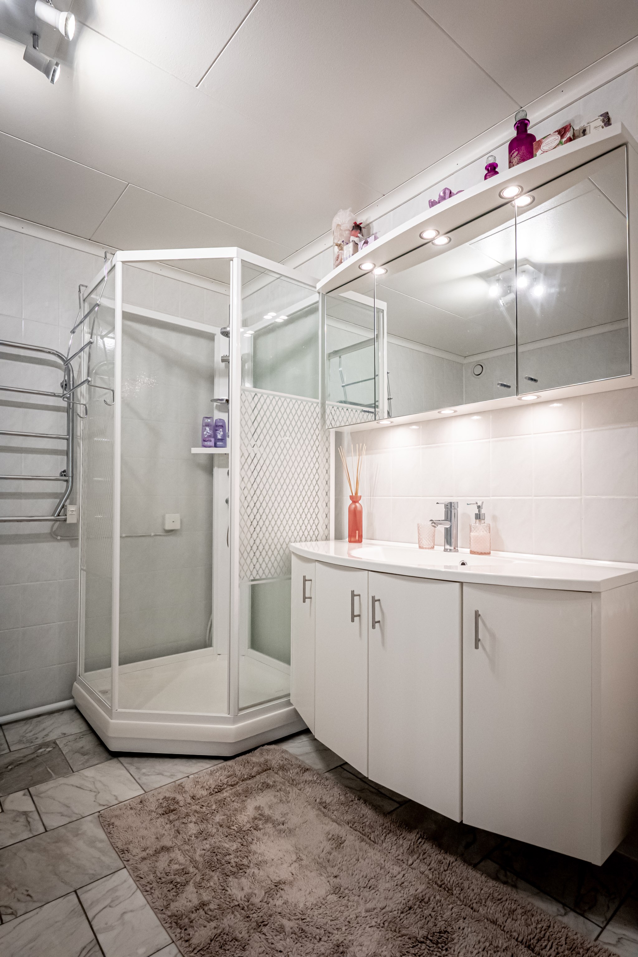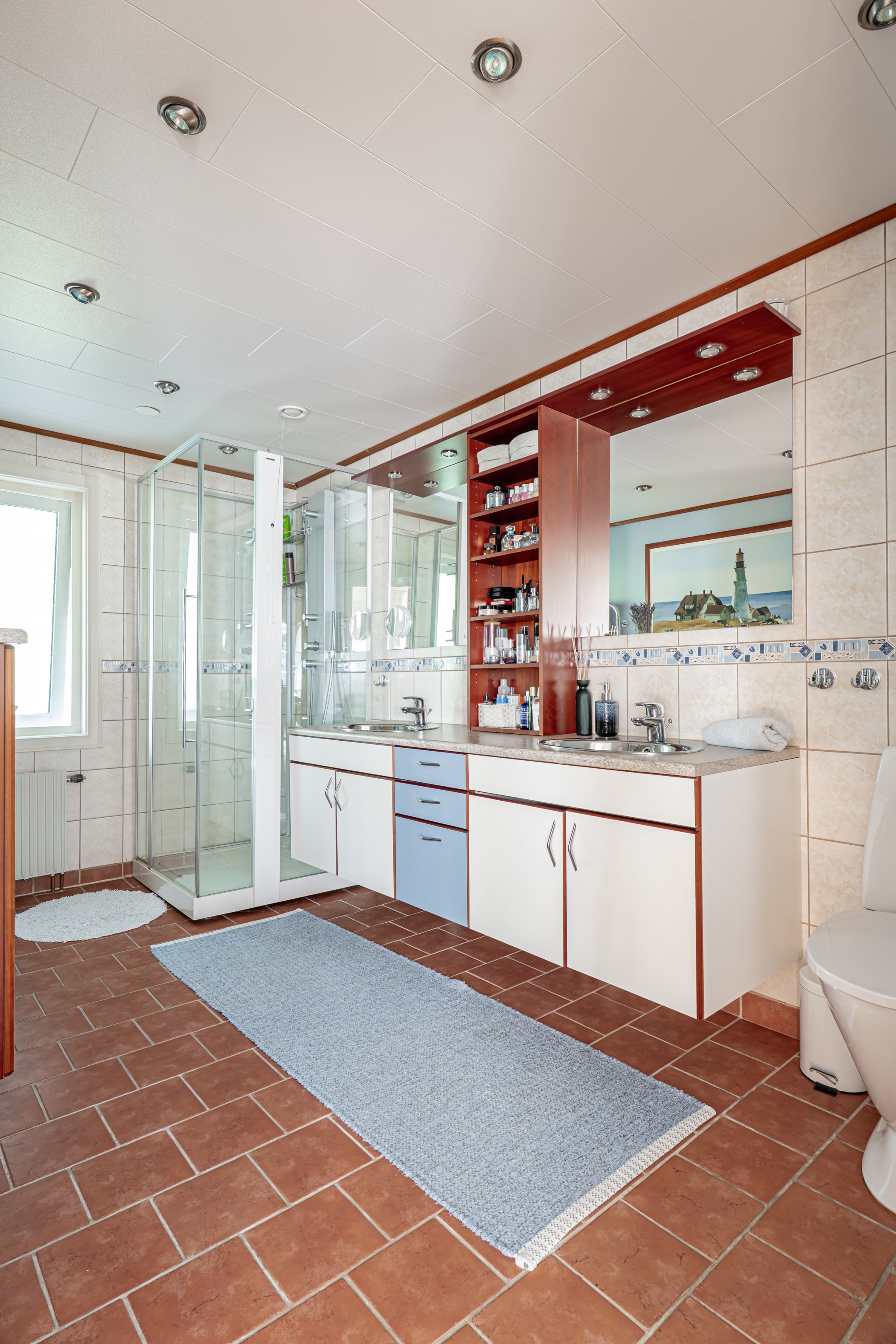 Badrum 1 ligger i anslutning till hallen i entréplanet och är generöst med dubbla tvättställ, duschkabin, wc, kakel, klinker och golvvärme. Badrum 2 ligger i sluttningsplanet och är även det helkaklat och har stort bubbelbadkar, duschkabin, tvättställskommod och wc samt golvvärme. Båda våtrummen har ytskikt från byggåret men känns väldigt fräscha.
