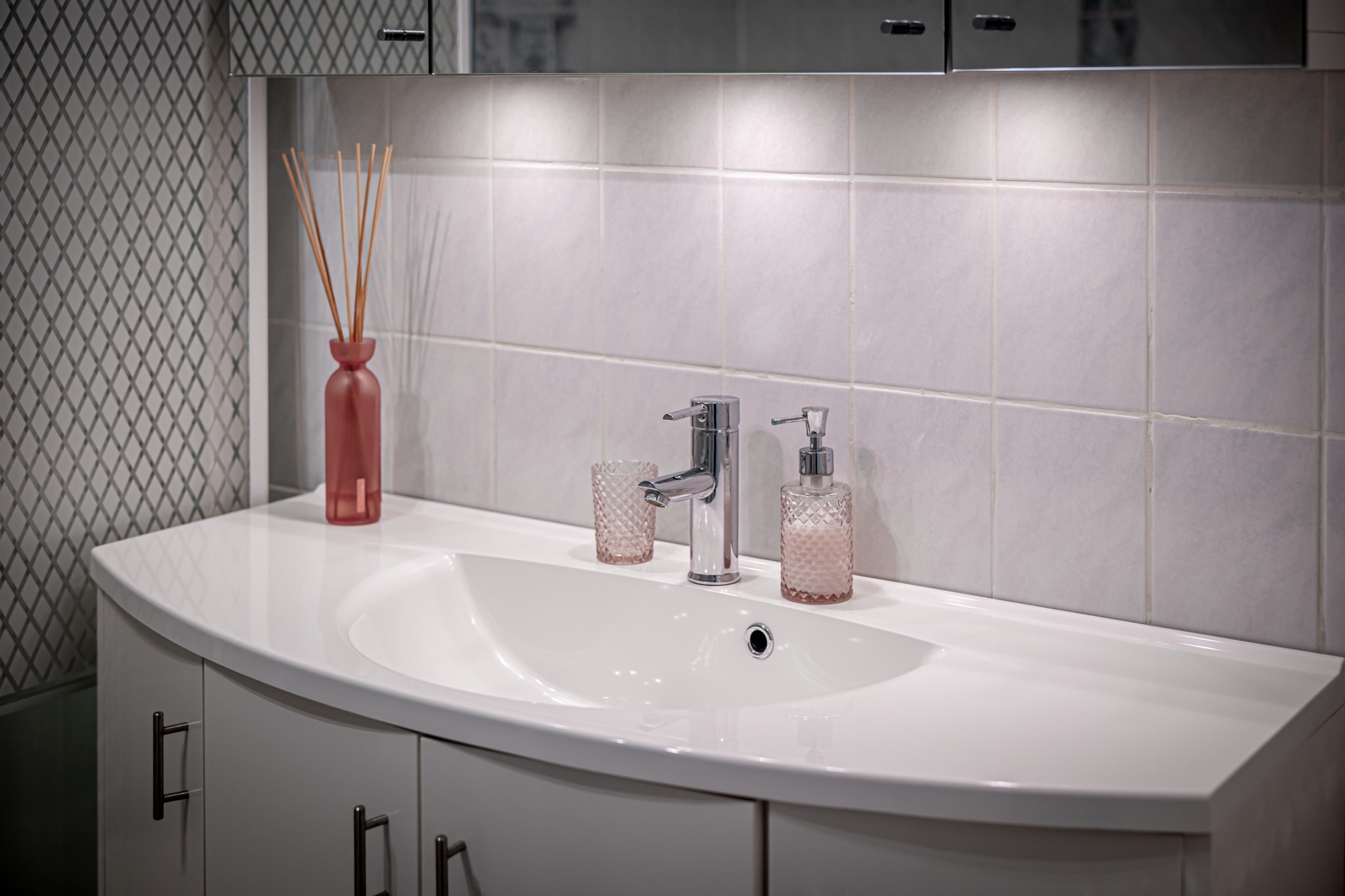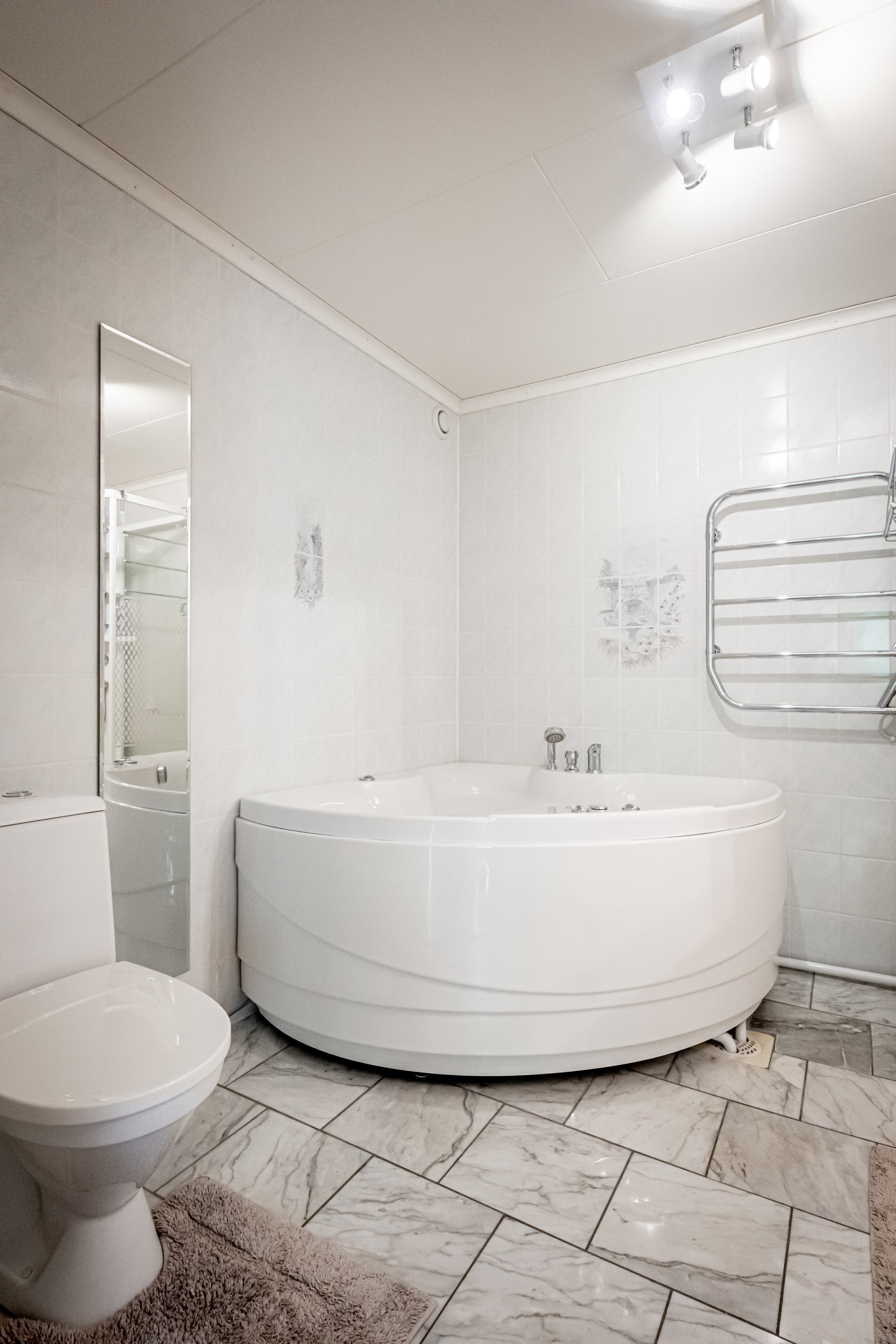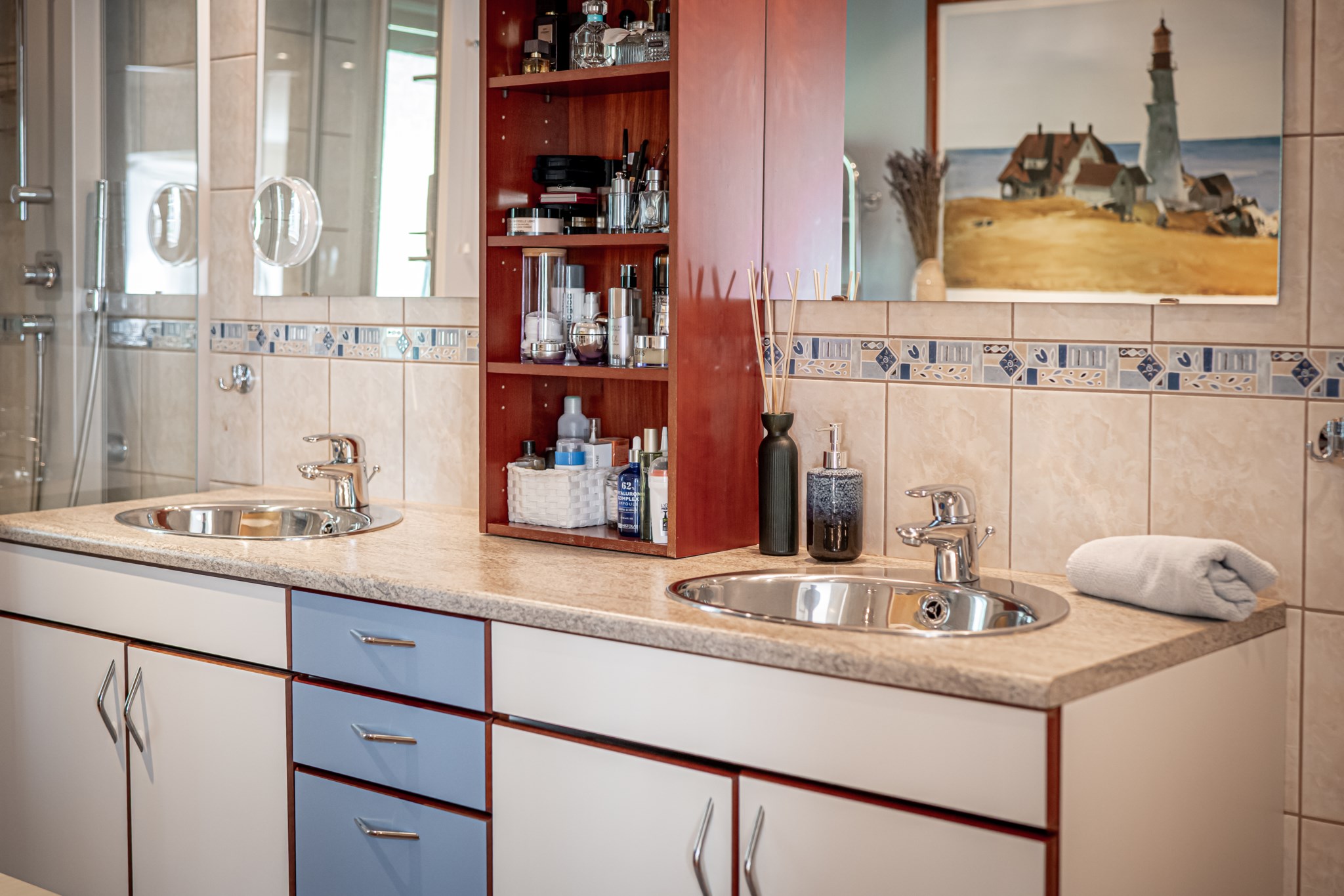 Badrum 1 ligger i anslutning till hallen i entréplanet och är generöst med dubbla tvättställ, duschkabin, wc, kakel, klinker och golvvärme. Badrum 2 ligger i sluttningsplanet och är även det helkaklat och har stort bubbelbadkar, duschkabin, tvättställskommod och wc samt golvvärme. Båda våtrummen har ytskikt från byggåret men känns väldigt fräscha.