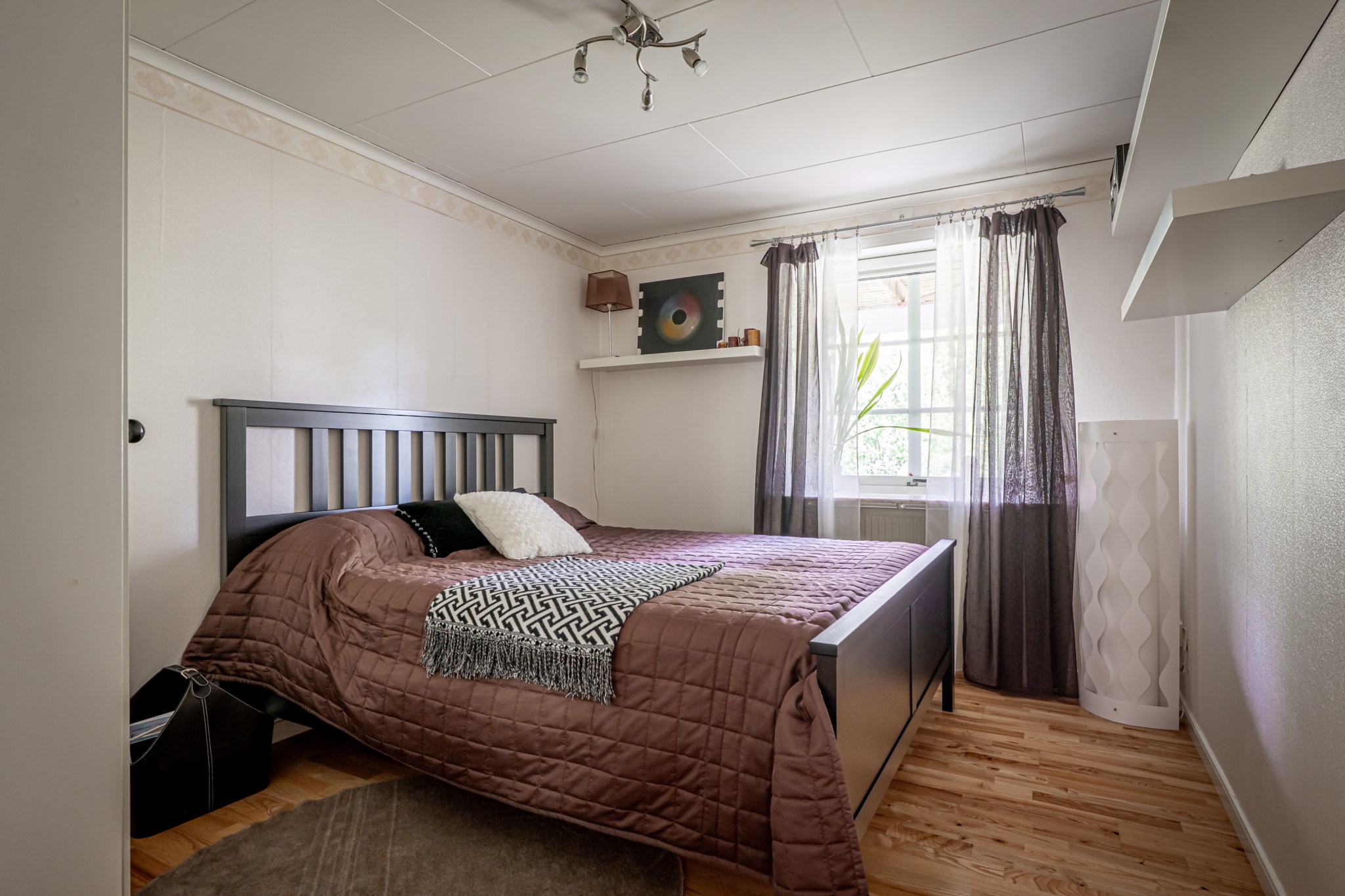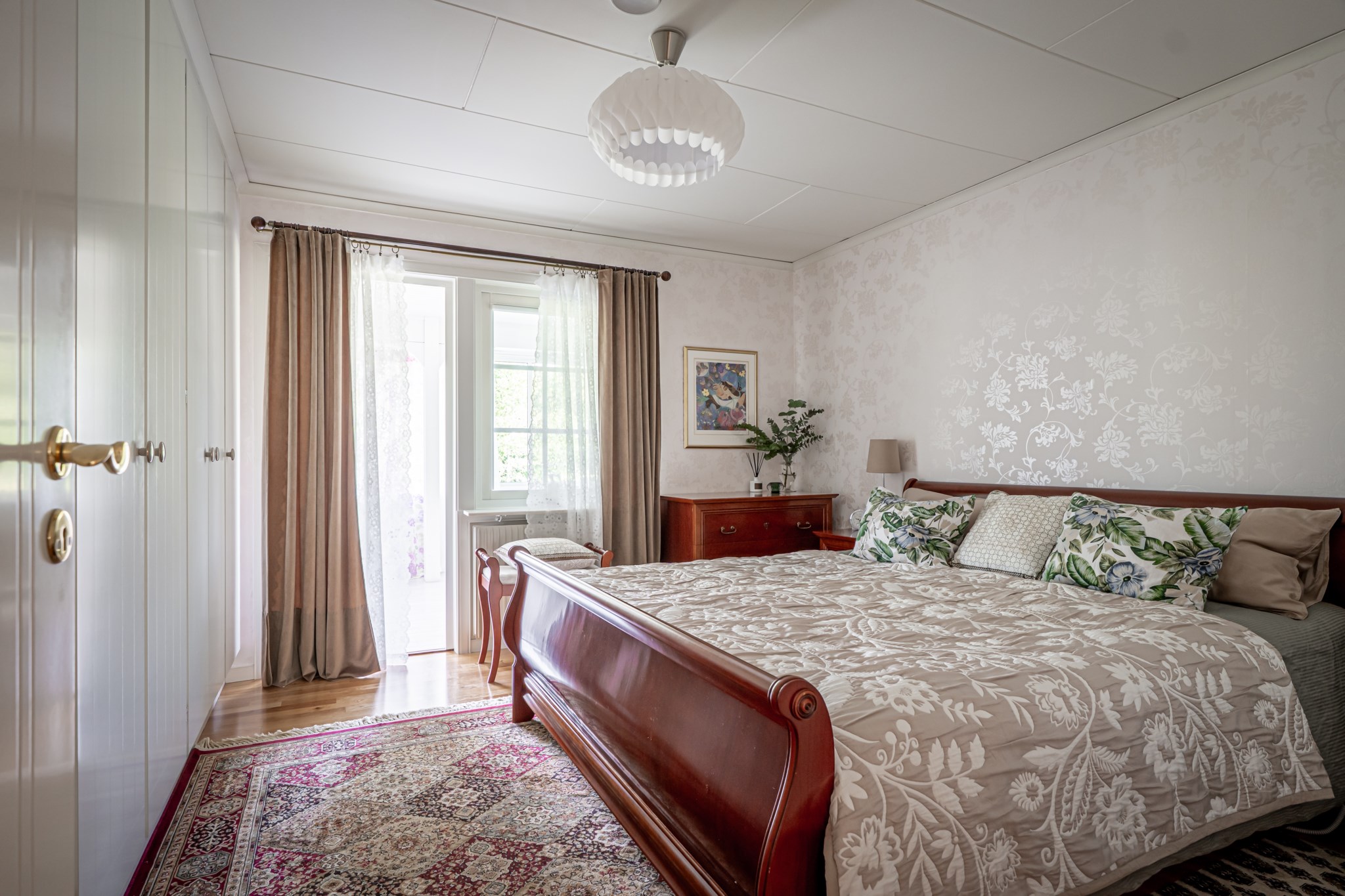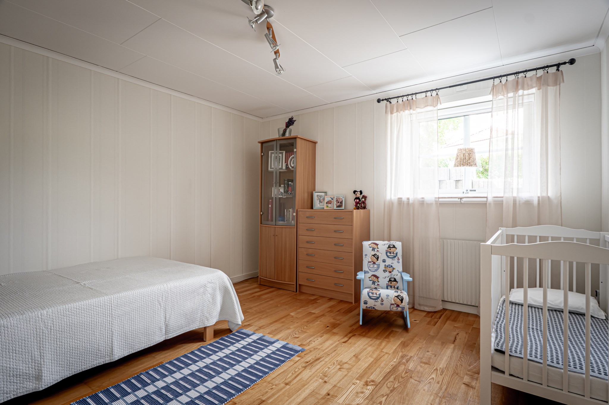 Huset har totalt 5 sovrum varav 2 i entréplanet där det stora föräldrasovrummet har utgång till terrassen/uterummet. 3 generösa sovrum i sluttningsplanet varav alla 3 fungerar att ha dubbelsäng i.