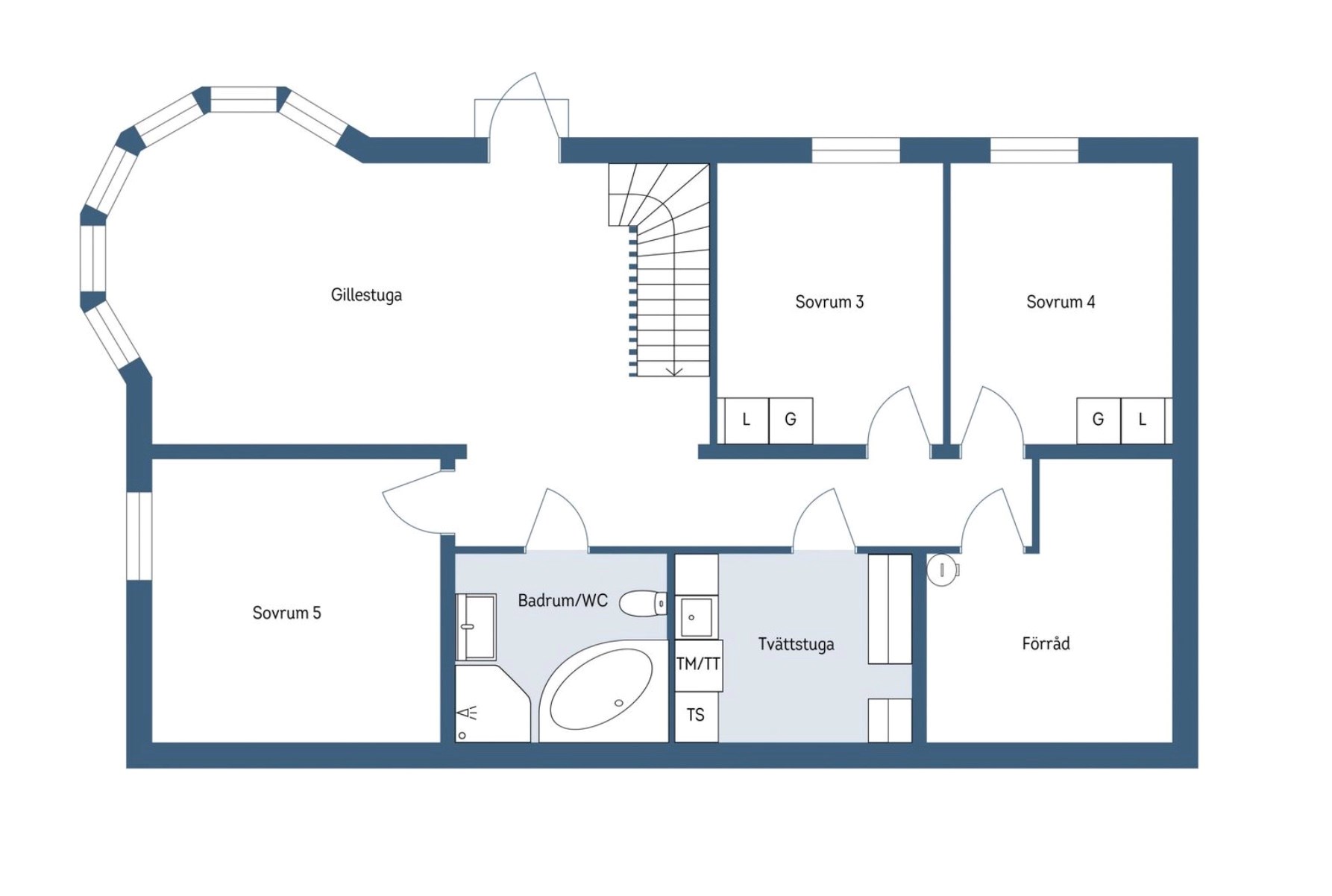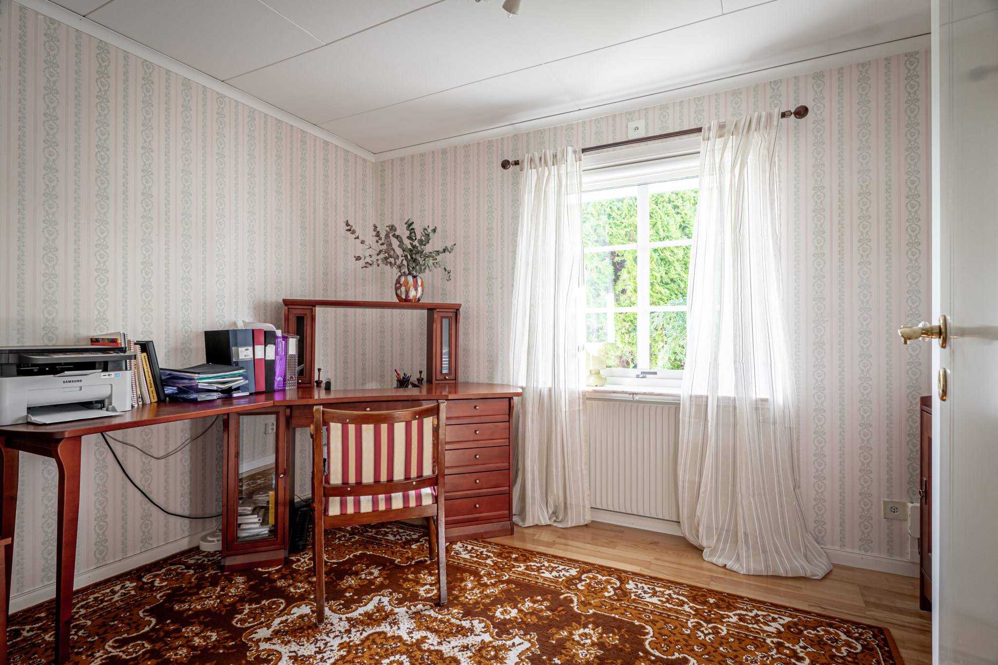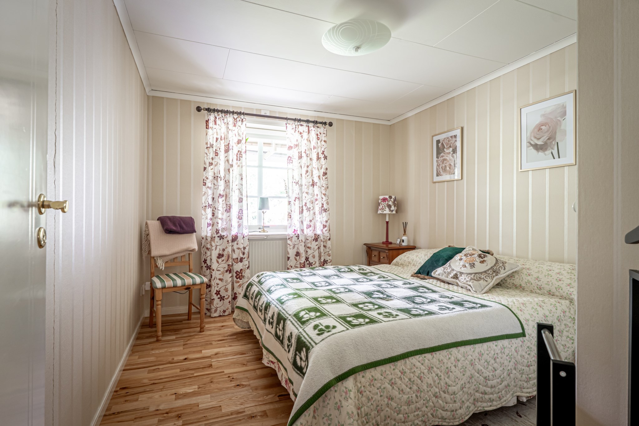 Huset har totalt 5 sovrum varav 2 i entréplanet där det stora föräldrasovrummet har utgång till terrassen/uterummet. 3 generösa sovrum i sluttningsplanet varav alla 3 fungerar att ha dubbelsäng i.