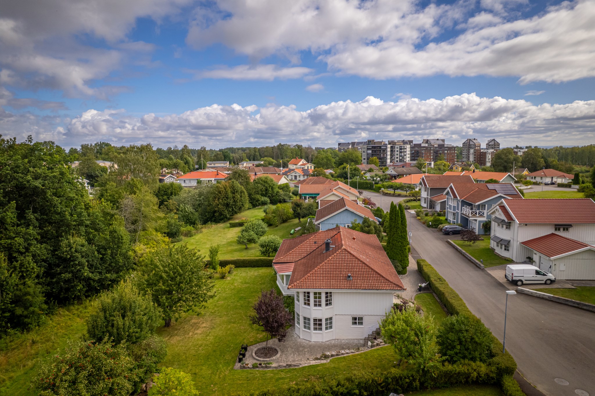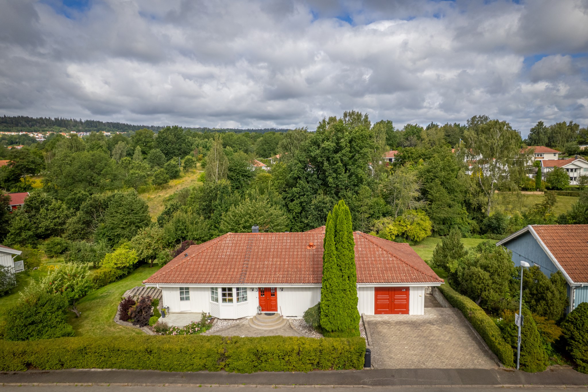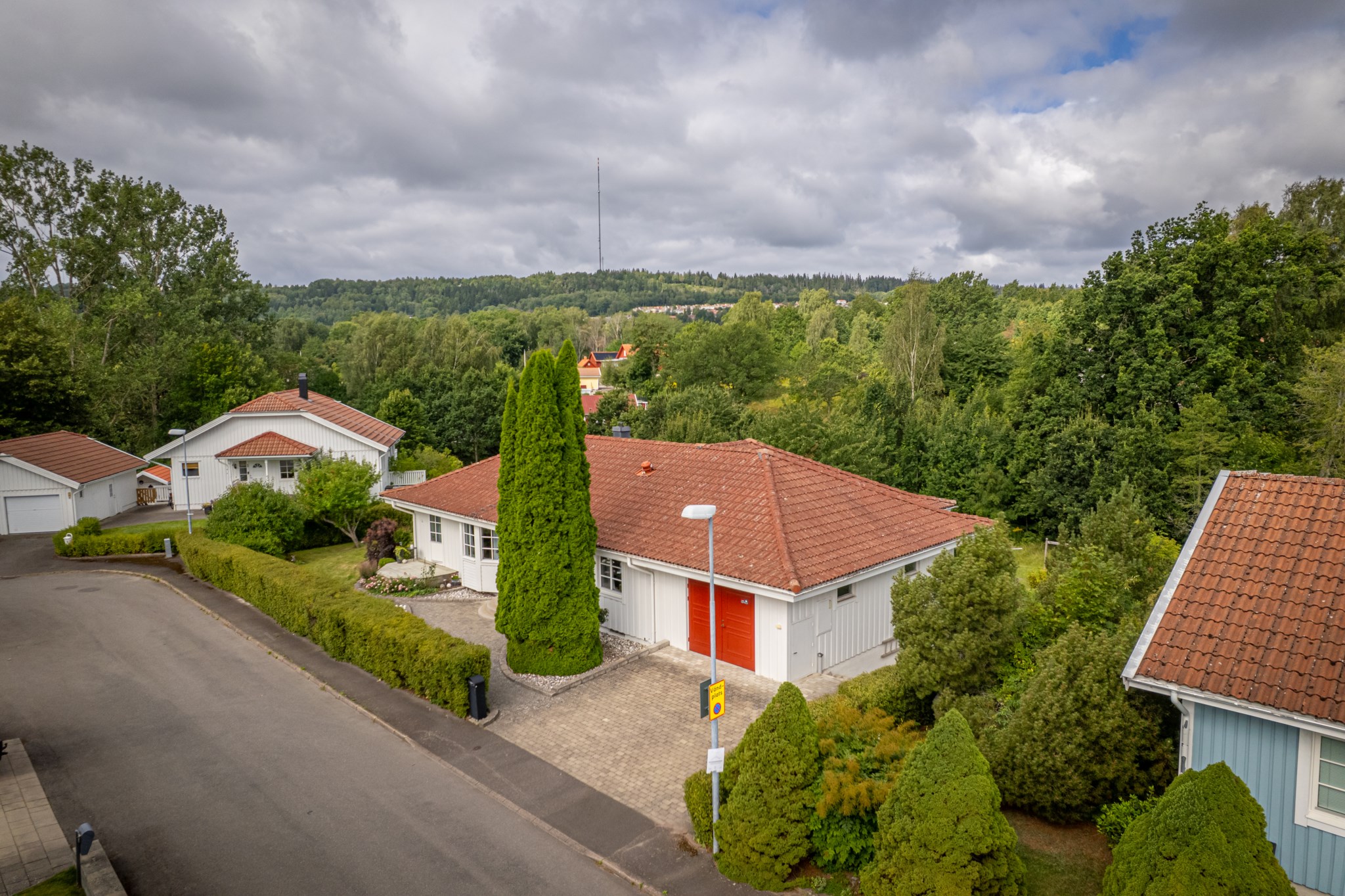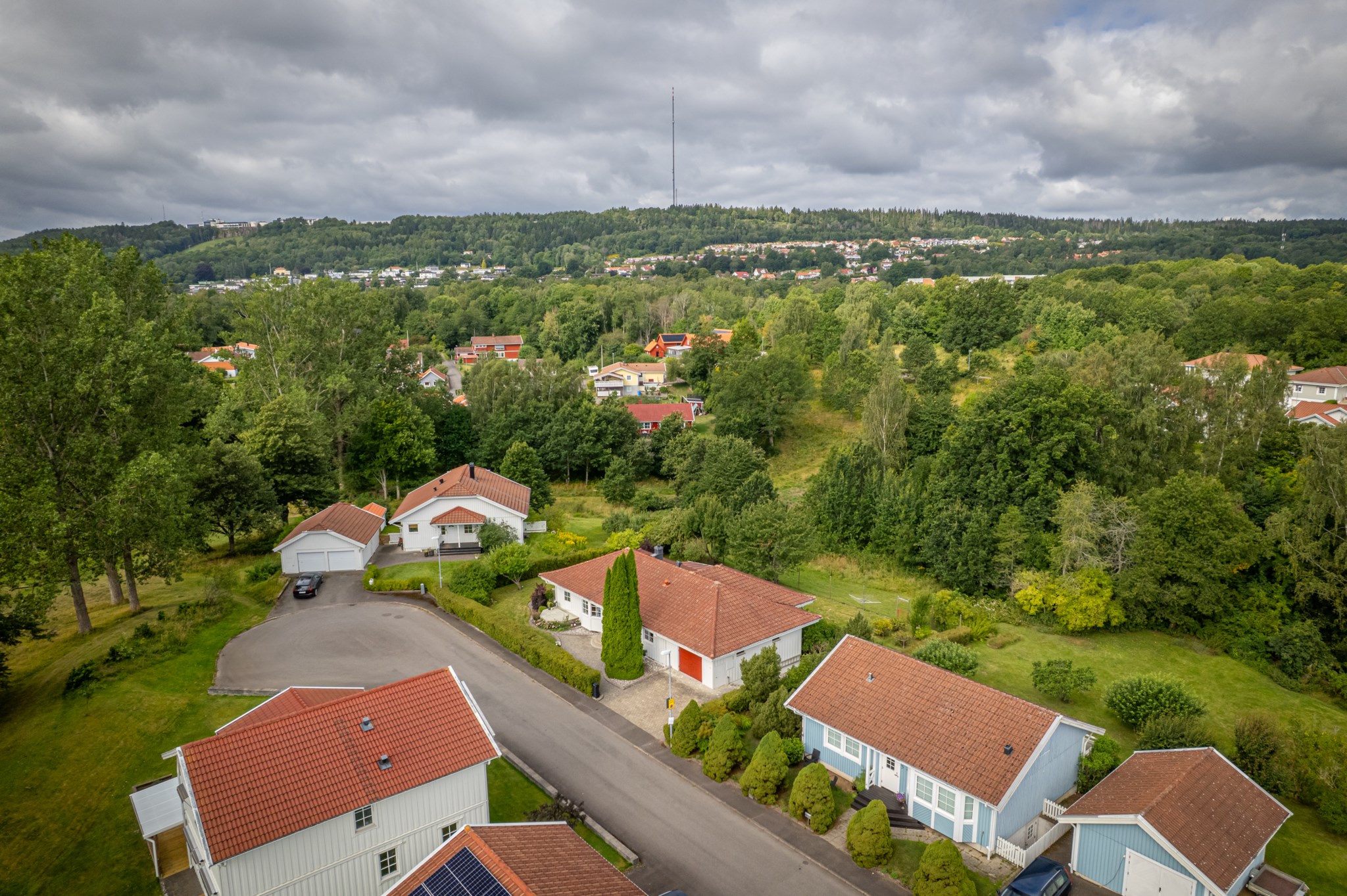 Med ett lugnt läge på återvändsgata ligger denna mycket välskötta sluttningsvilla från 1991. Generösa ytor såväl inne som på den välplanerade tomten som genom sitt fina läge mot grönområde och rätt väderstreck ger fin sol hela dagen samt kvällen. I närområdet finns såväl förskola som skola och fina sportanläggningar mm.