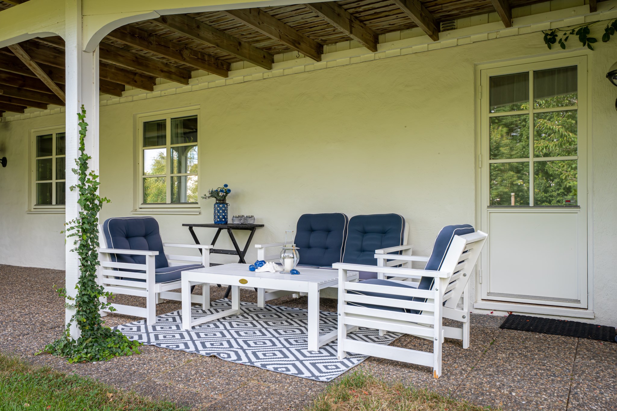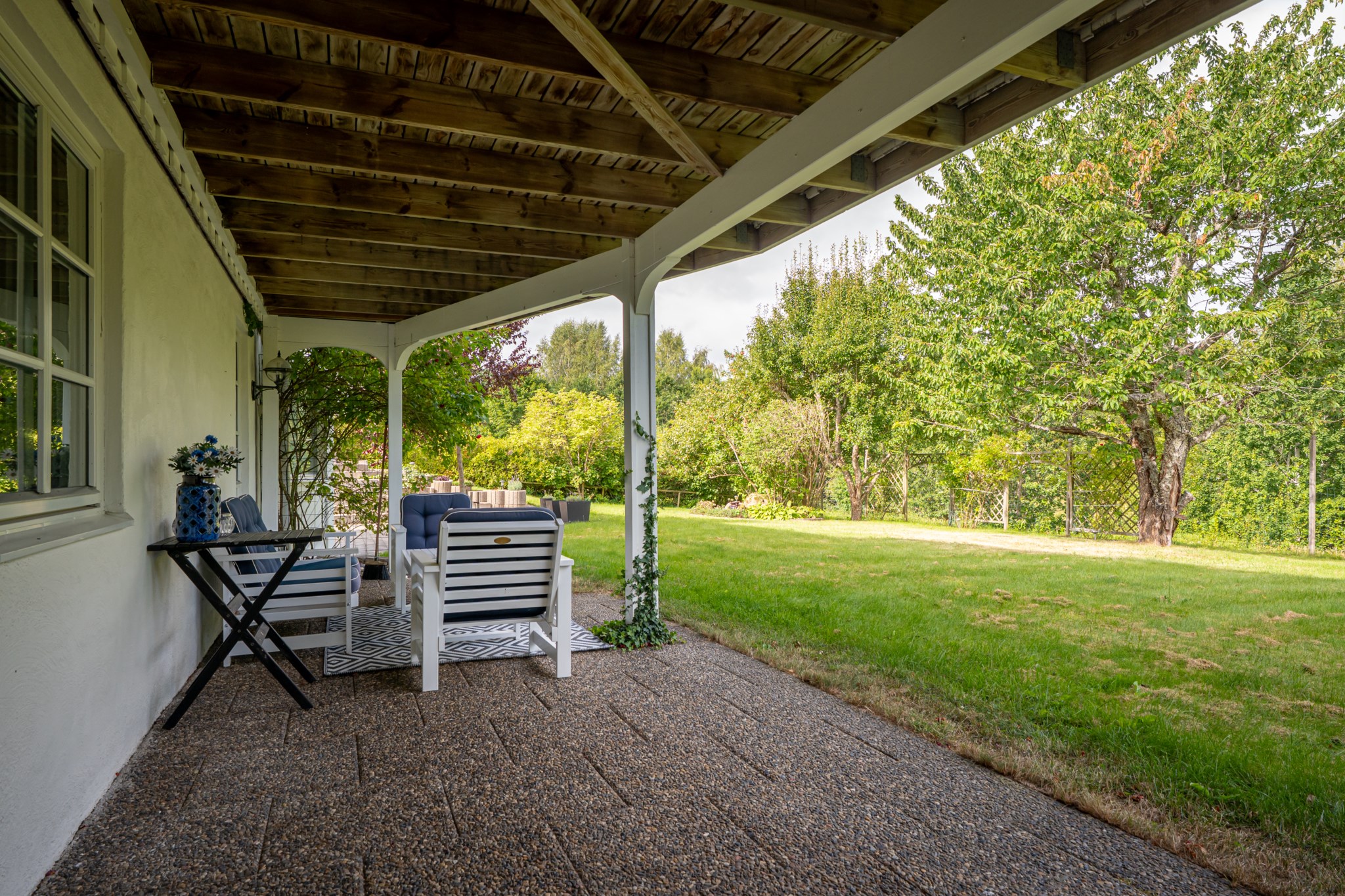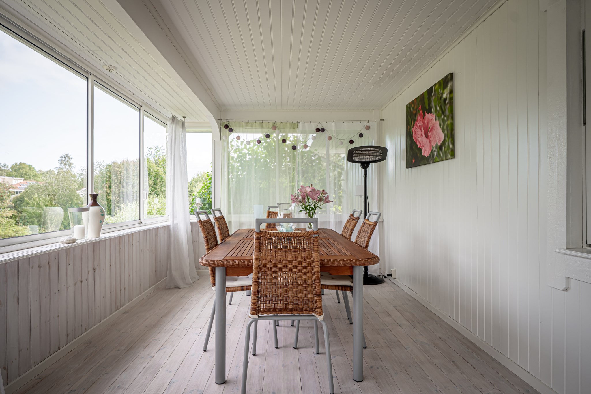 I övre plan har man byggt in den stora terrassen till ett härligt uterum vilket gör det användbart stora delar av året. På baksidan finns en stensatt stor terrass på gaveln samt en avdelning som sträcker sig under uterummet vilket gör att den är under tak. På framsidan finns även en liten stensatt terrass för morgonkaffet.