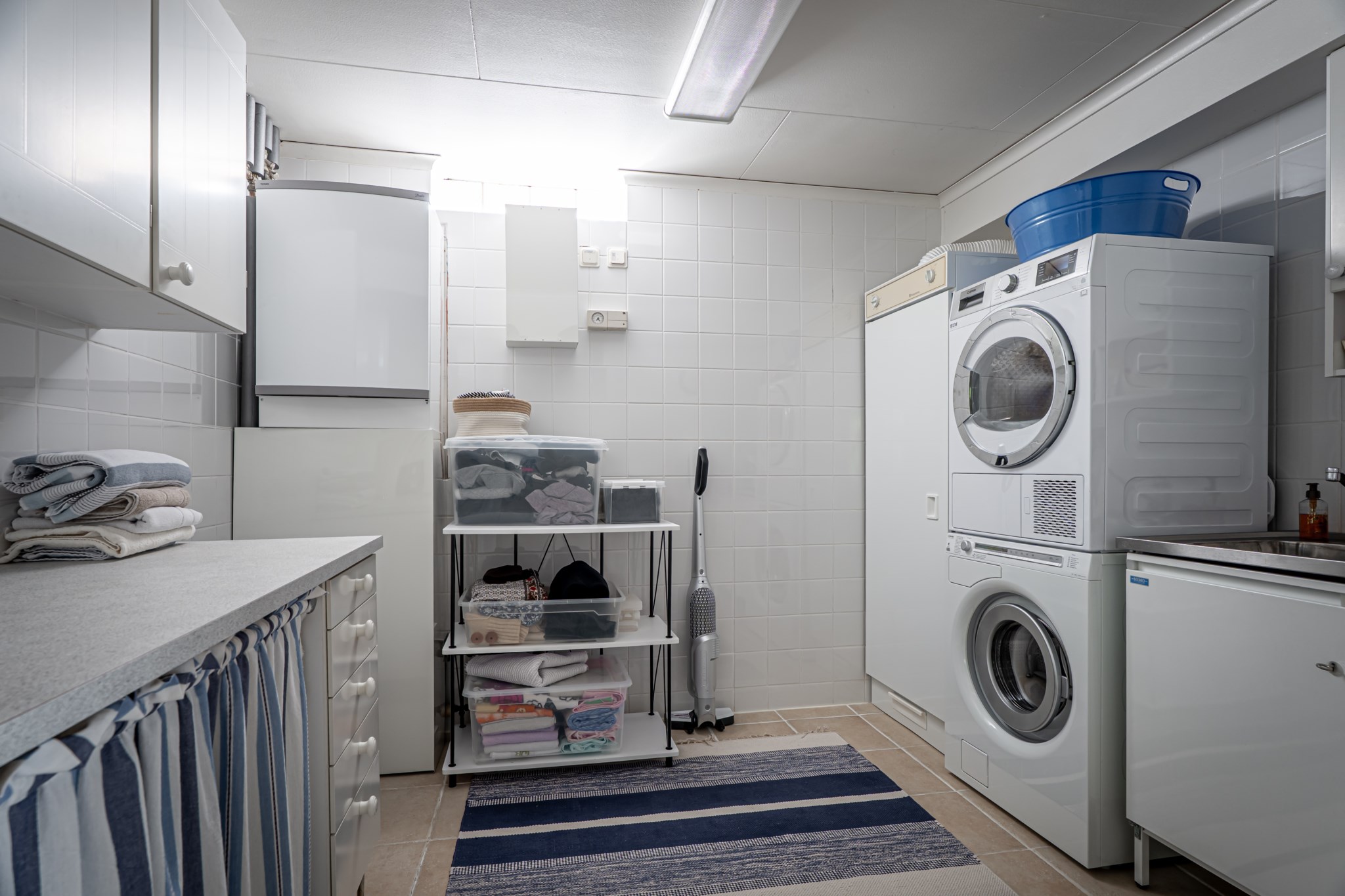Tvättstuga i sluttningsplanet med tvättstugeinredning, tvättmaskin och tumlare.