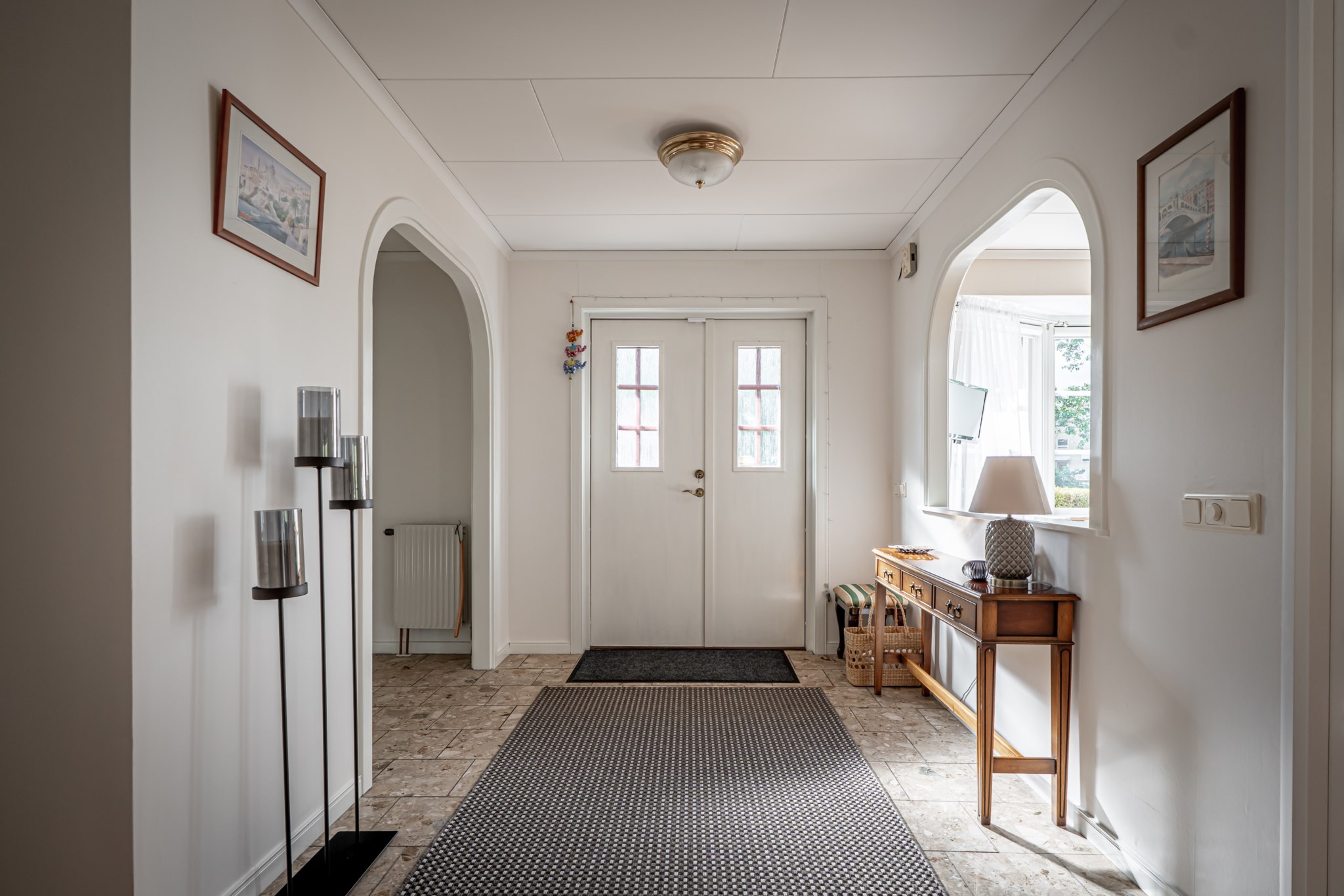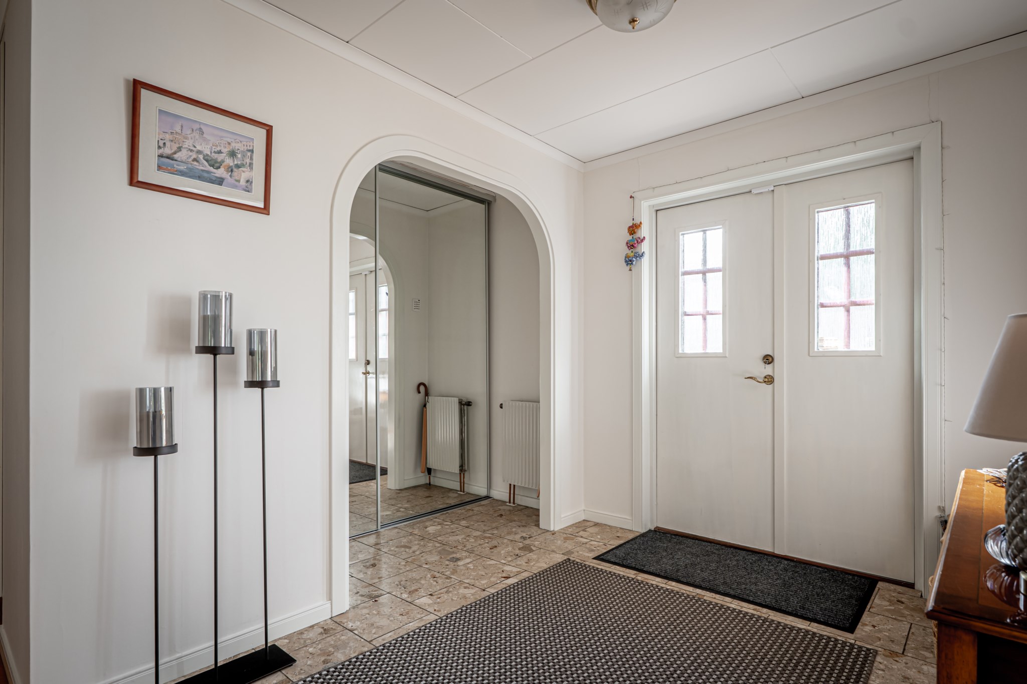 Välkommen in i entrén med kapprum och gott om förvaring, vidare i hallen som öppnar upp sig med vardagsrum och kök till vänster och sovavdelning till höger.