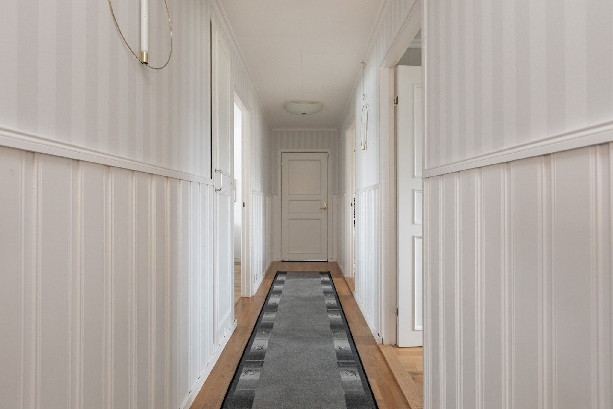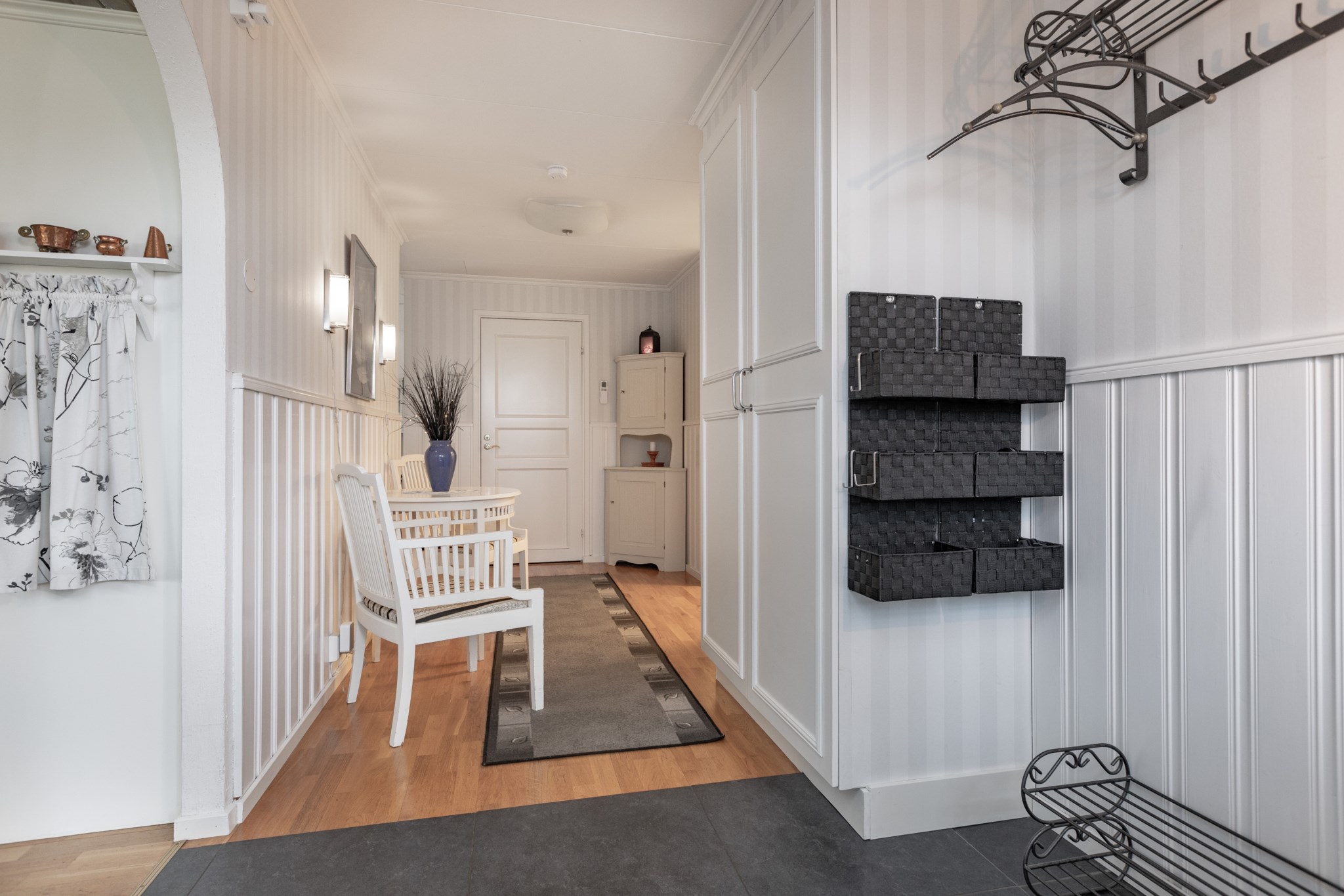 Välkommen in, här möts vi utav en ombonad hall med kalkstensgolv och stor garderob för förvaring.