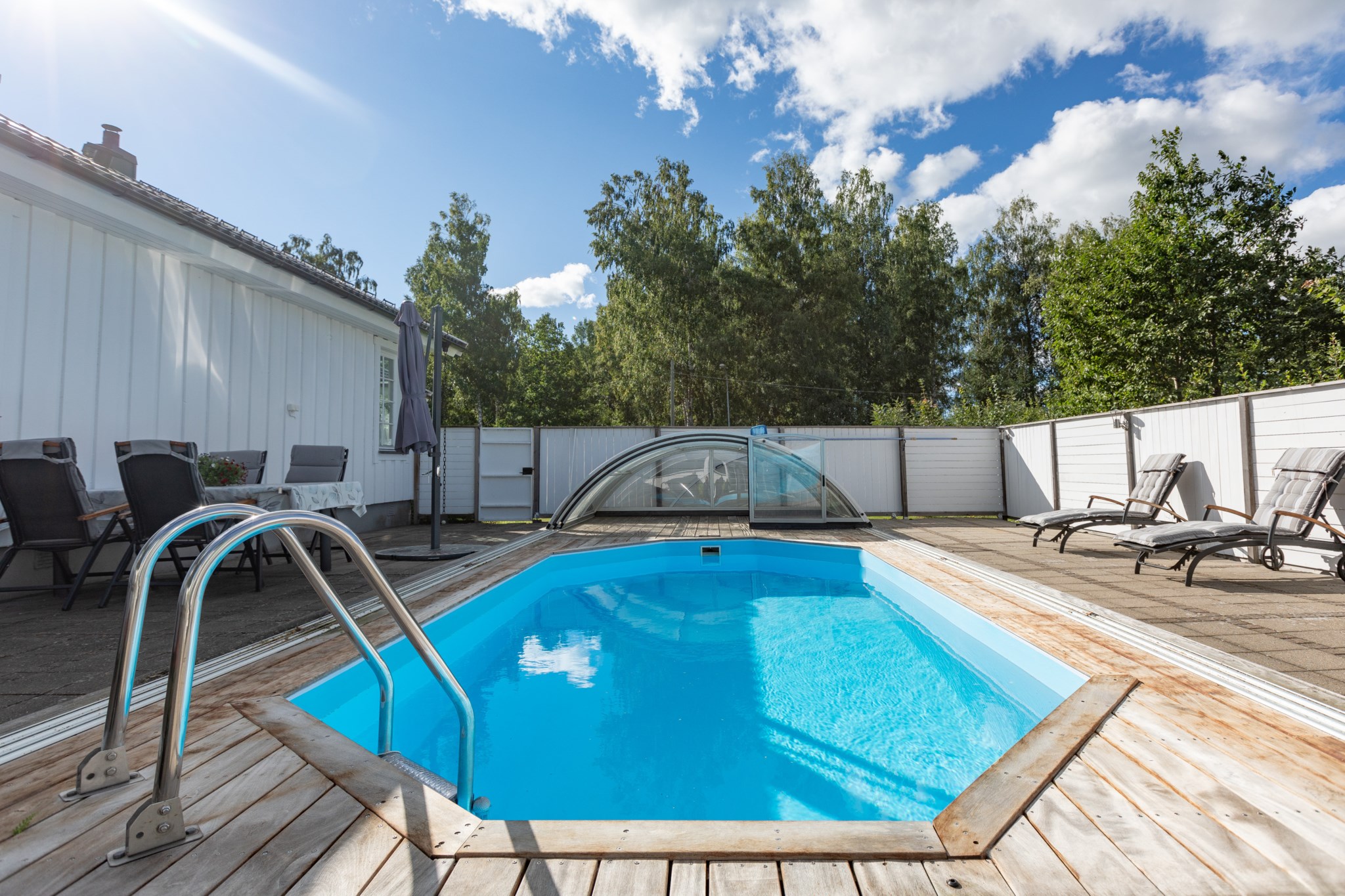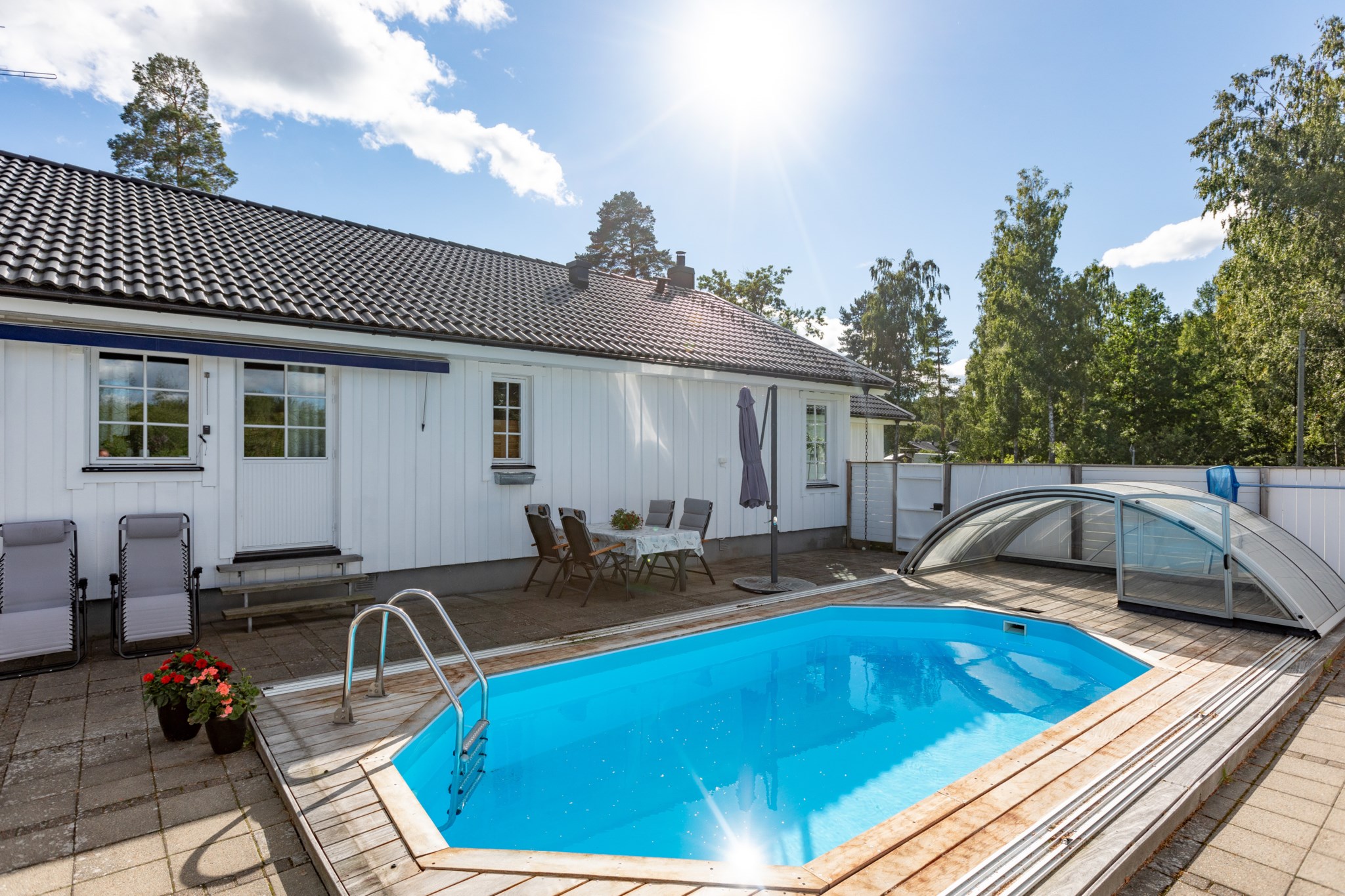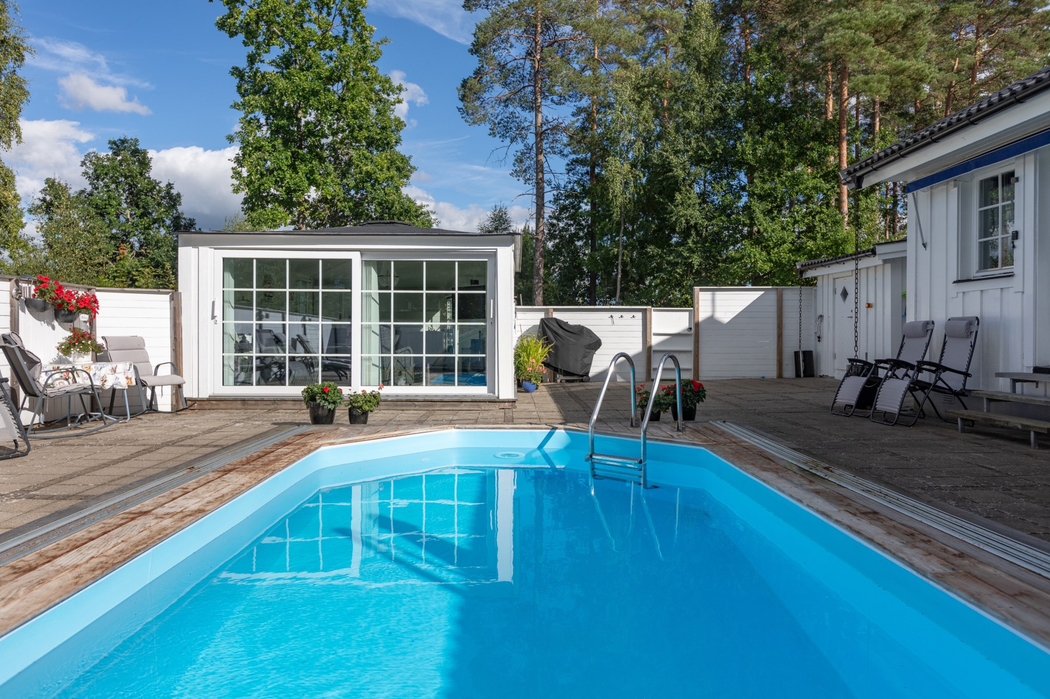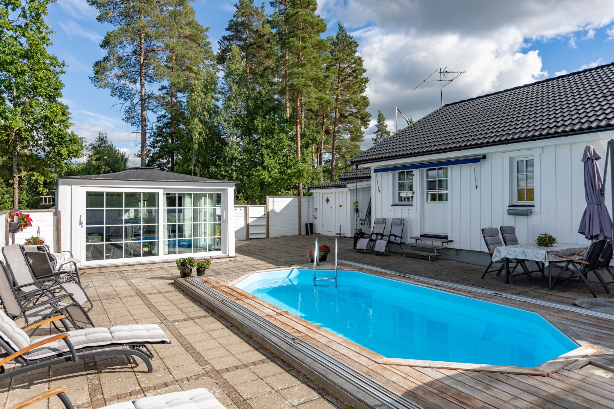 Påkostad baksida som är väl inramad genom staket och bidrar till en stor integritet. Stenplattor till största del med trall runt omkring den oktagon formade poolen med pooltak. Utöver detta har man även byggt ett poolhus med generösa glaspartier, gott om plats för avkoppling och en pentrydel.