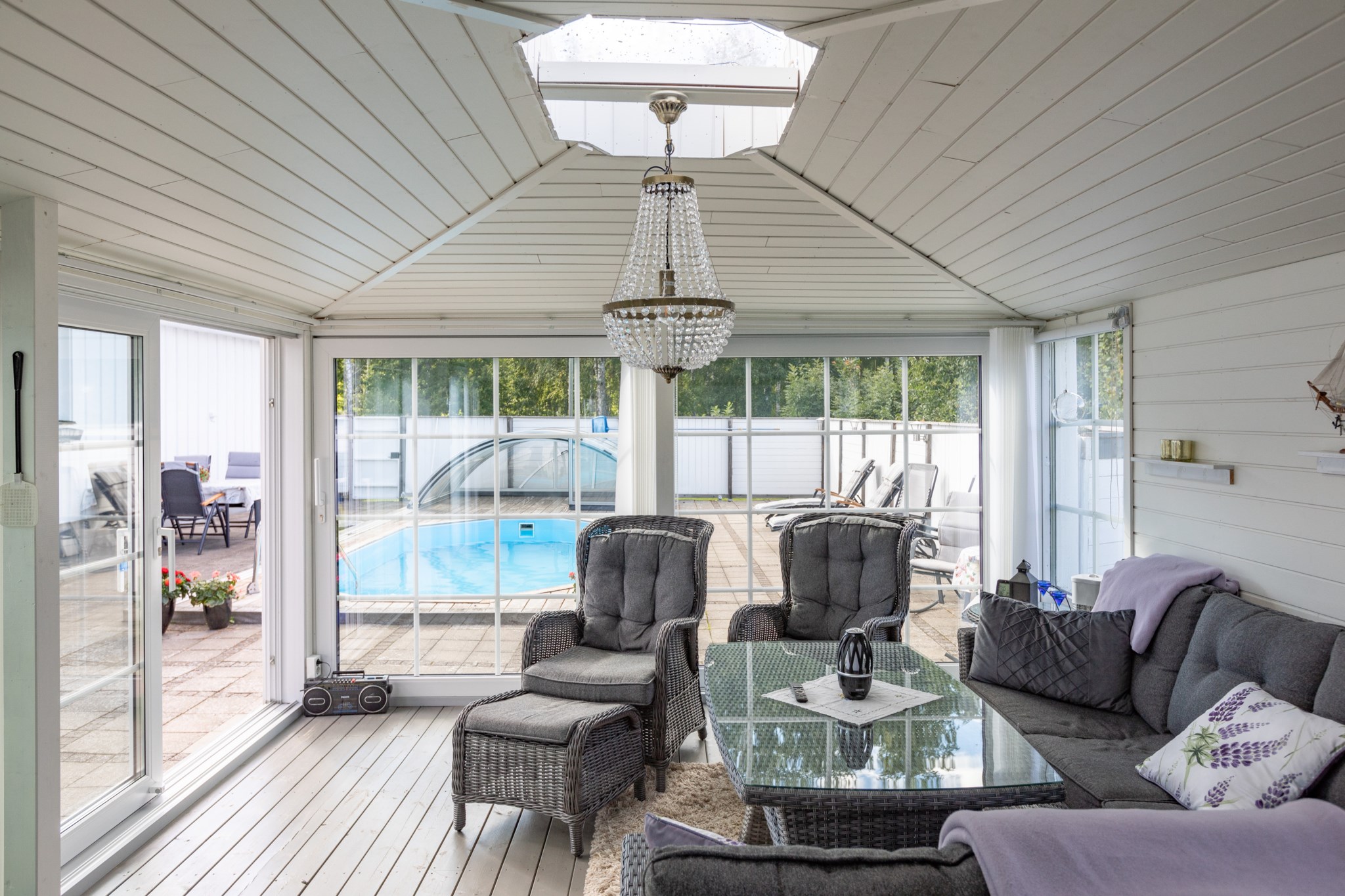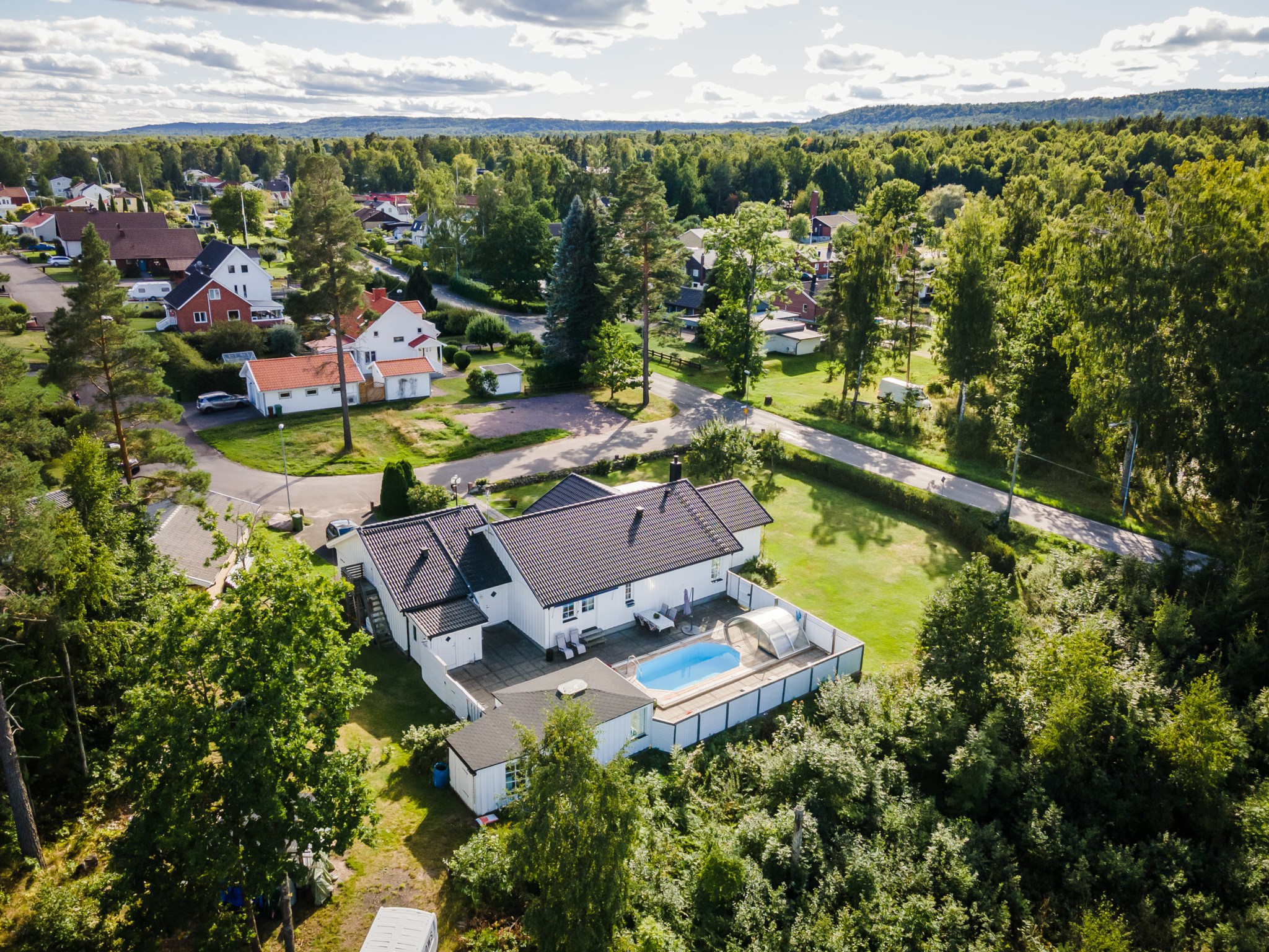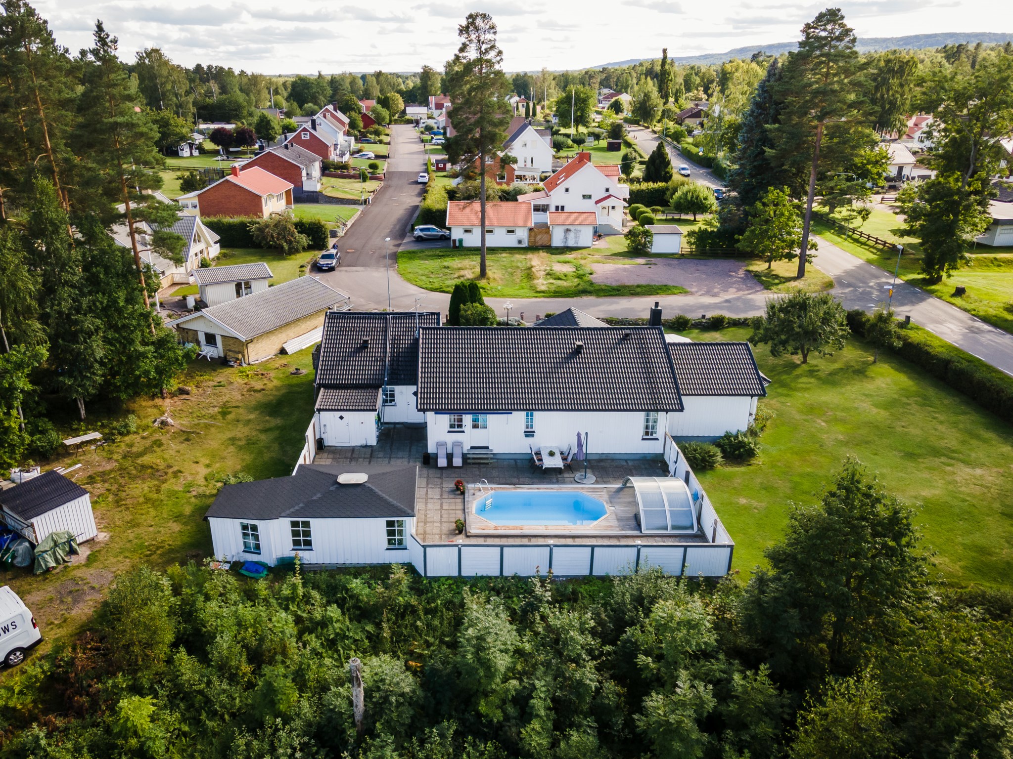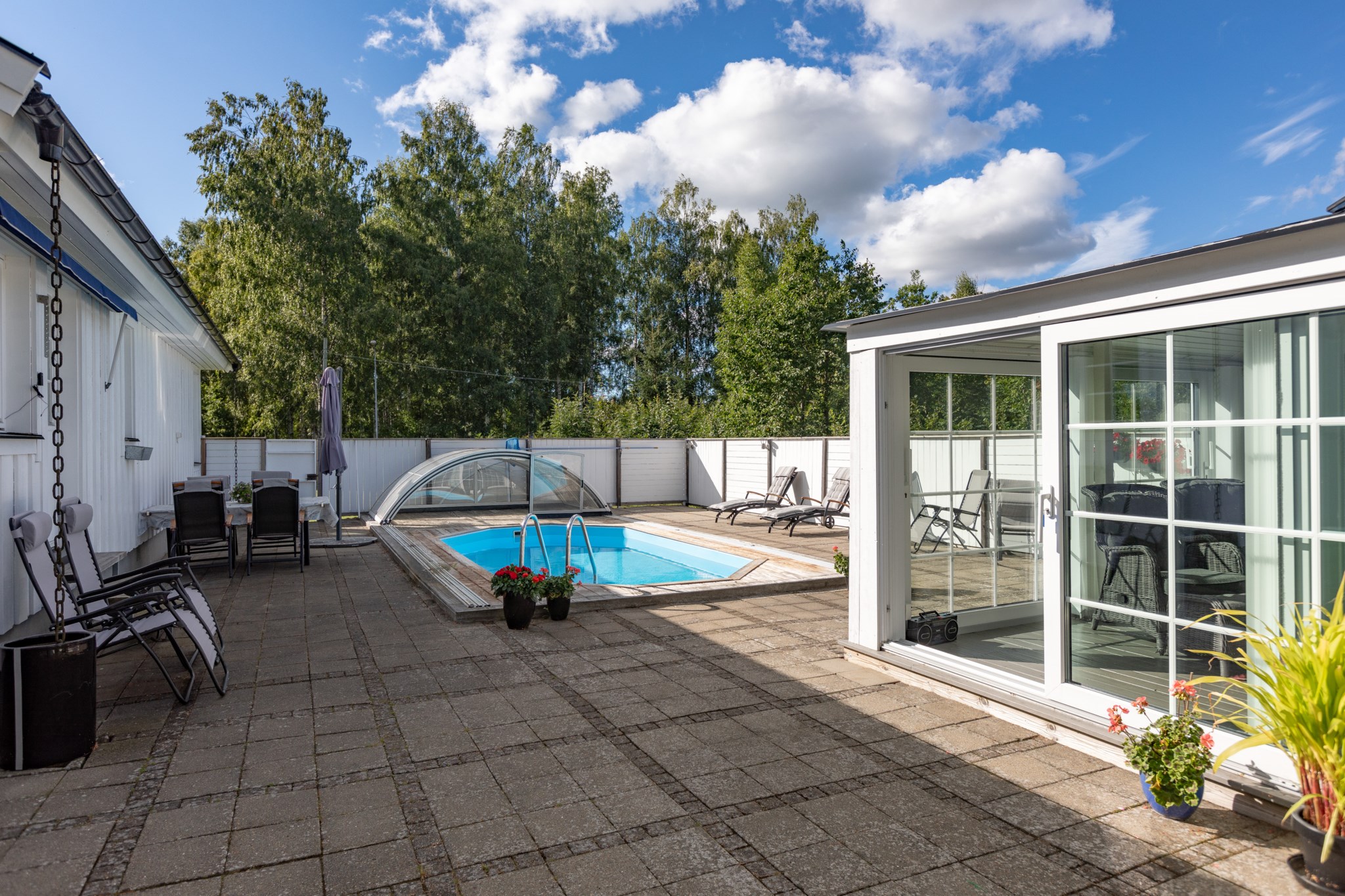Påkostad baksida som är väl inramad genom staket och bidrar till en stor integritet. Stenplattor till största del med trall runt omkring den oktagon formade poolen med pooltak. Utöver detta har man även byggt ett poolhus med generösa glaspartier, gott om plats för avkoppling och en pentrydel.