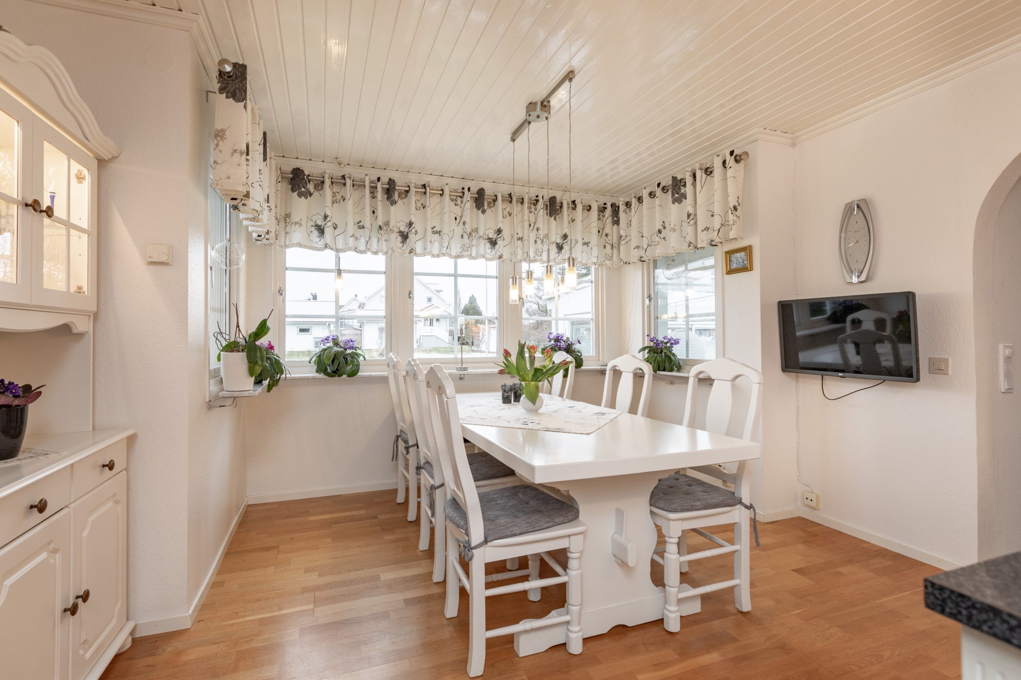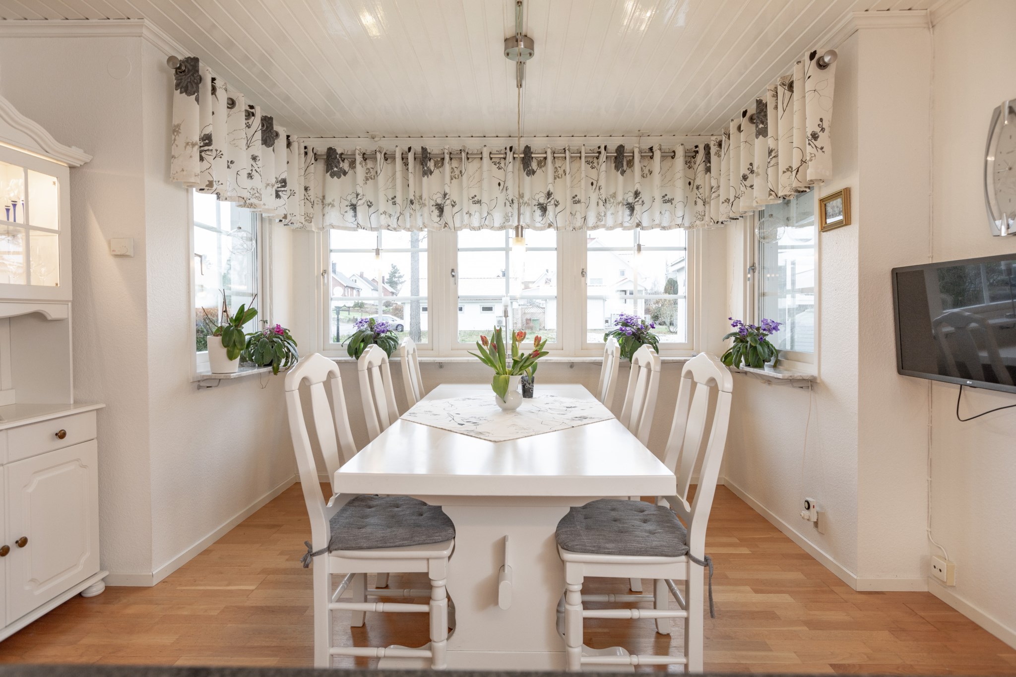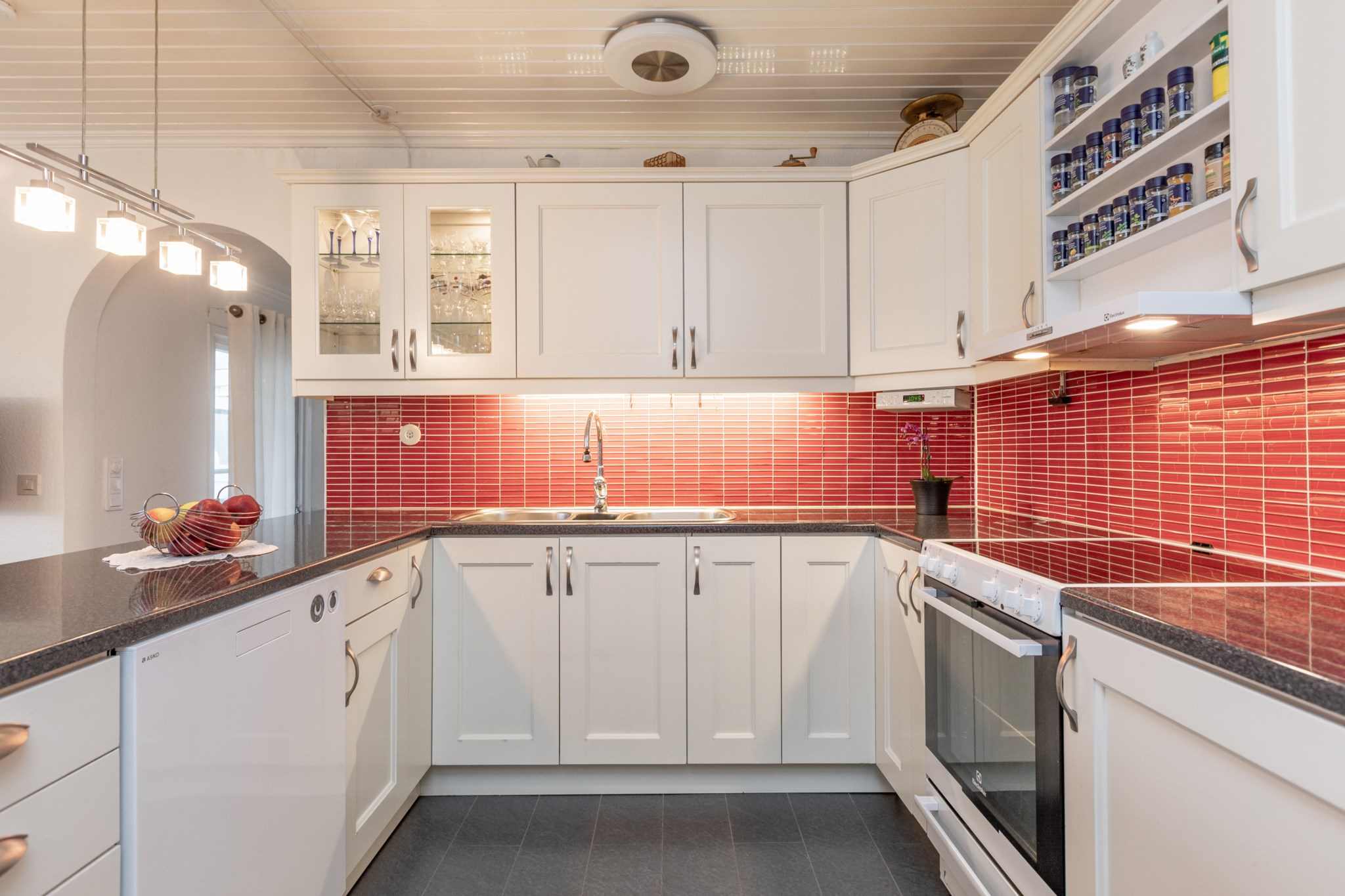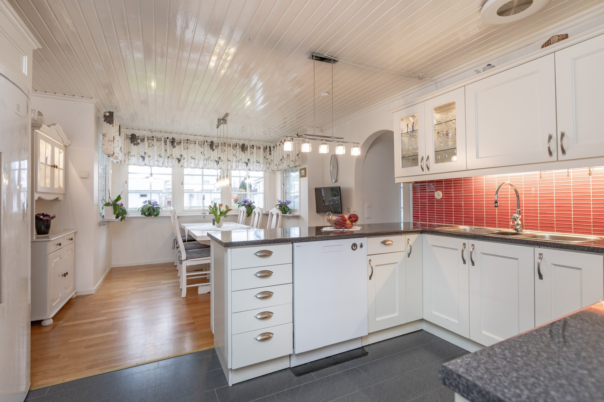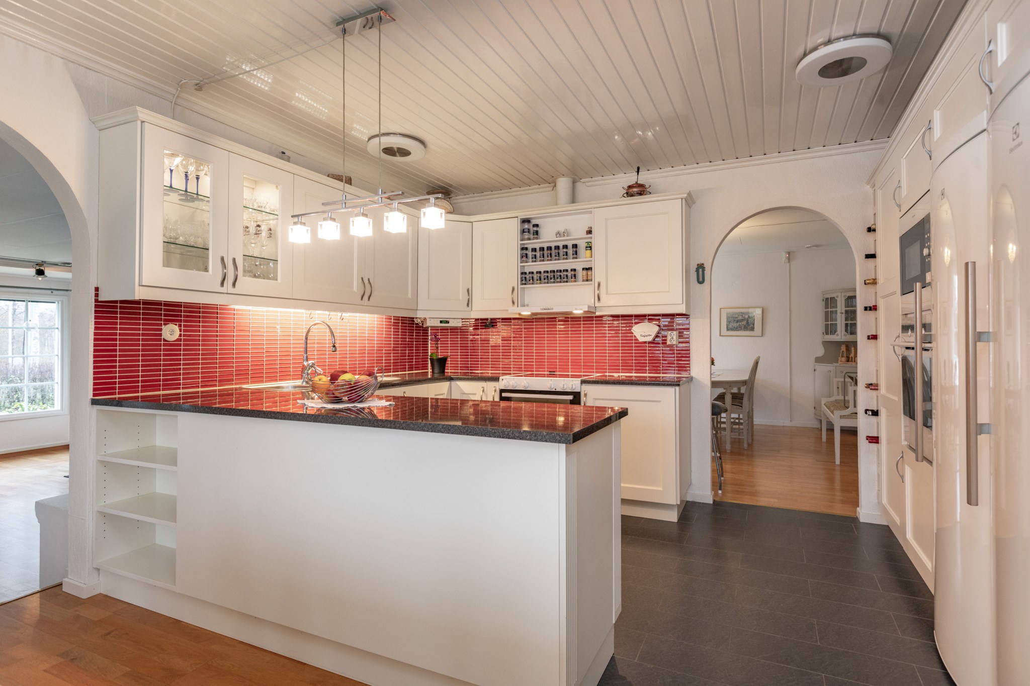 Ifrån hallen nås köket enkelt och är en plats i centrum av huset med närhet till alla sociala utrymmen. Vitt kök ifrån 2015 med bänkskivor i granit och gott om plats för matgrupp.