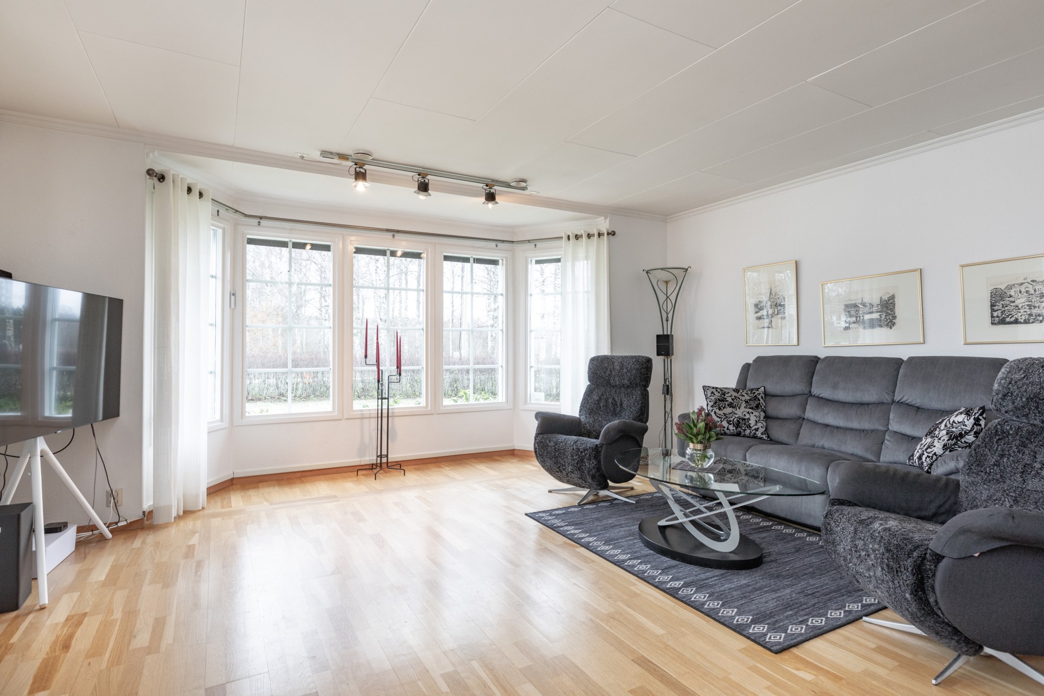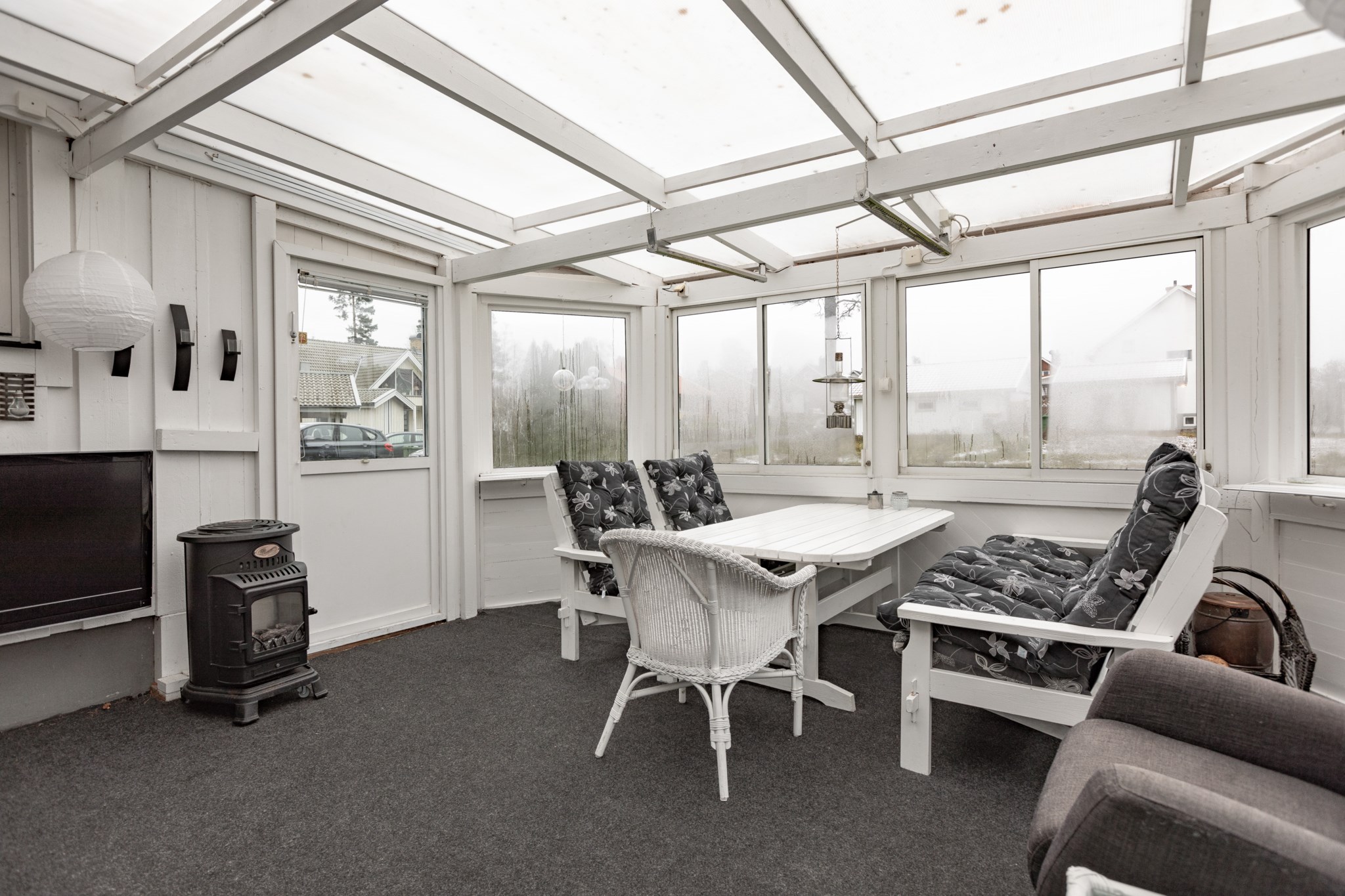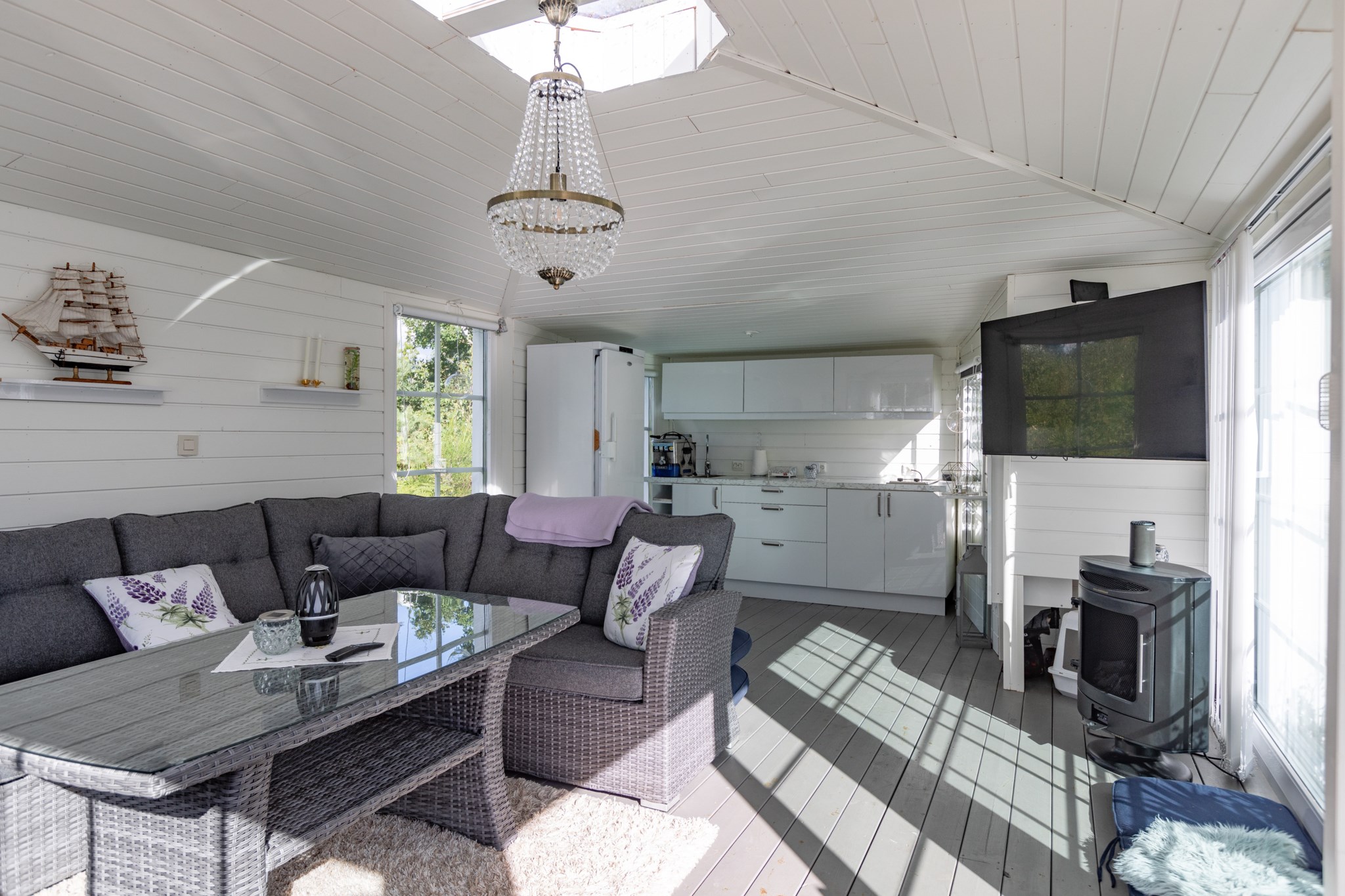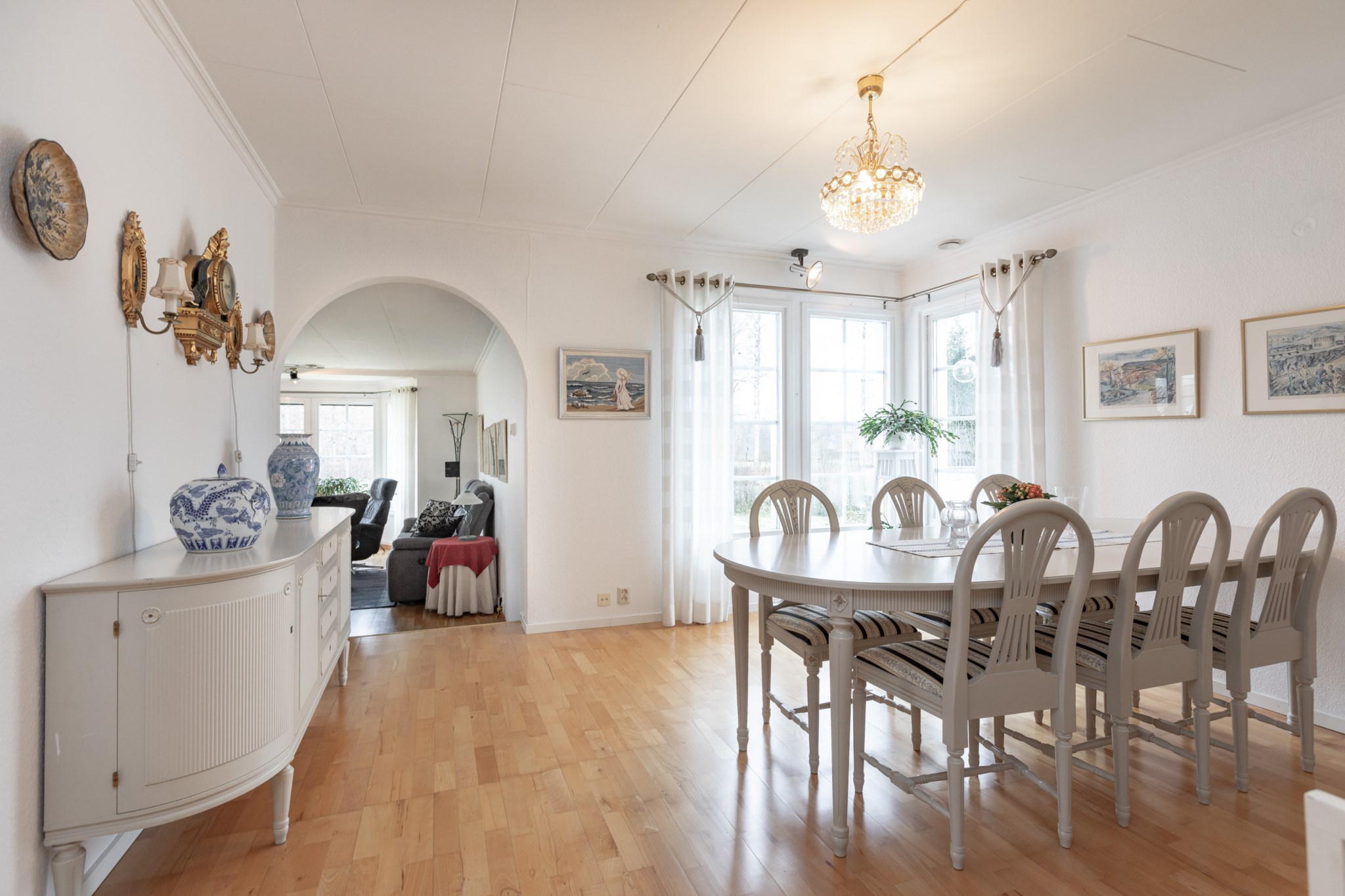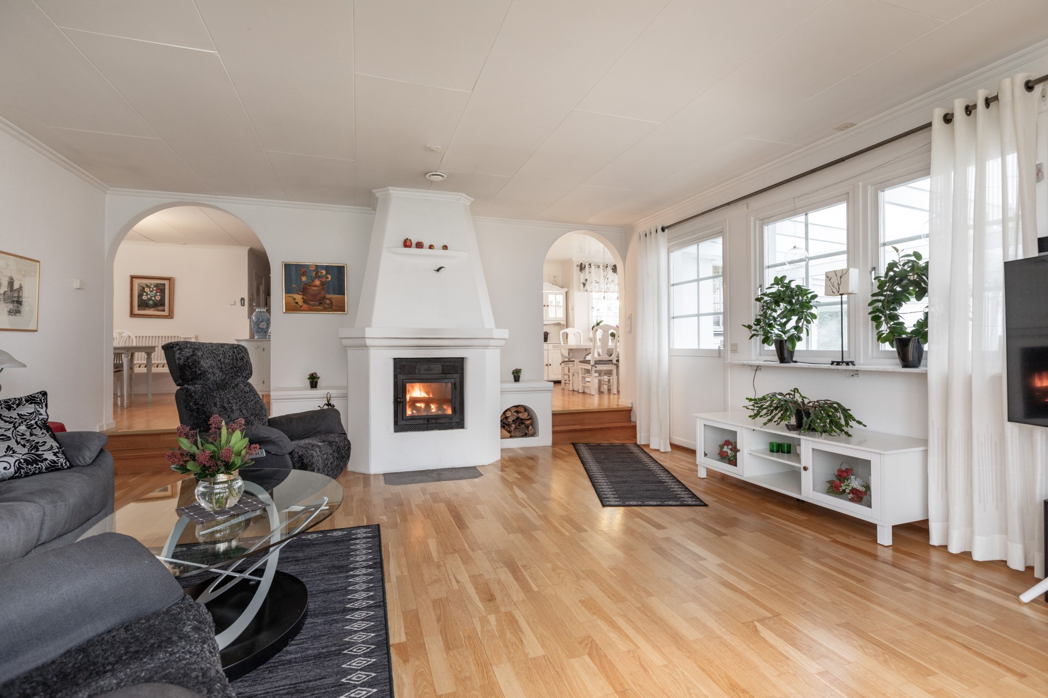 Vardagsrum med vackert burspråk som ger ett härligt ljusinsläpp och en luftig känsla. Här ifrån nås även ett allrum som idag används som matsal och blir en naturlig anslutning till vardagsrummet tack vare ett större valv emellan rummen. I vardagsrummet finns även en öppen spis med kassett som blir ett värmande komplement under vinterhalvåret och ett tillbyggt uterum som blir den naturliga platsen under sommarhalvåret.