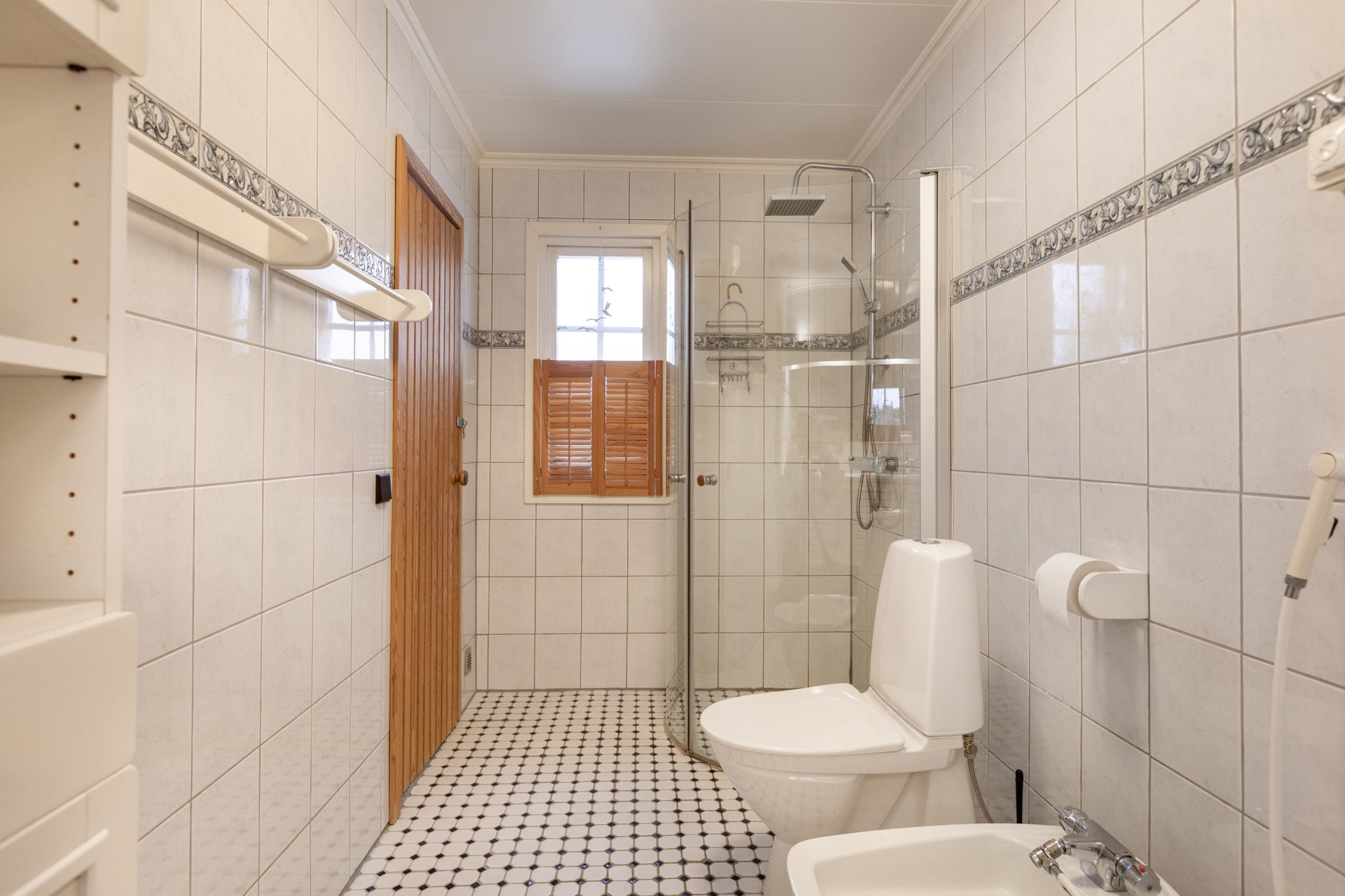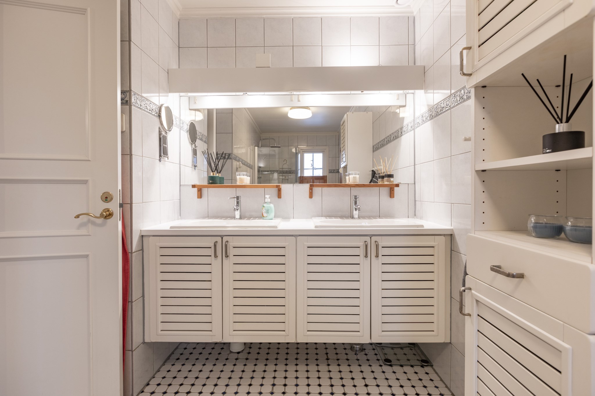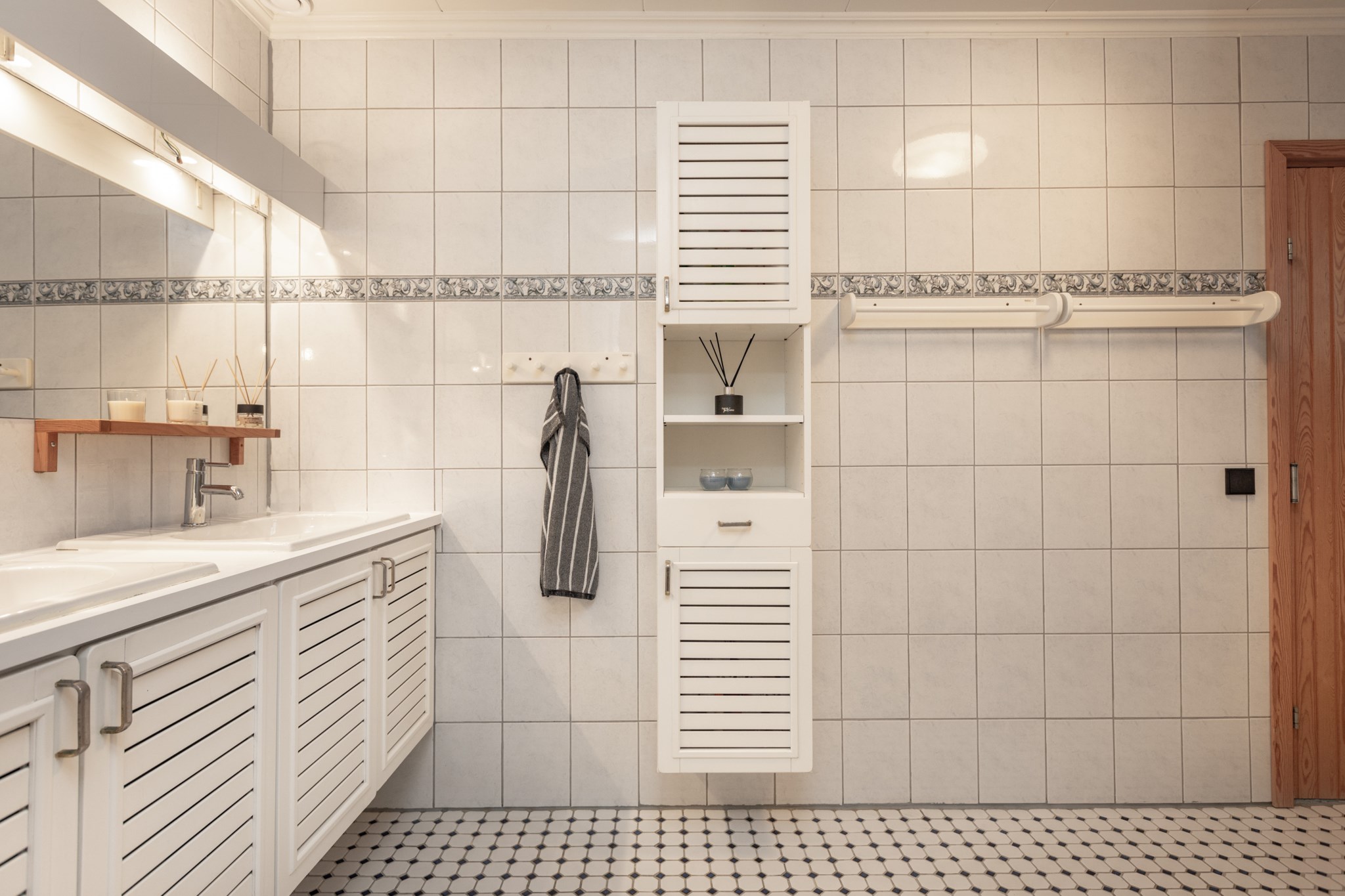 Huset har två badrum, det första med kakel och klinker samt ett badkar. Det andra lite större ligger i anslutning till huvudsovrummet och är med dubbelhandfat, dusch och även en bastu.