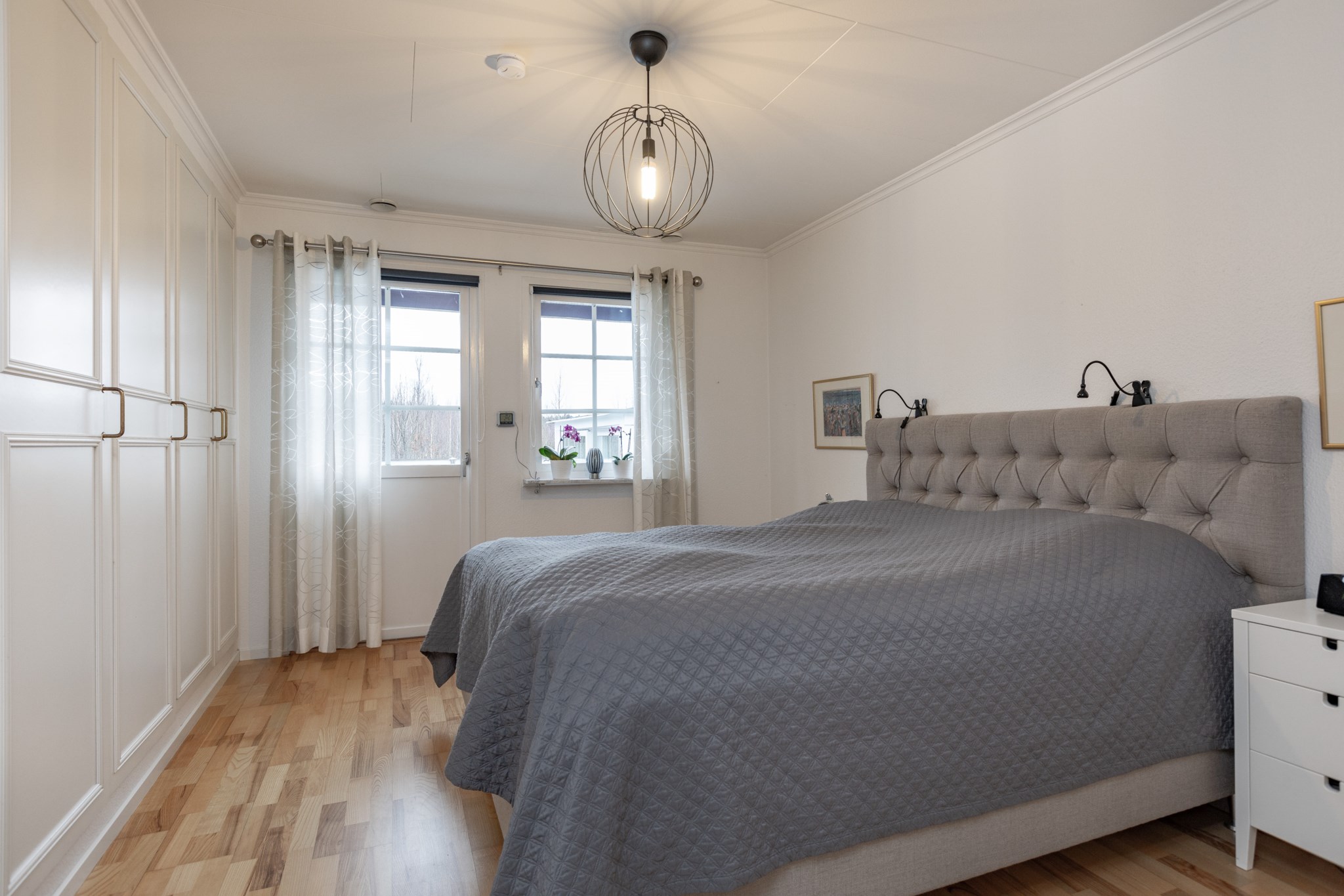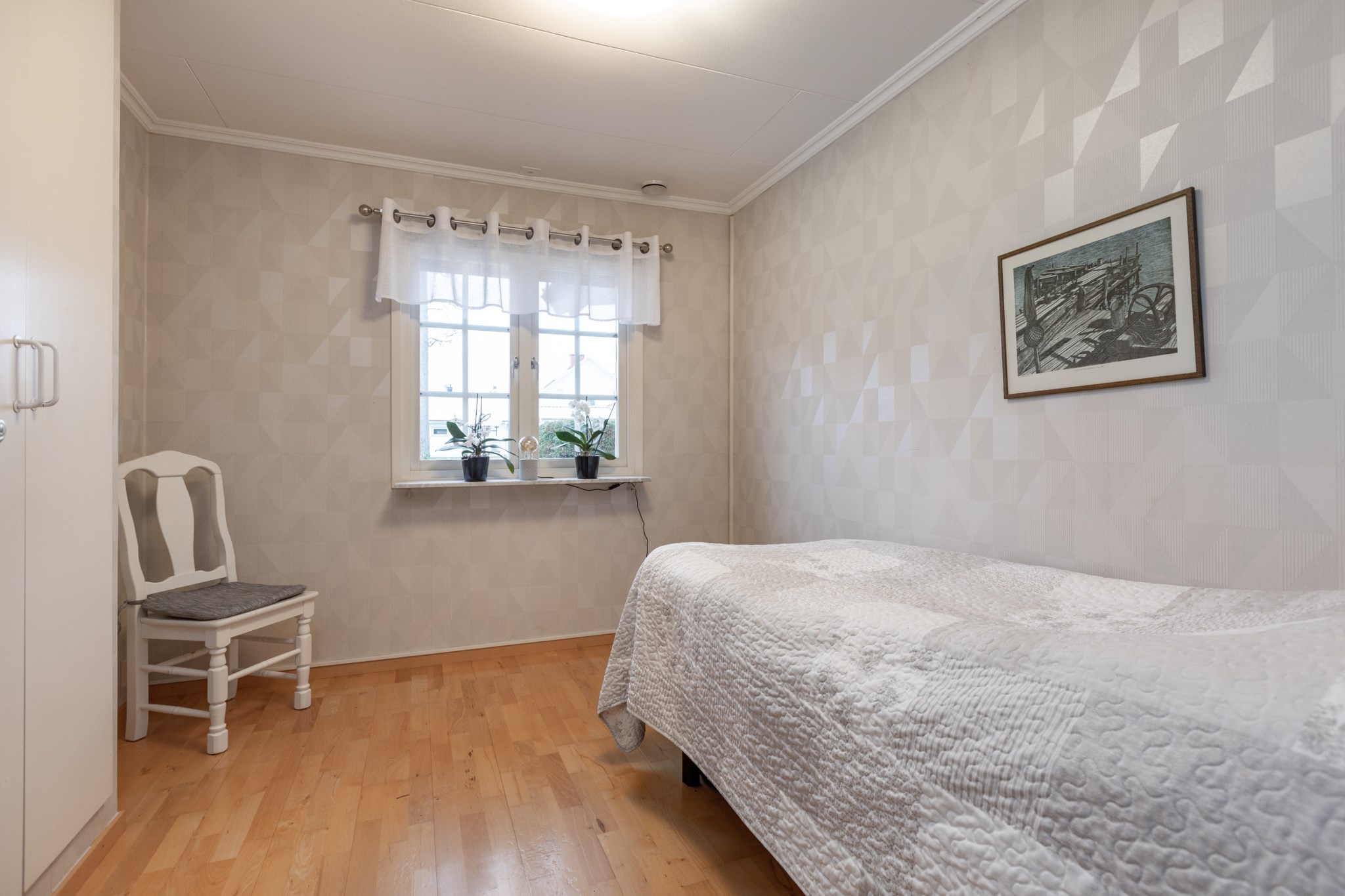 Huset har tre sovrum, varav två lite mindre och ett större med plats för dubbelsäng. Ifrån det större sovrummet nås även baksidan via en altandörr.