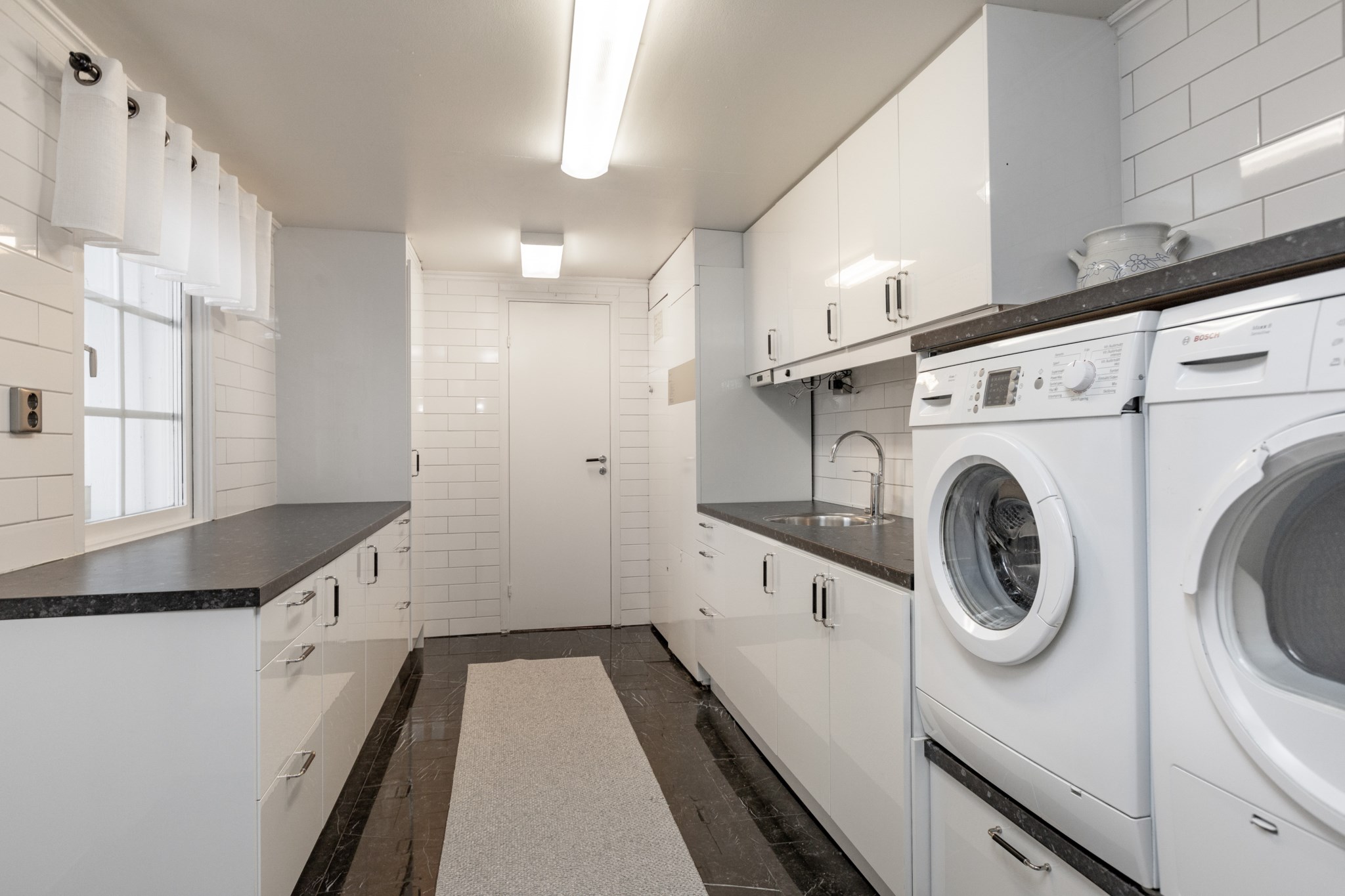 Nyligen renoverad tvättstuga med gott om arbetsyta på bägge sidor samt tvättmaskin och torktumlare som höjts upp i en mer ergonomisk arbetshöjd.
