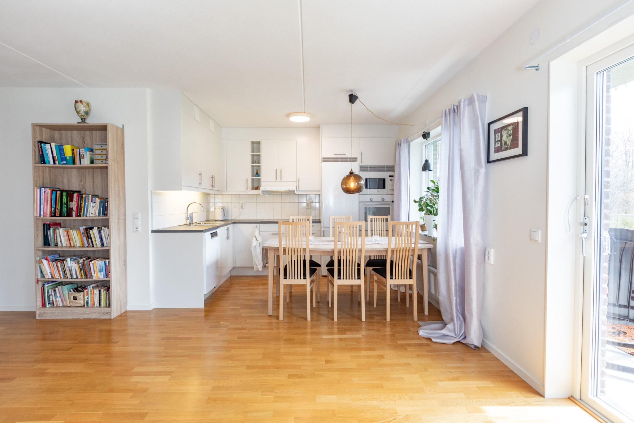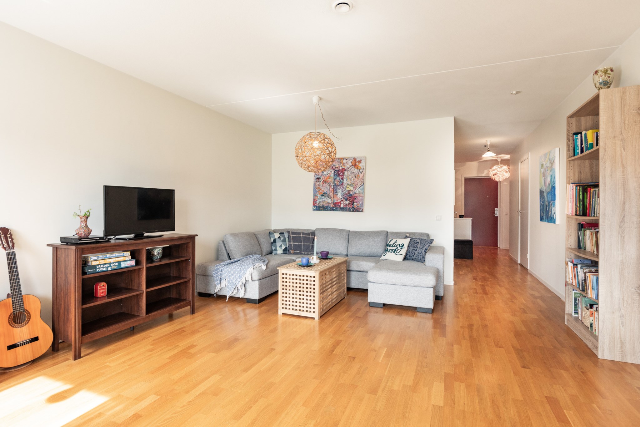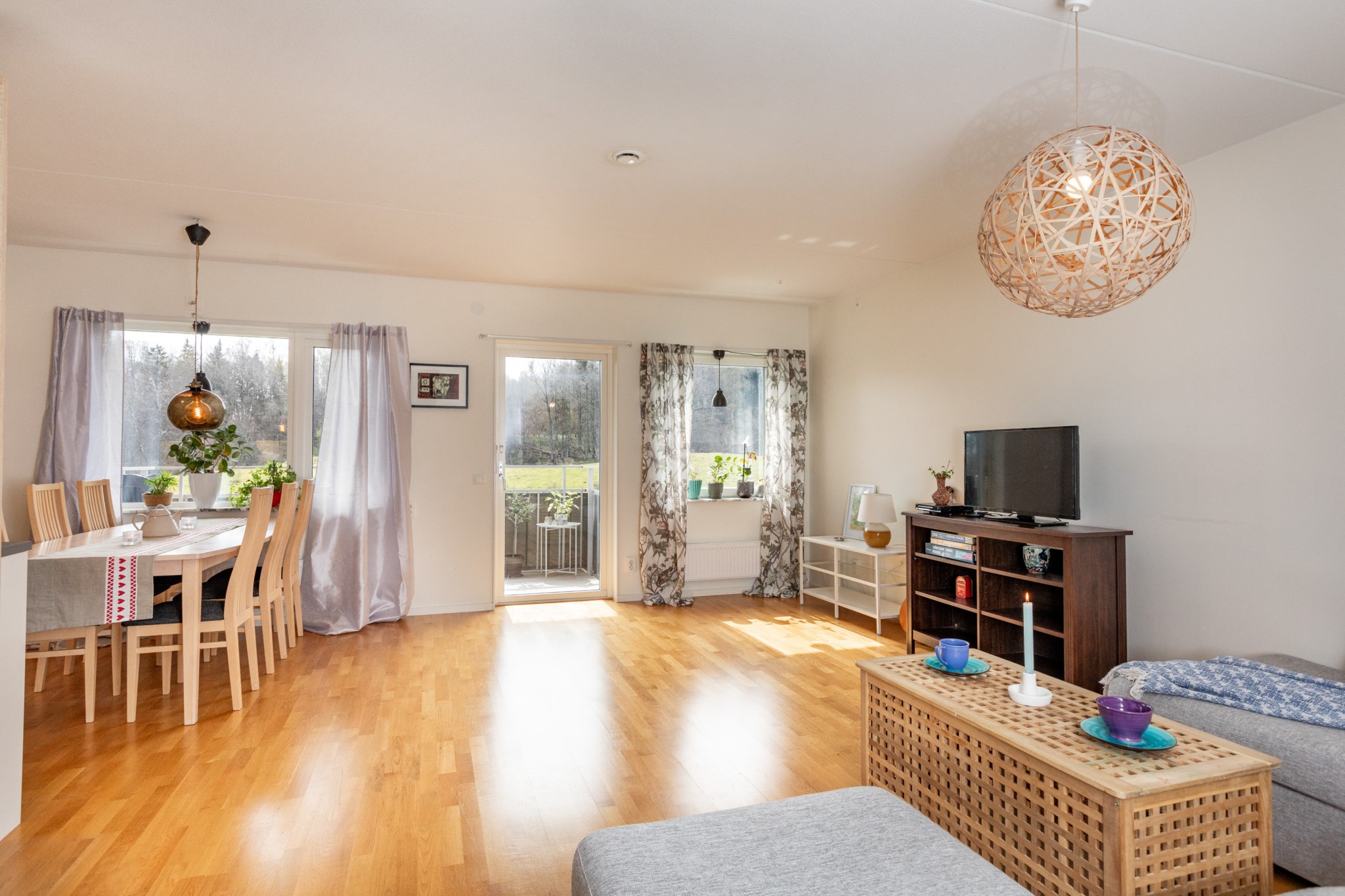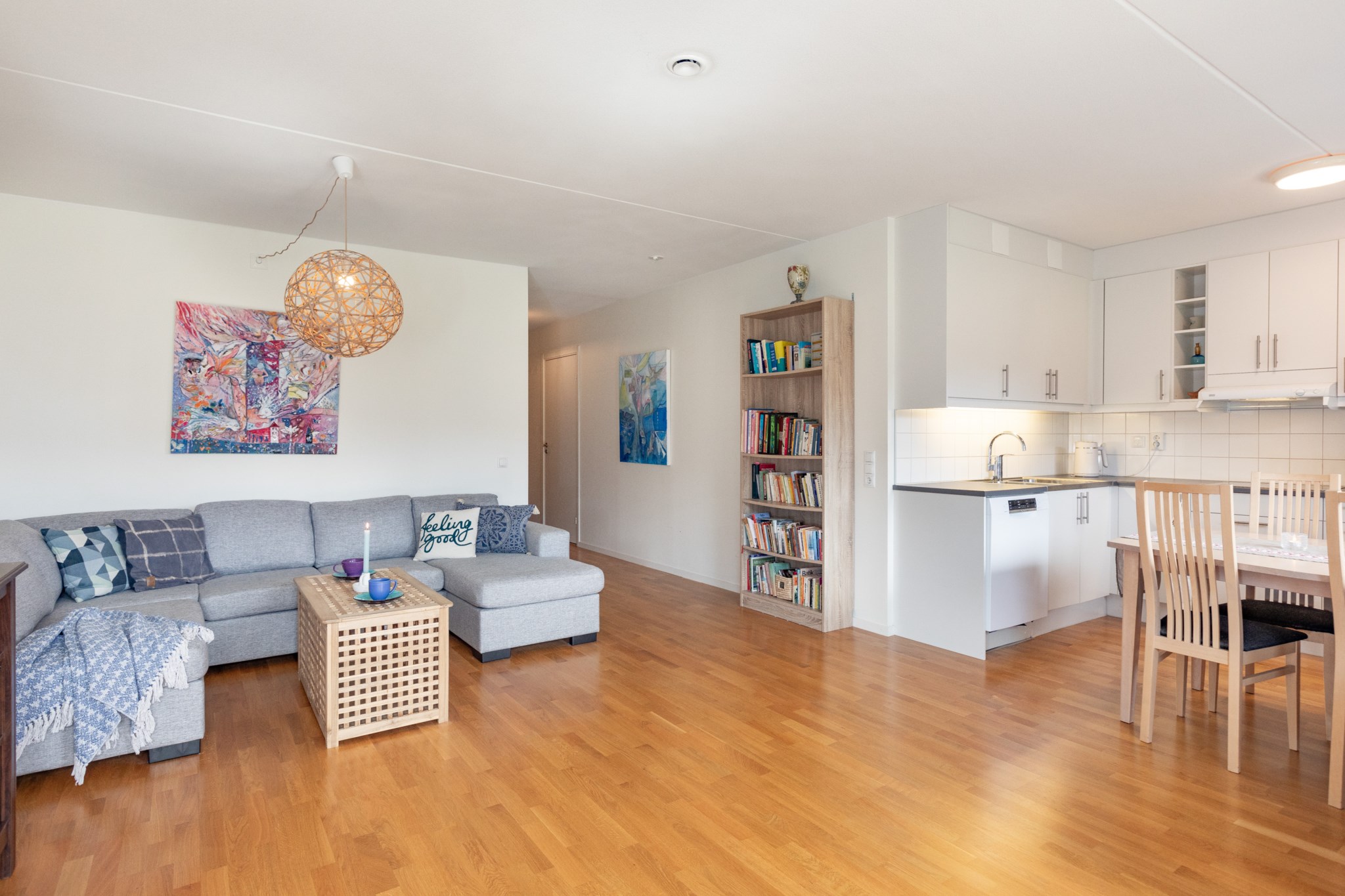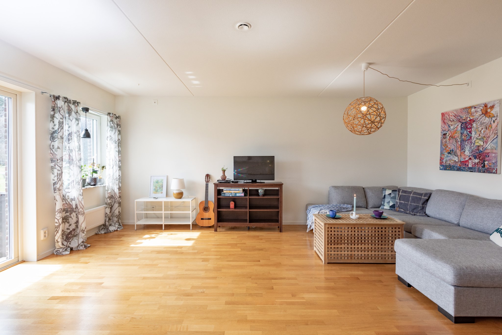 Vardagsrum med vita väggar och samma trägolv som i övriga lägenheten vilket ger ett enhetligt intryck. Planlösningen är öppen mot köket och utgången till balkongen med den stora fönsterdörren ger en härlig känsla av rymd i lägenheten.