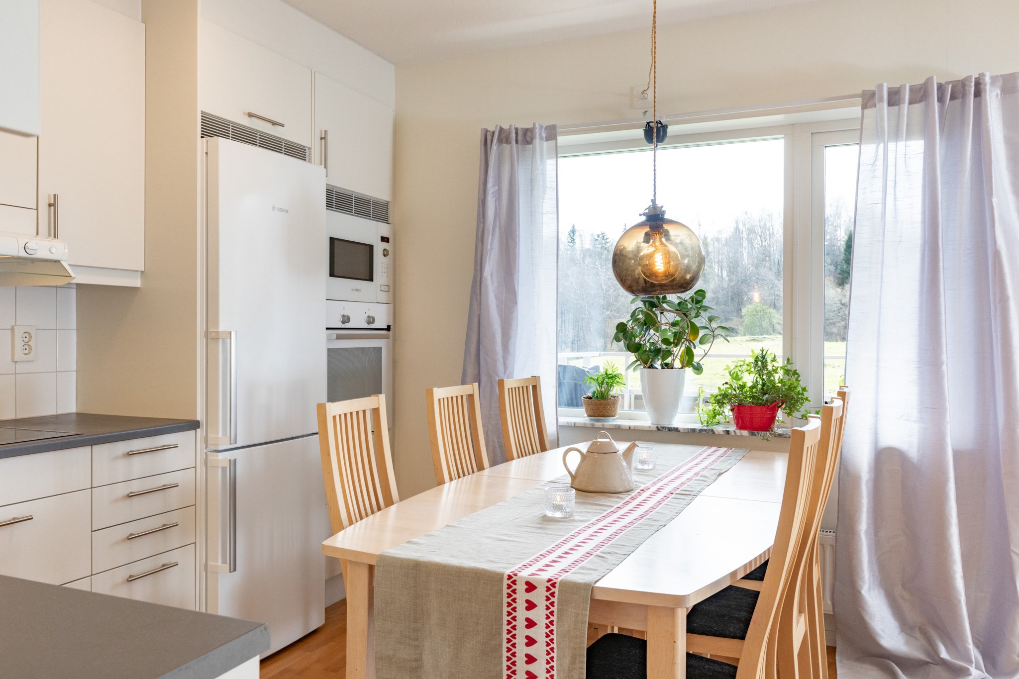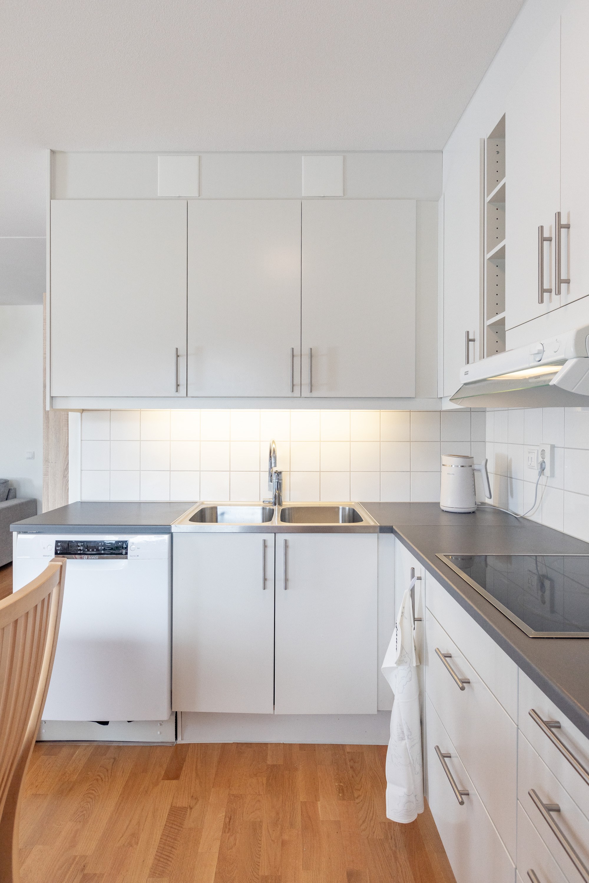 Kök som ligger i öppen planlösning med vardagsrummet. Ljust ocgh stilrent kök med sedvanliga vitvaror som kyl/frys, diskmaskin, ugn, inbyggd mikro och spisfläkt. Matplats för upp till 6 personer.