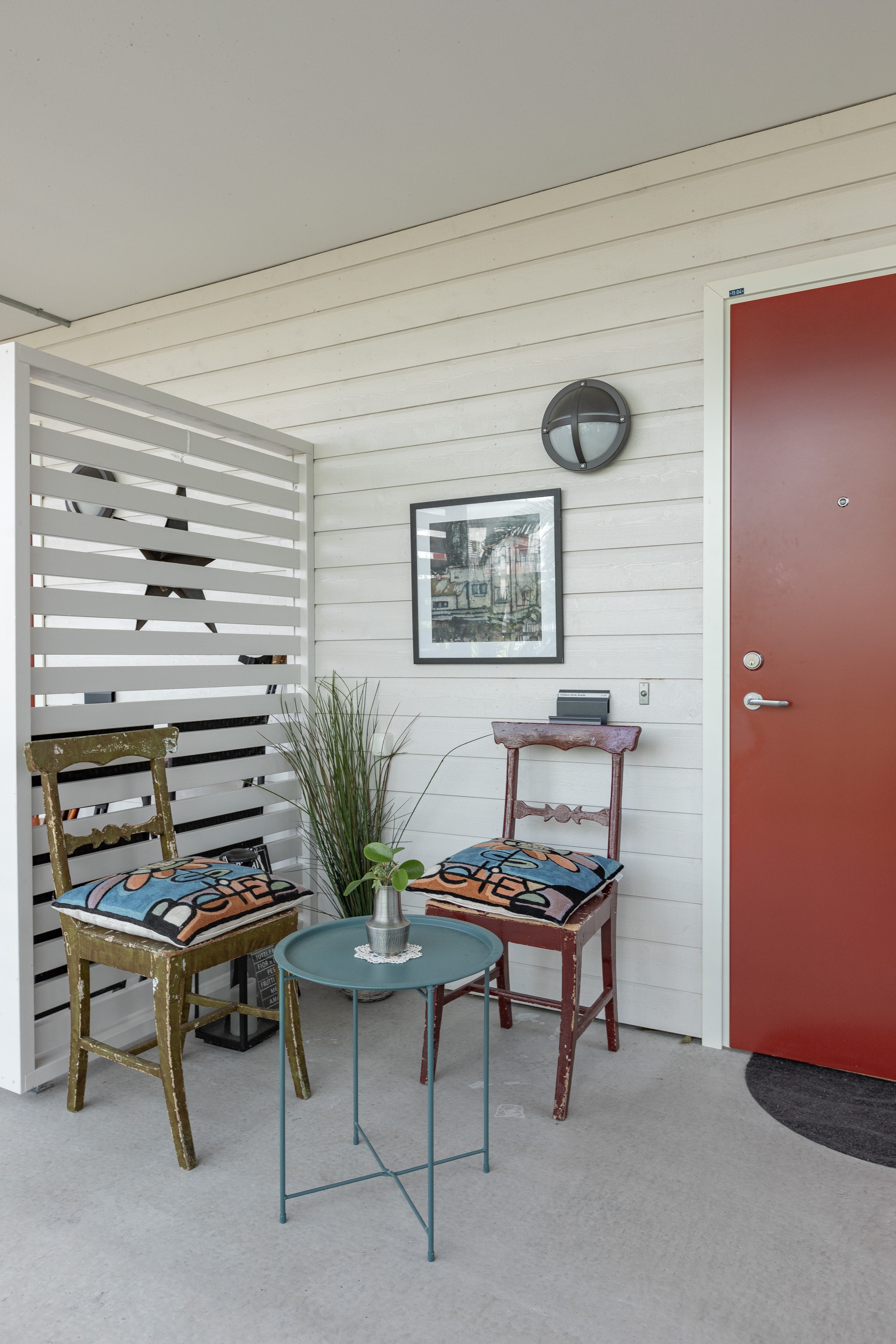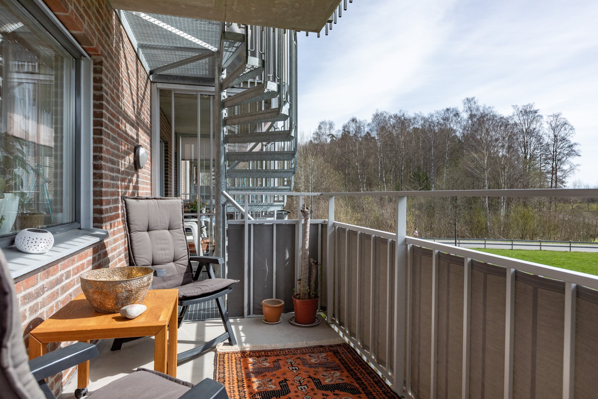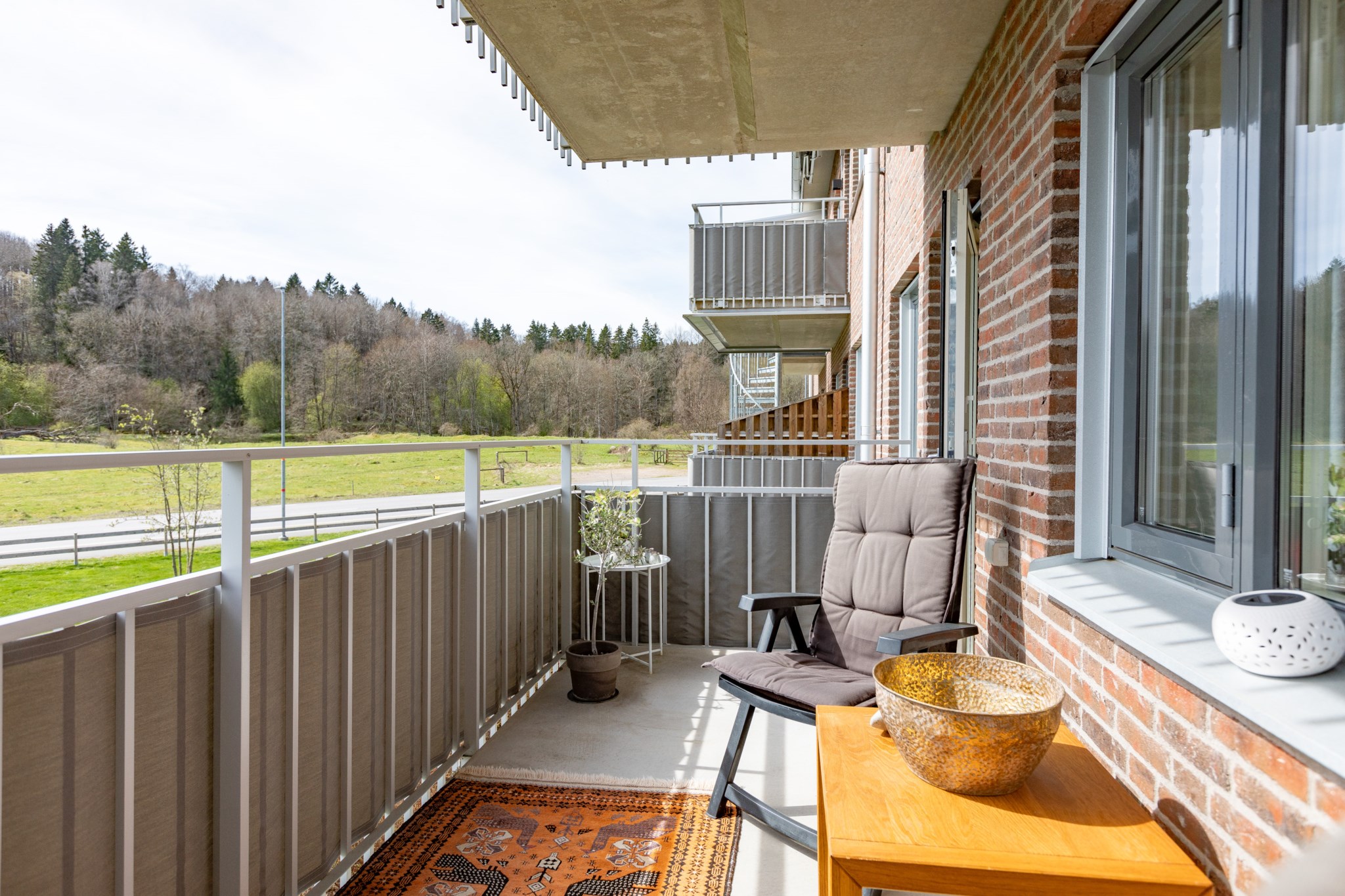 Utöver alla gemensamma uteplatser i vinterträdgården finns även en egen uteplats utanför ytterdörren. Och under den varmare delen av året finns en fin balkong i soligt söderläge att njuta av med utiskt över den vackra närliggande naturen.