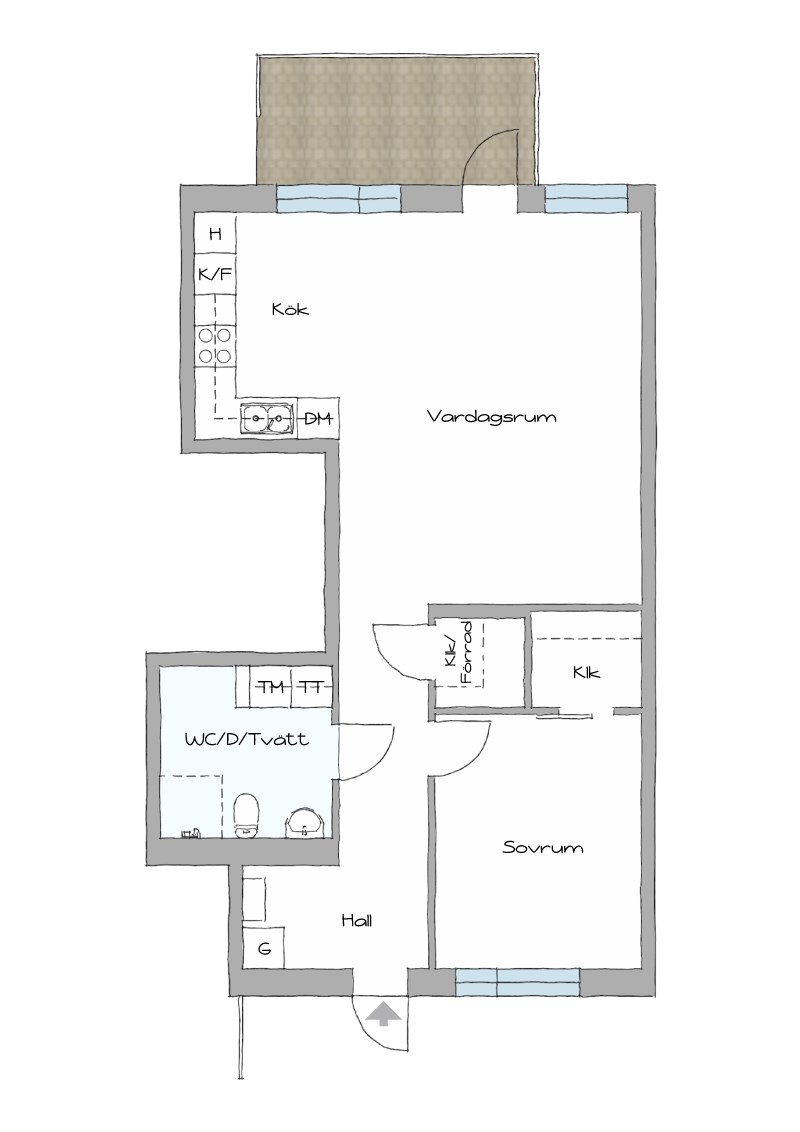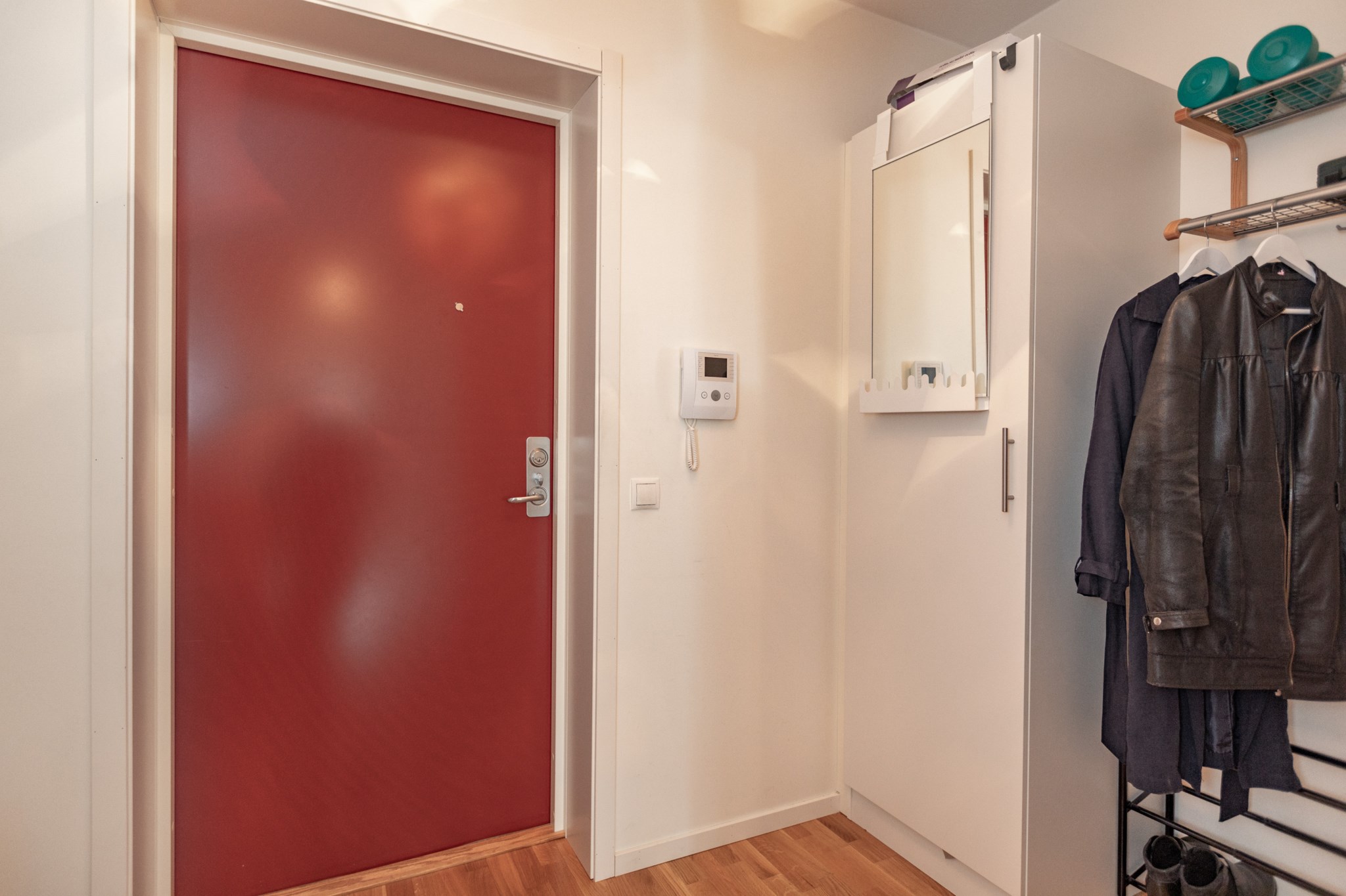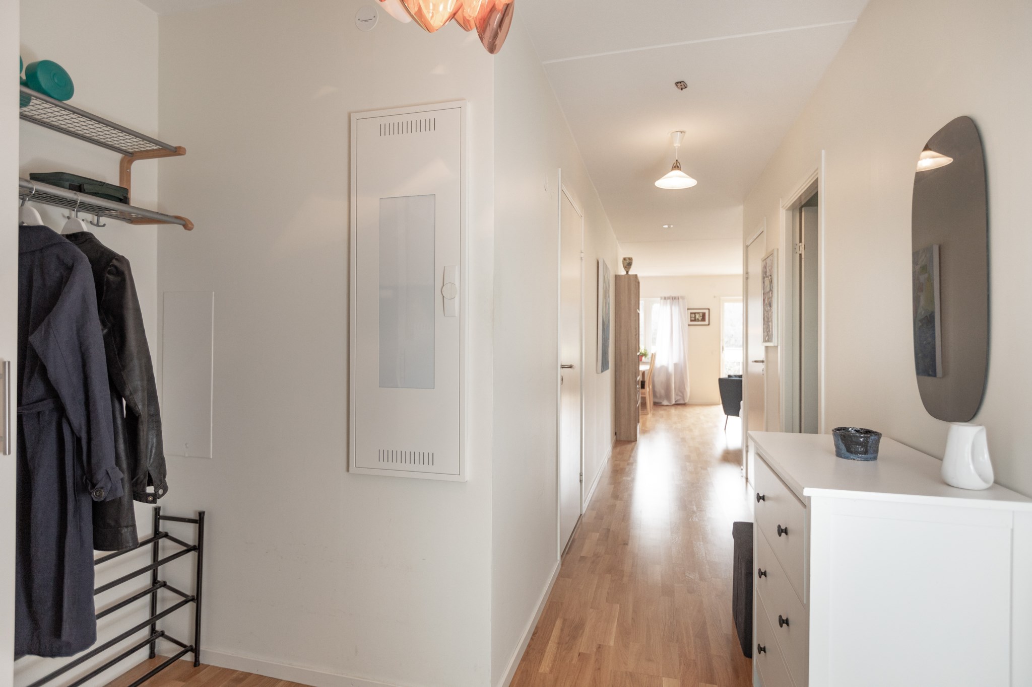 Välkommen in i hallen och denna trivsamma tvårumslägenhet. Avhängning görs enkelt med både hatthylla och garderob direkt till vänster.