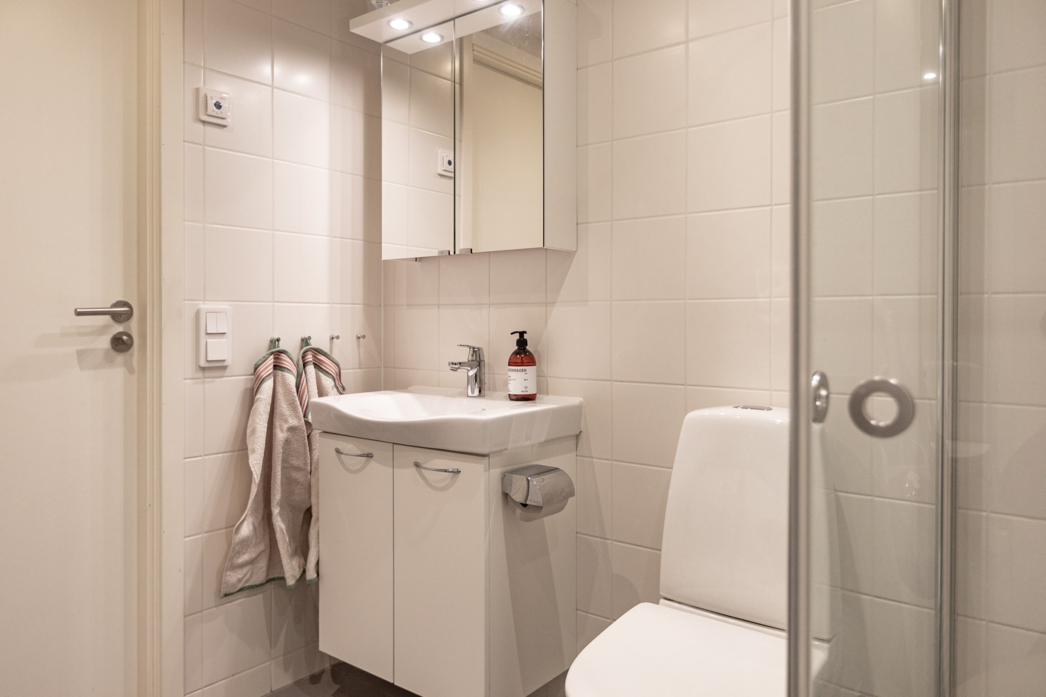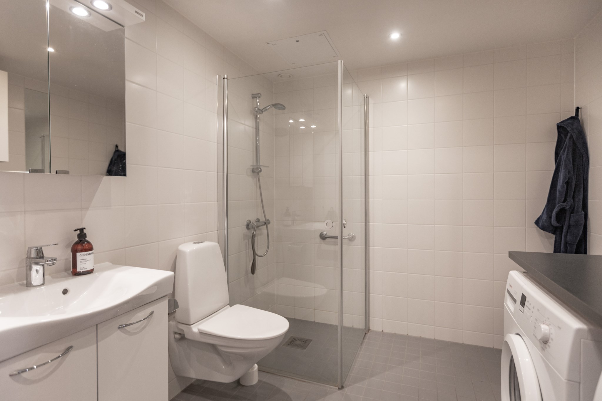 Helkaklat badrum i stilrent utförande med underliggande golvvärme som ger ett behagligt golv att kliva runt på. Badrumet dubblerar även som tvättstuga och har både en tvättmaskin och torktumlare installerat.