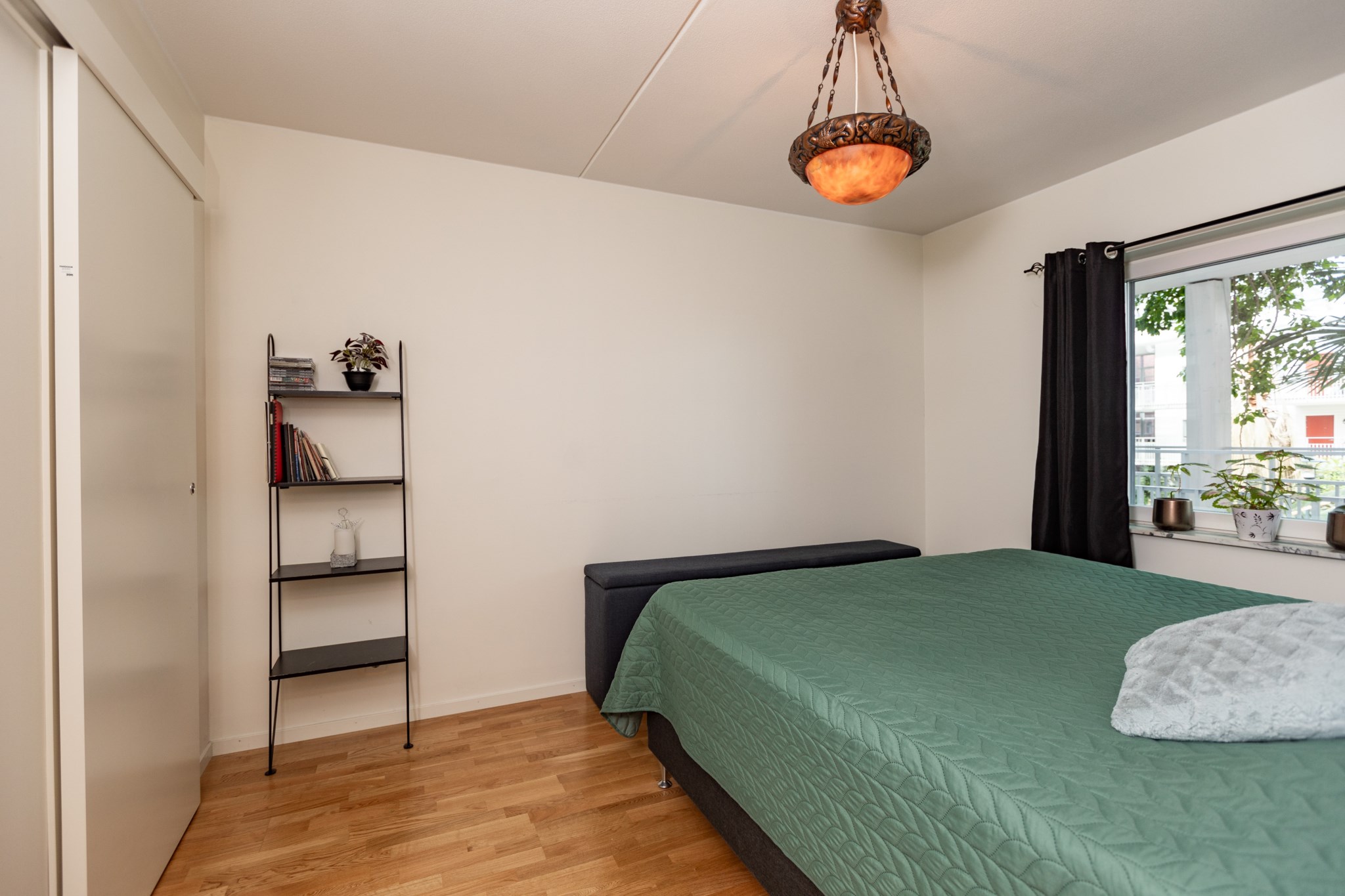 Rymligt sovrum med plats för både en dubbelsäng och bra förvaring med en stor garderob som löper utmed ena väggen i rummet.
