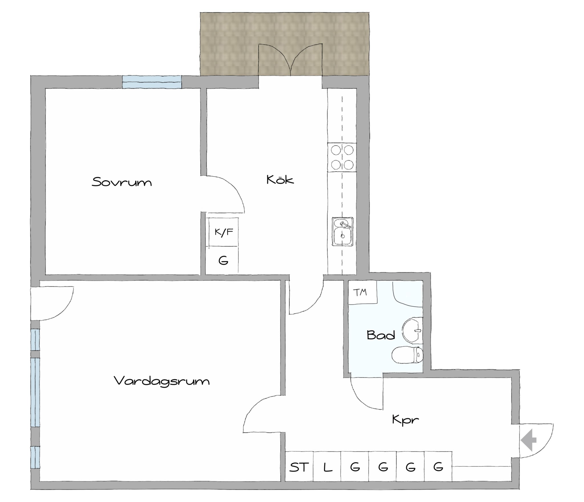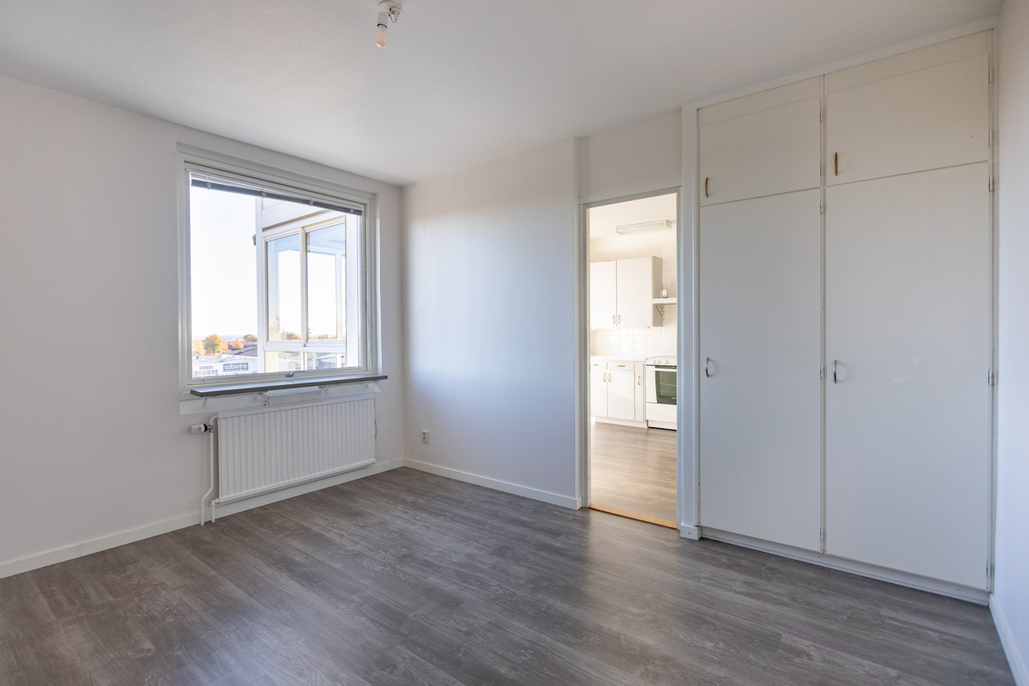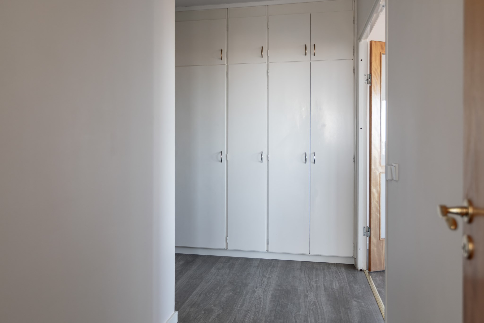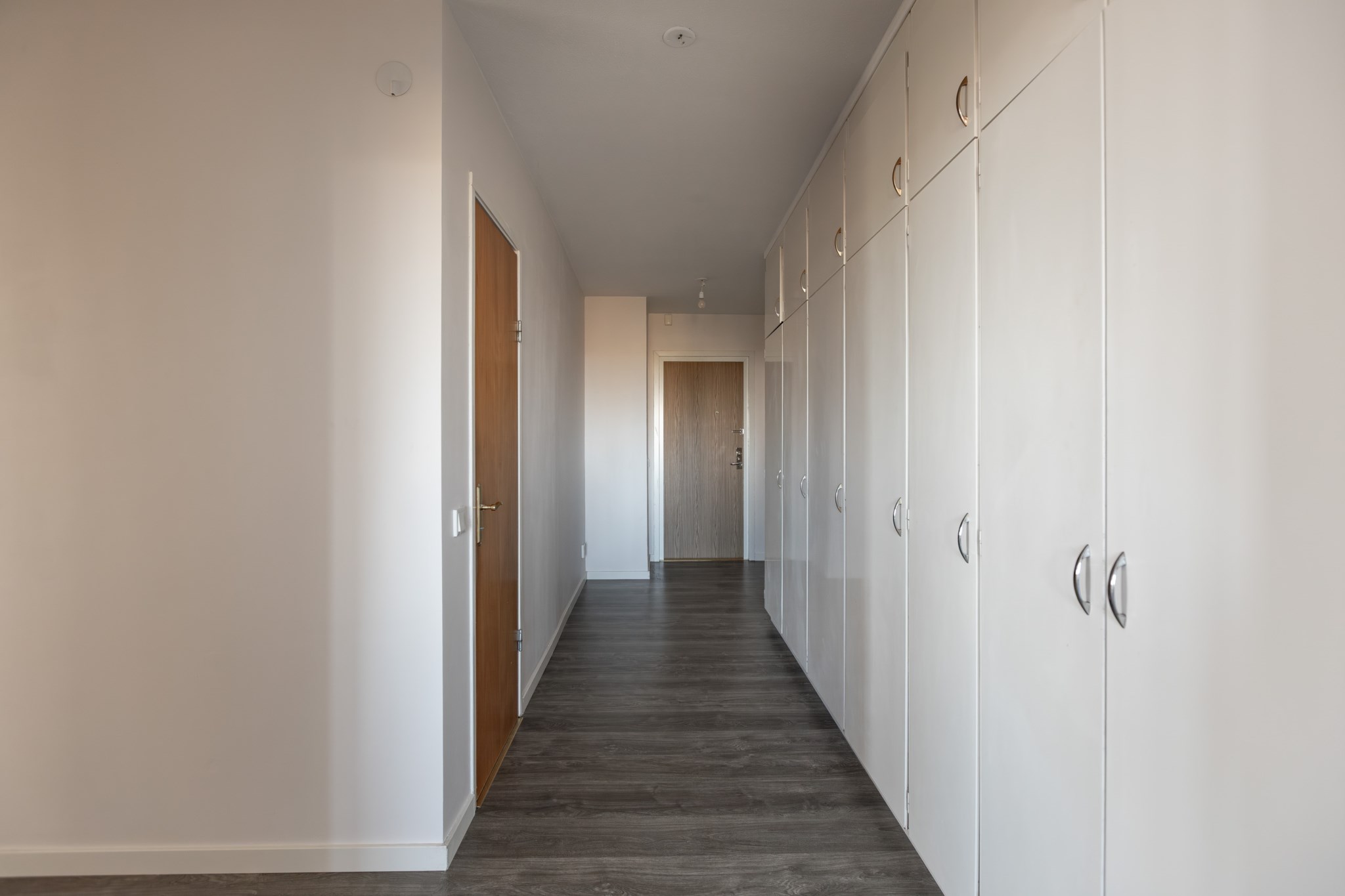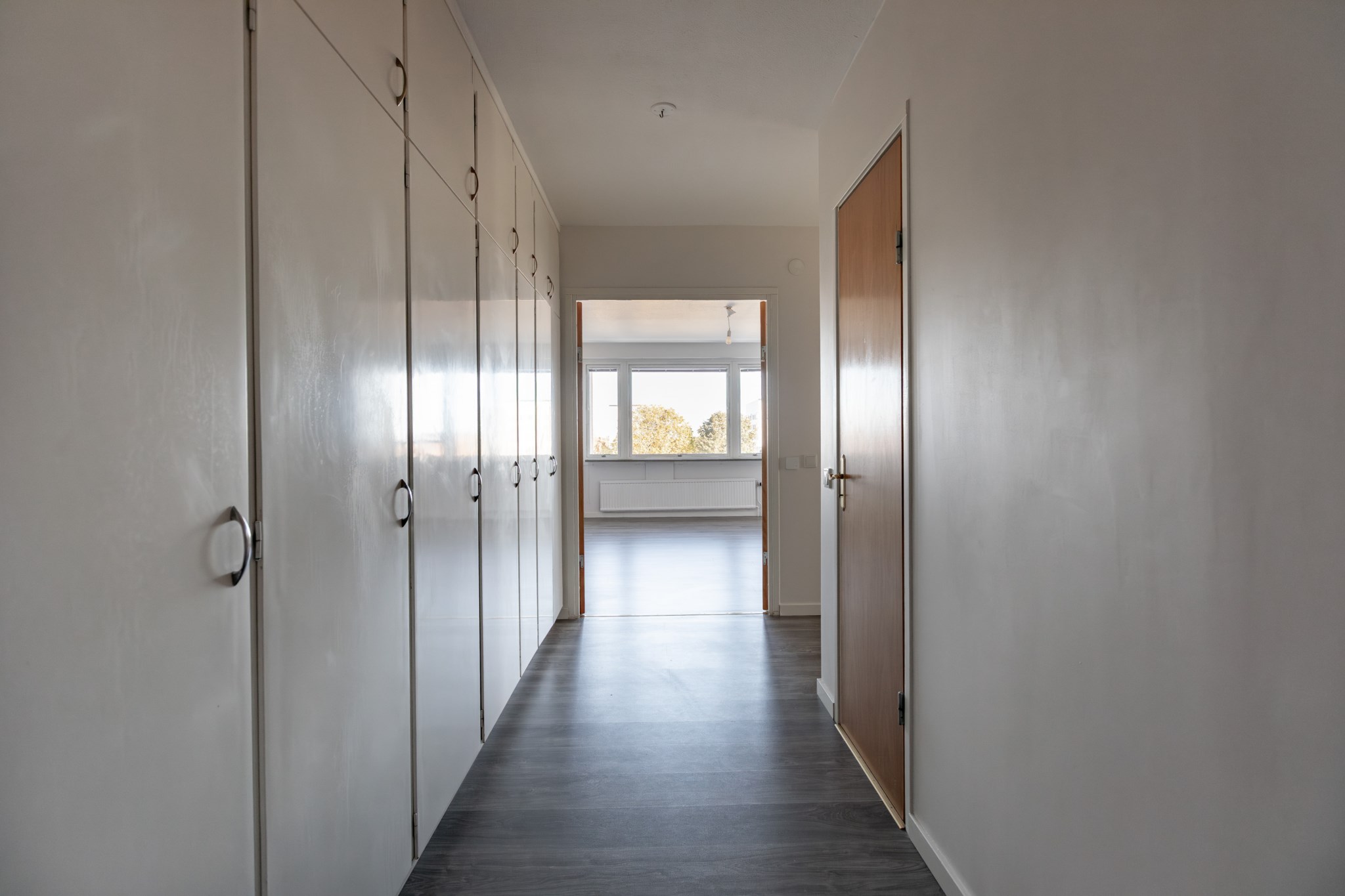 På sjätte våning tar vi klivet in i hallen och denna tvåa som bjuder på både fantastisk utsikt och ett välvårdat inre. Golvet sätter direkt tonen för lägenheten och löper enhetligt vidare genom hela lägenheten. Till vänster finner du en rymlig garderob som erbjuder generöst med förvaringsmöjligheter, perfekt för att hålla dina ytterkläder och skor organiserade och utom synhåll.