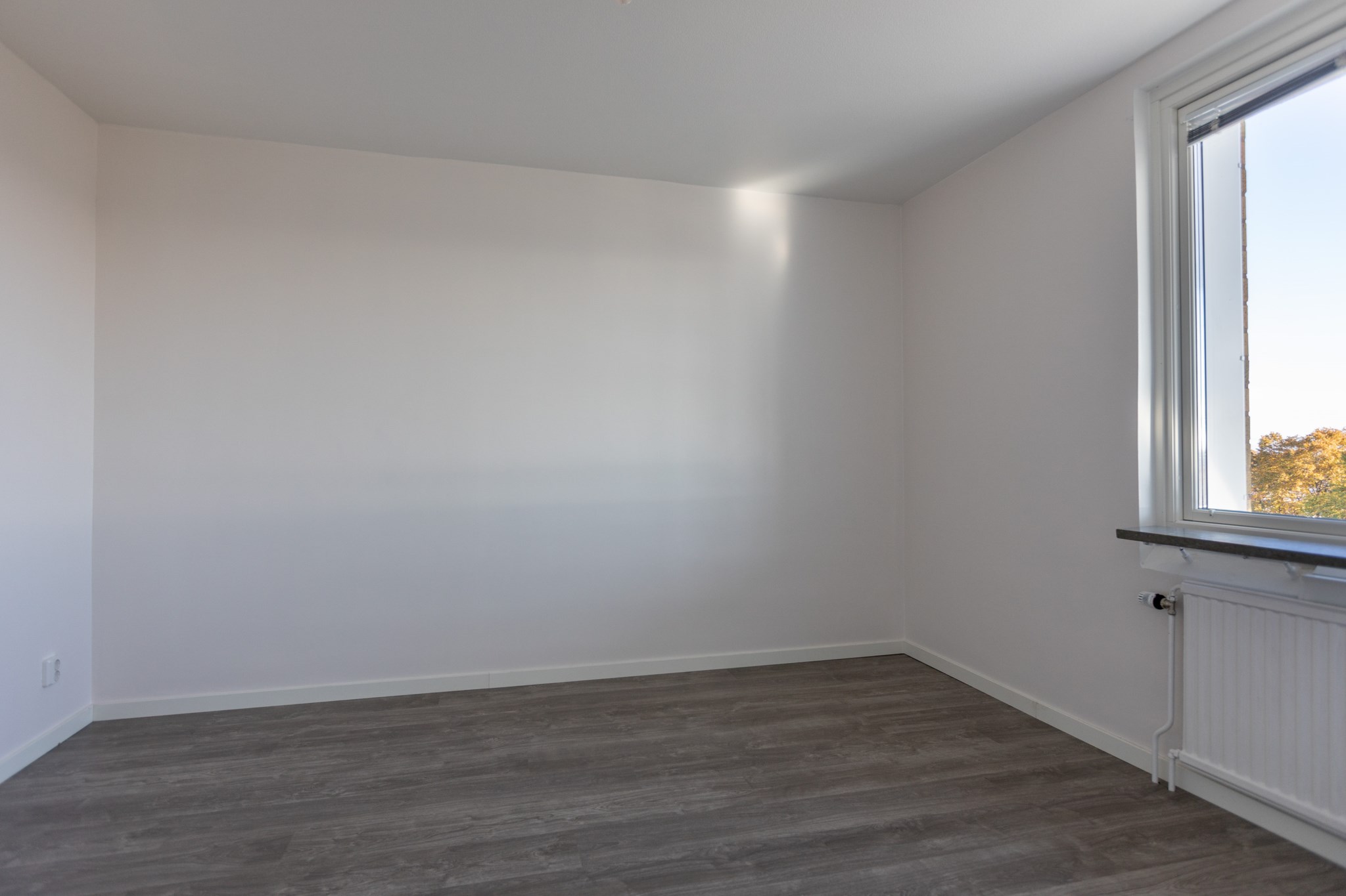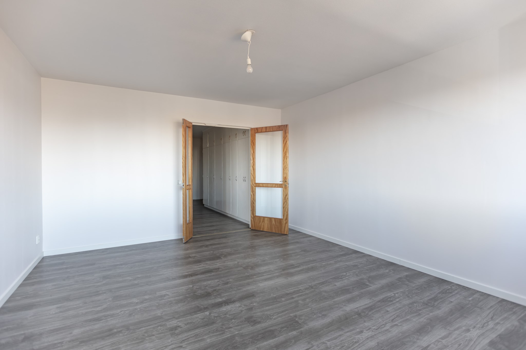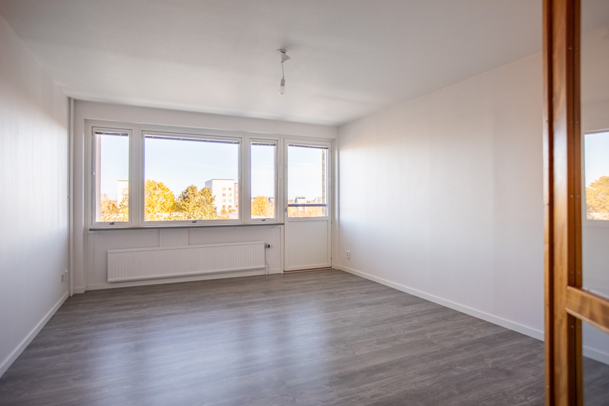 Rymligt och lättmöblerat vardagsrum med neutrala färger som skapar en harmonisk helhet. Det stilrena golvet löper genom hela lägenheten och bidrar till ett enhetligt och luftigt intryck. Här finns även utgång till en fransk balkong som ger fint ljusinsläpp, möjlighet till vädring och en trivsam utsikt över omgivningen.