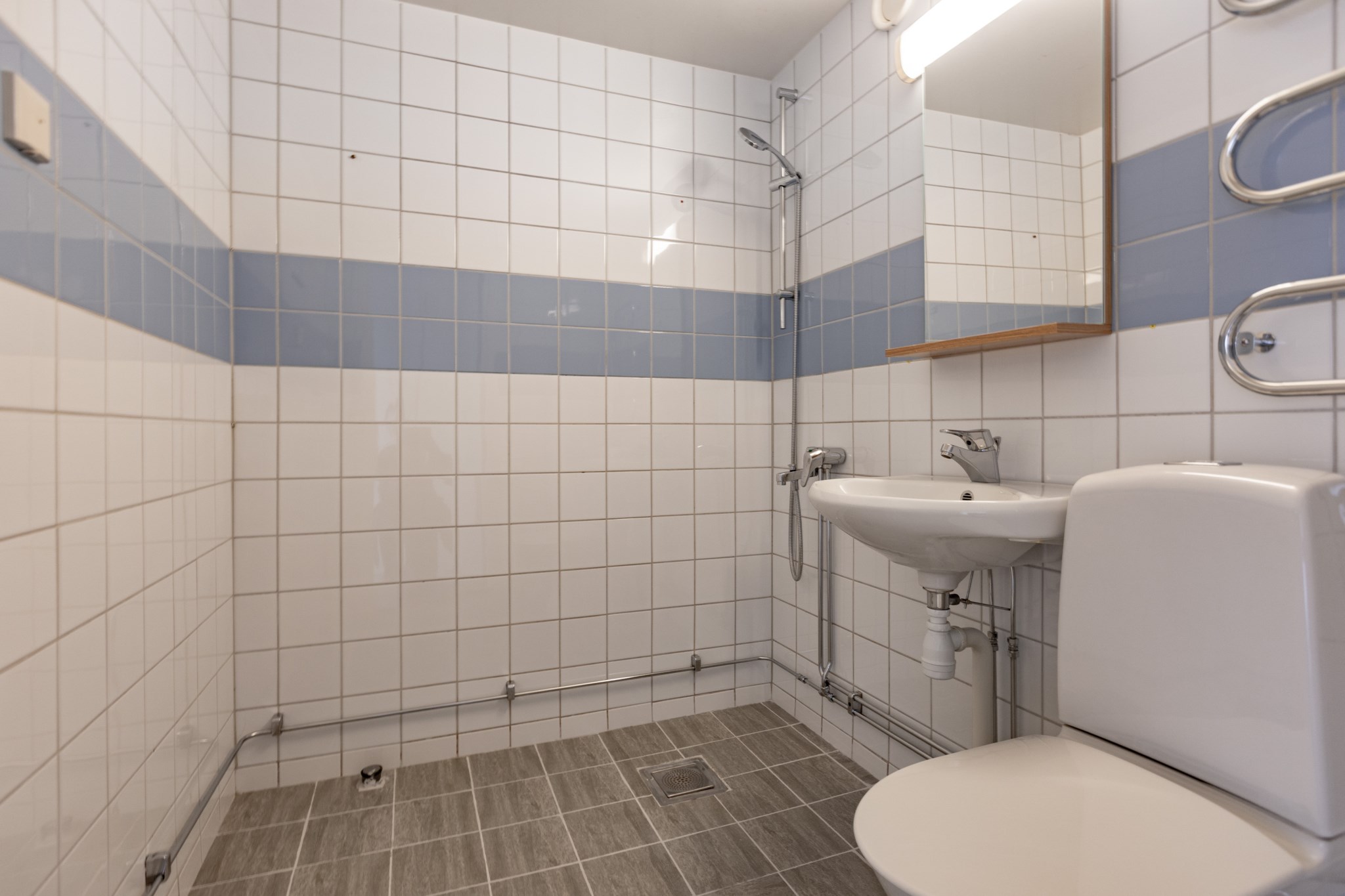 Helkaklat badrum med duschhörna, wc samt handfat med spegelskåp ovanför. Här finns även möjlighet att inreda som tvättstuga då vatten, avlopp och el är förberett för tvättmaskin.