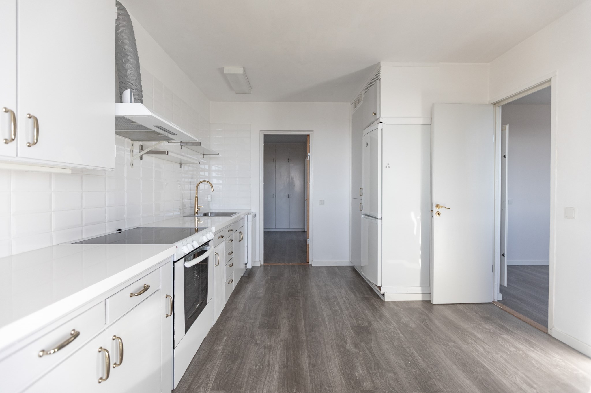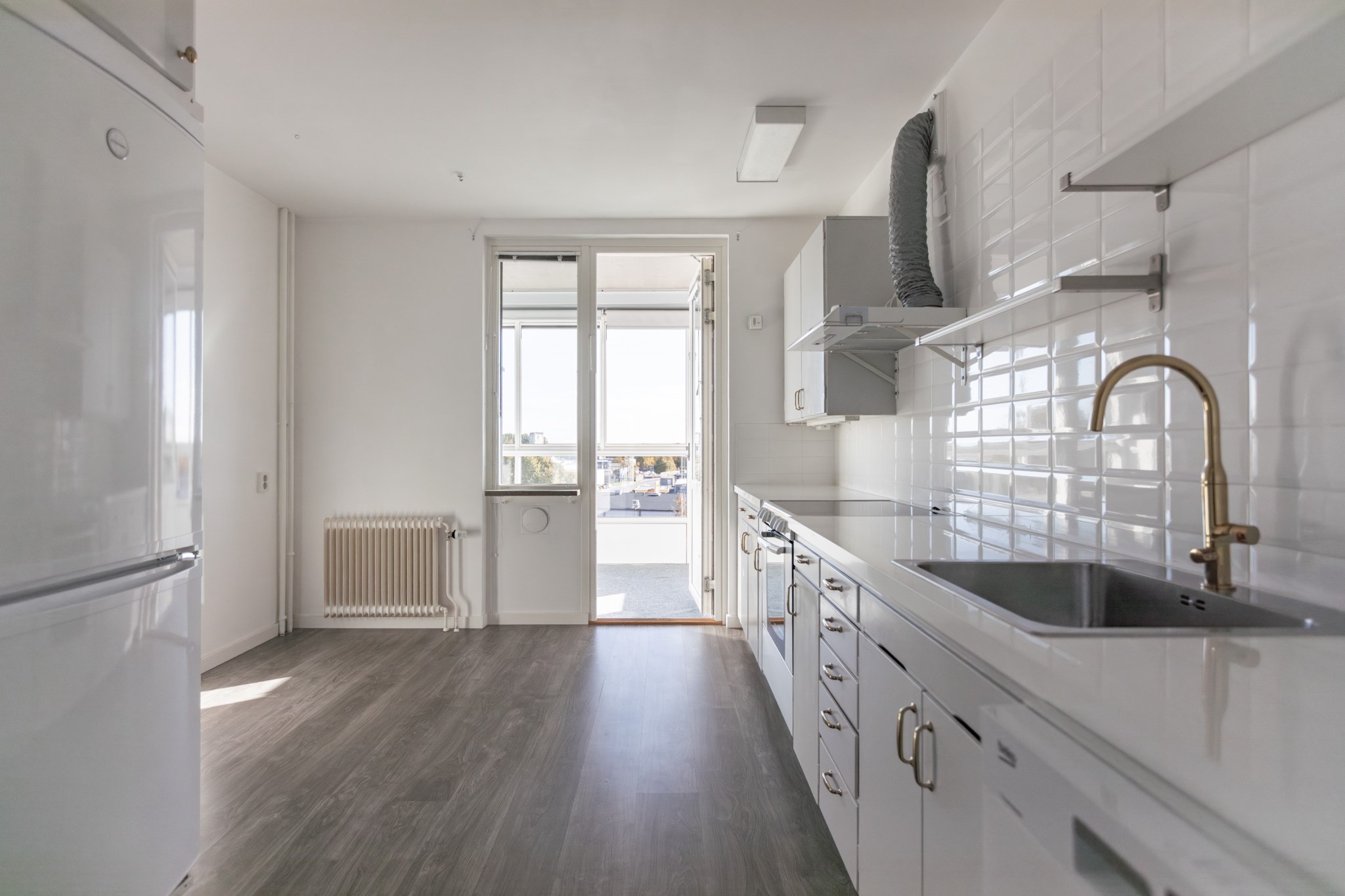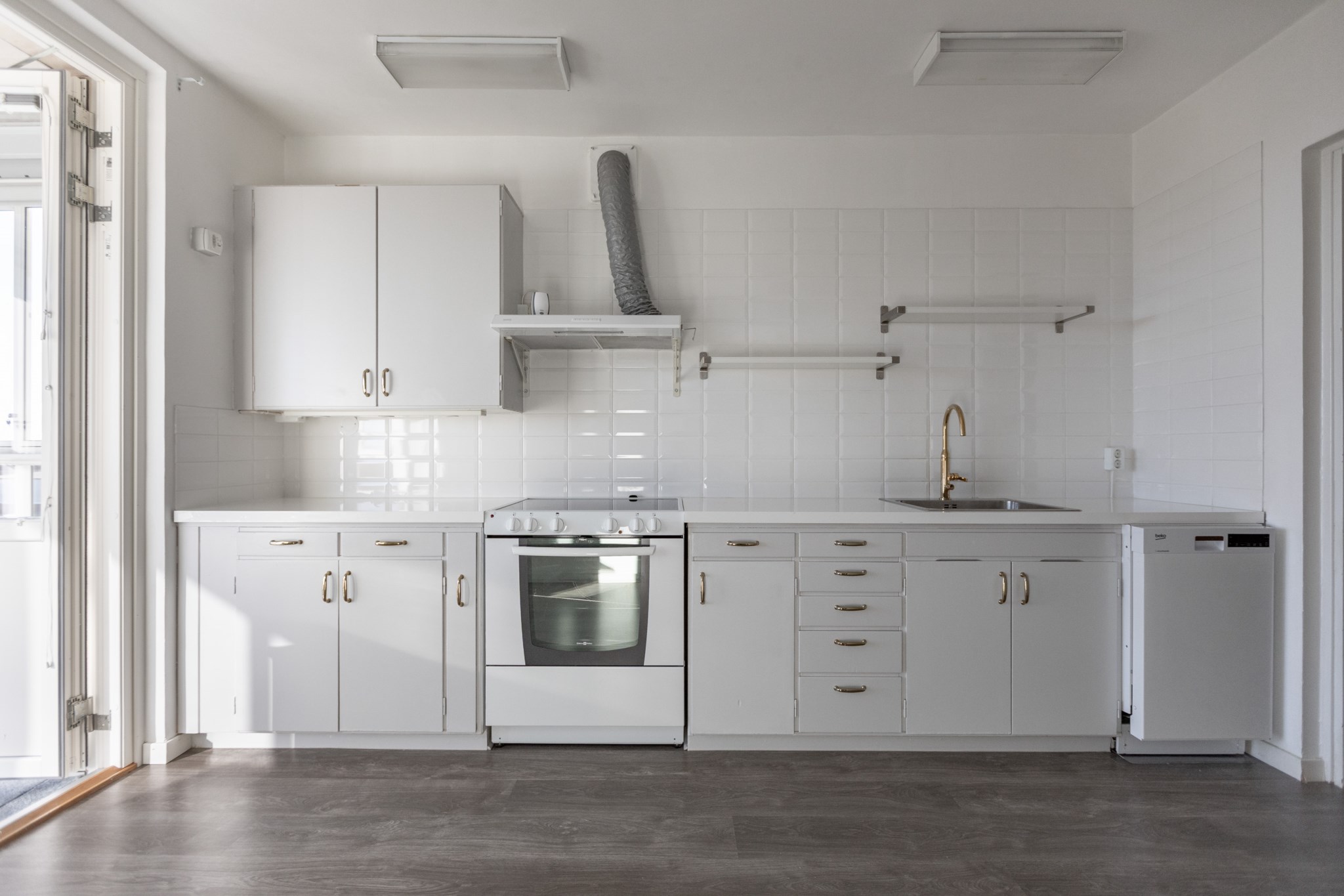Stilrent kök i vitt med gulddetaljer som ger en tidlös och elegant känsla. Här finns gott om förvaring, bra arbetsytor och plats för matbord för fyra personer. Direkt utgång till balkongen gör att köket förlängs utomhus – perfekt för måltider och avkoppling med fin utsikt. Utrustat med spis/ugn, köksfläkt, diskmaskin samt kyl och frys i fullhöjd.