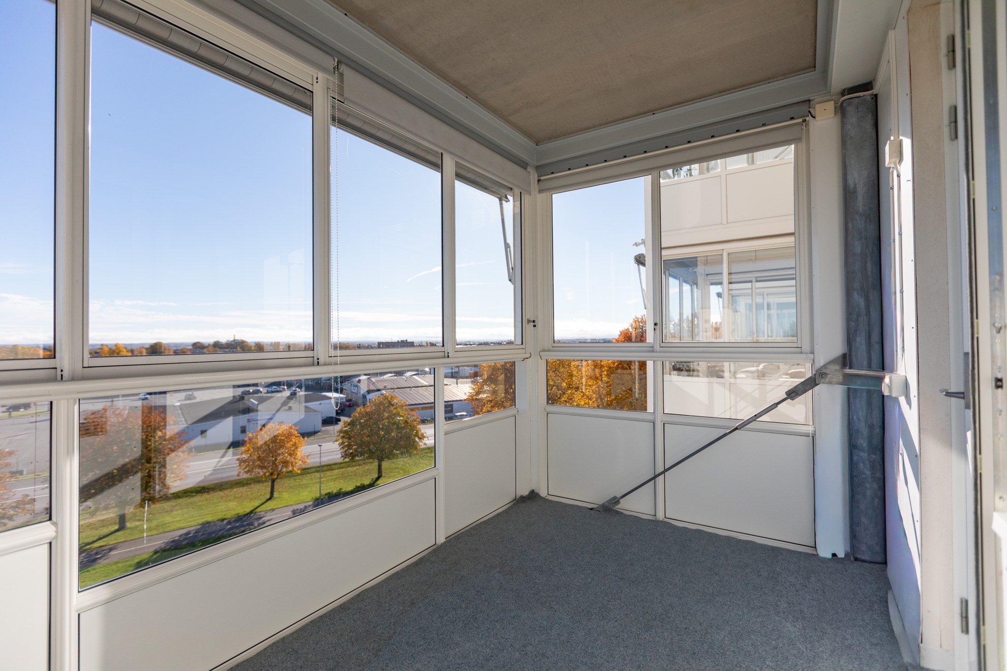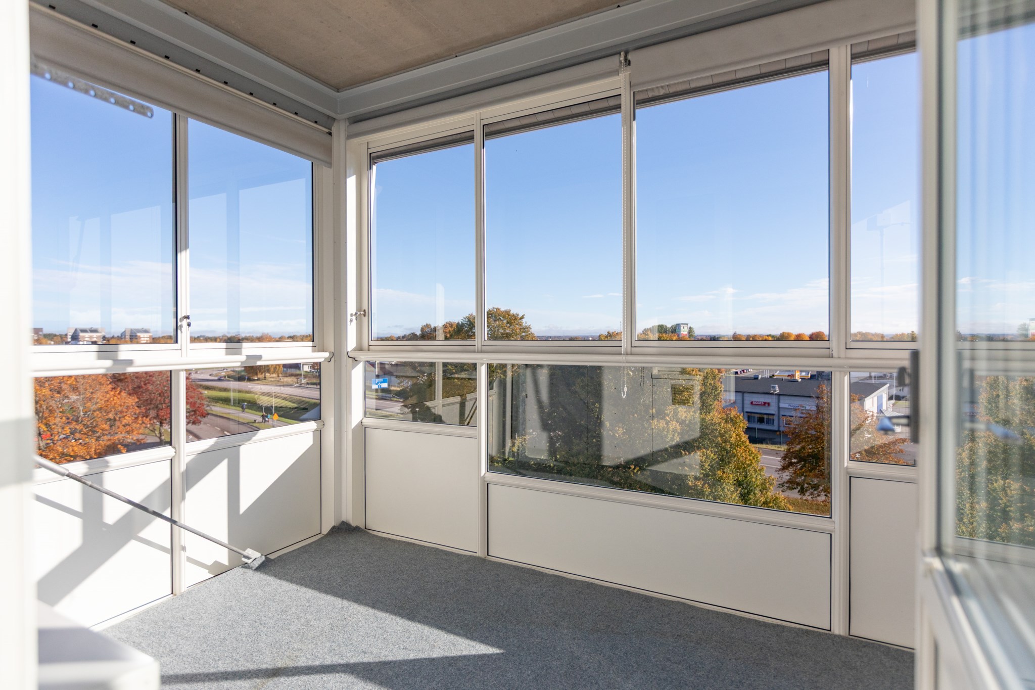 Helt inglasad blir denna ca 7 kvm stora balkong nästan som ett extra rum att njuta av när säsongen tillåter det. Med morgonsolen som lyser in och värmer kan du få magiska frukoststunder att njuta av med fantastisk utsikt.