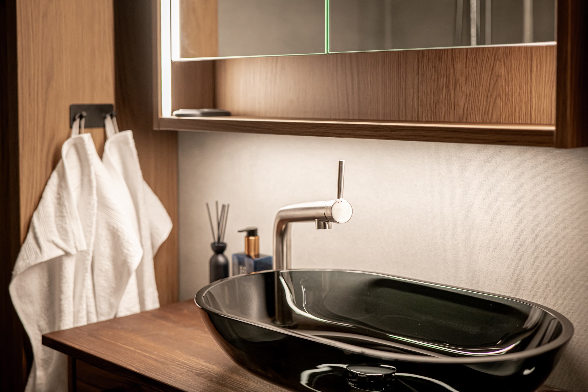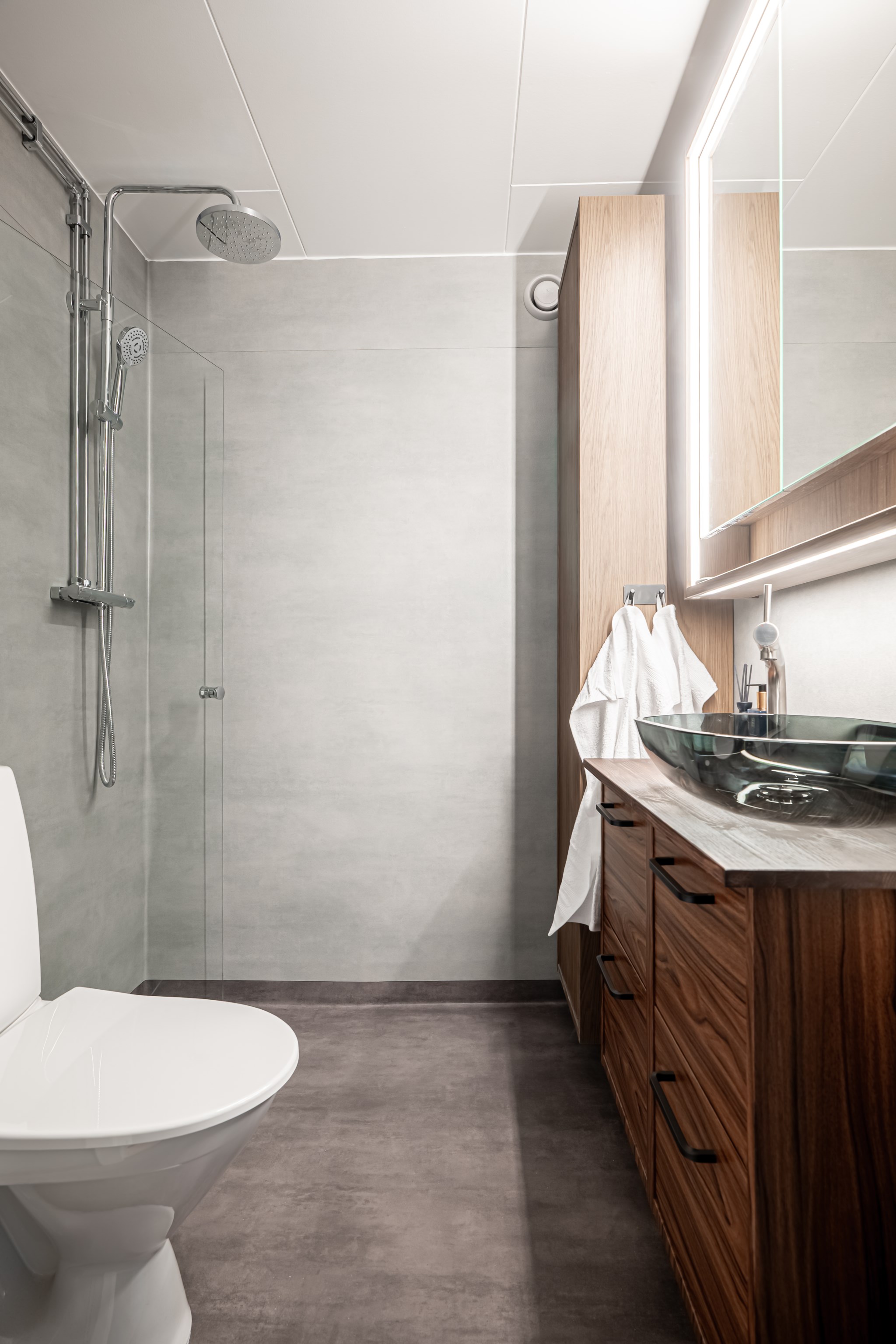 Nyrenoverat badrum från 2025 med våtrumsmatta på golv och väggar. Utrustat med duschhörna med glasdörrar och takdusch, gott om förvaring i både högskåp och underskåp. Handfat i tonat glas ger ett modernt och stilrent intryck.