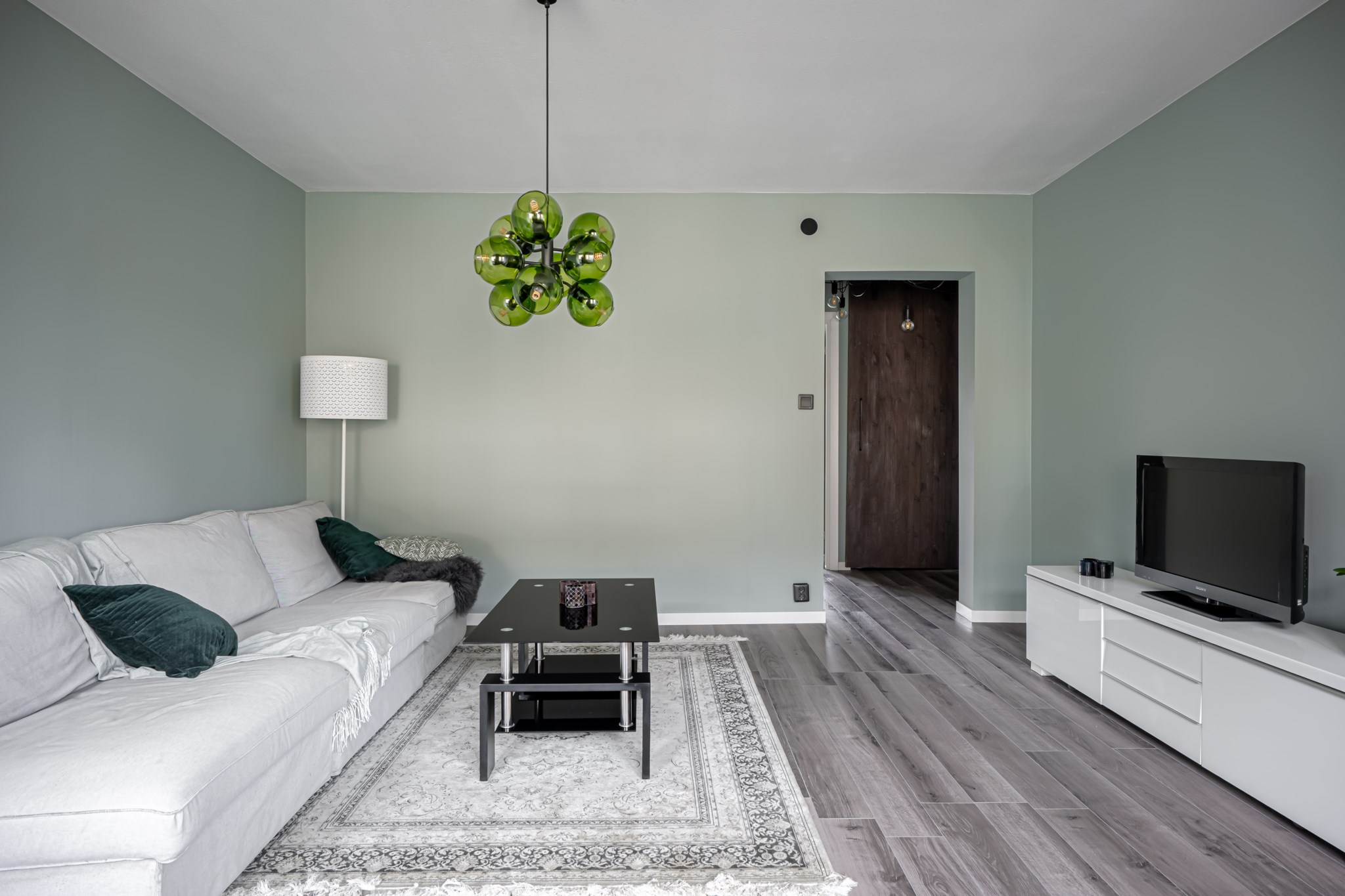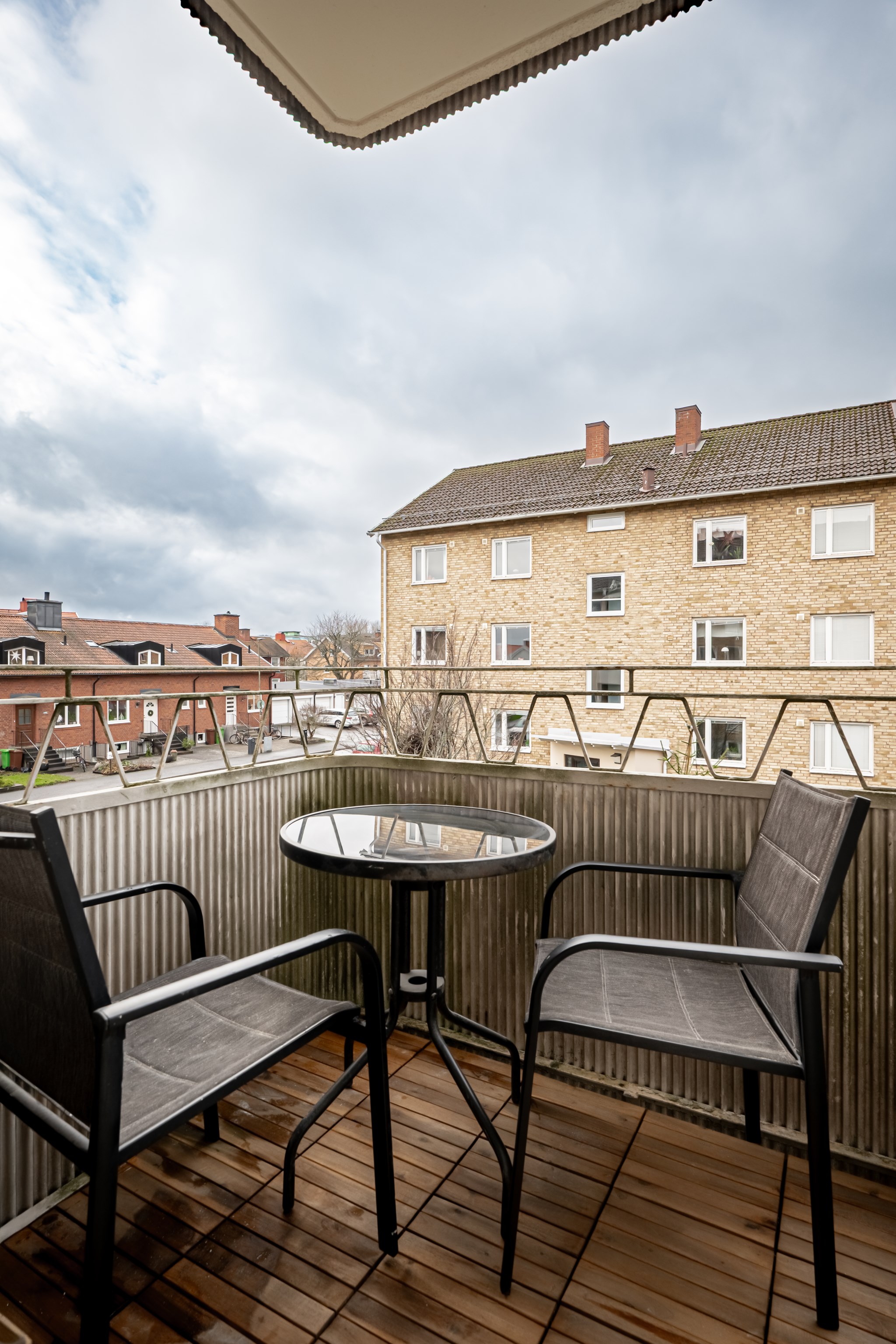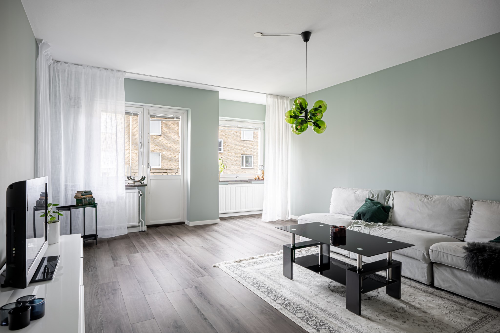 Vardagsrummet är rymligt och lättmöblerat. Enhetligt golv och lugna kulörer skapar en trivsam helhet. Härifrån nås balkongen i västerläge – en trevlig förlängning av rummet med plats för möblemang och eftermiddagssol.