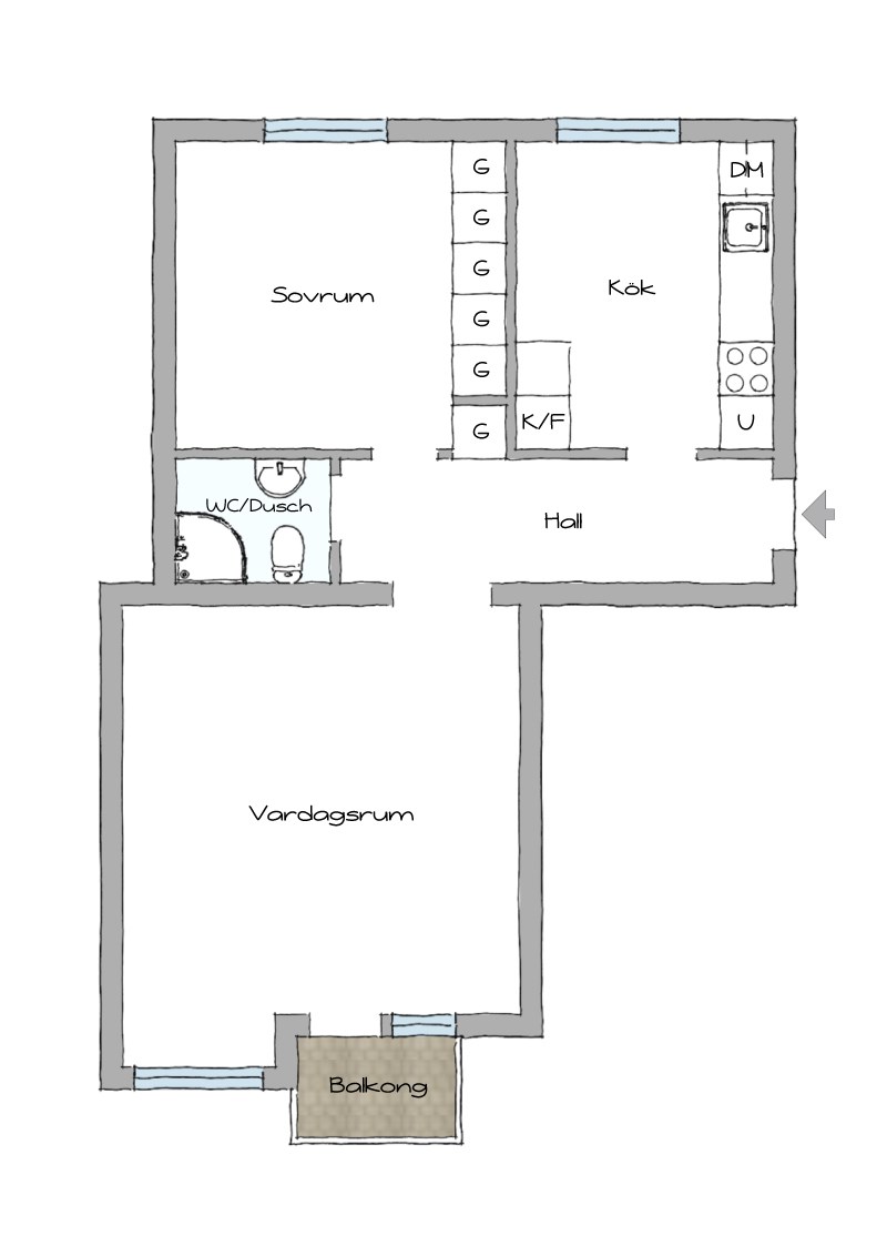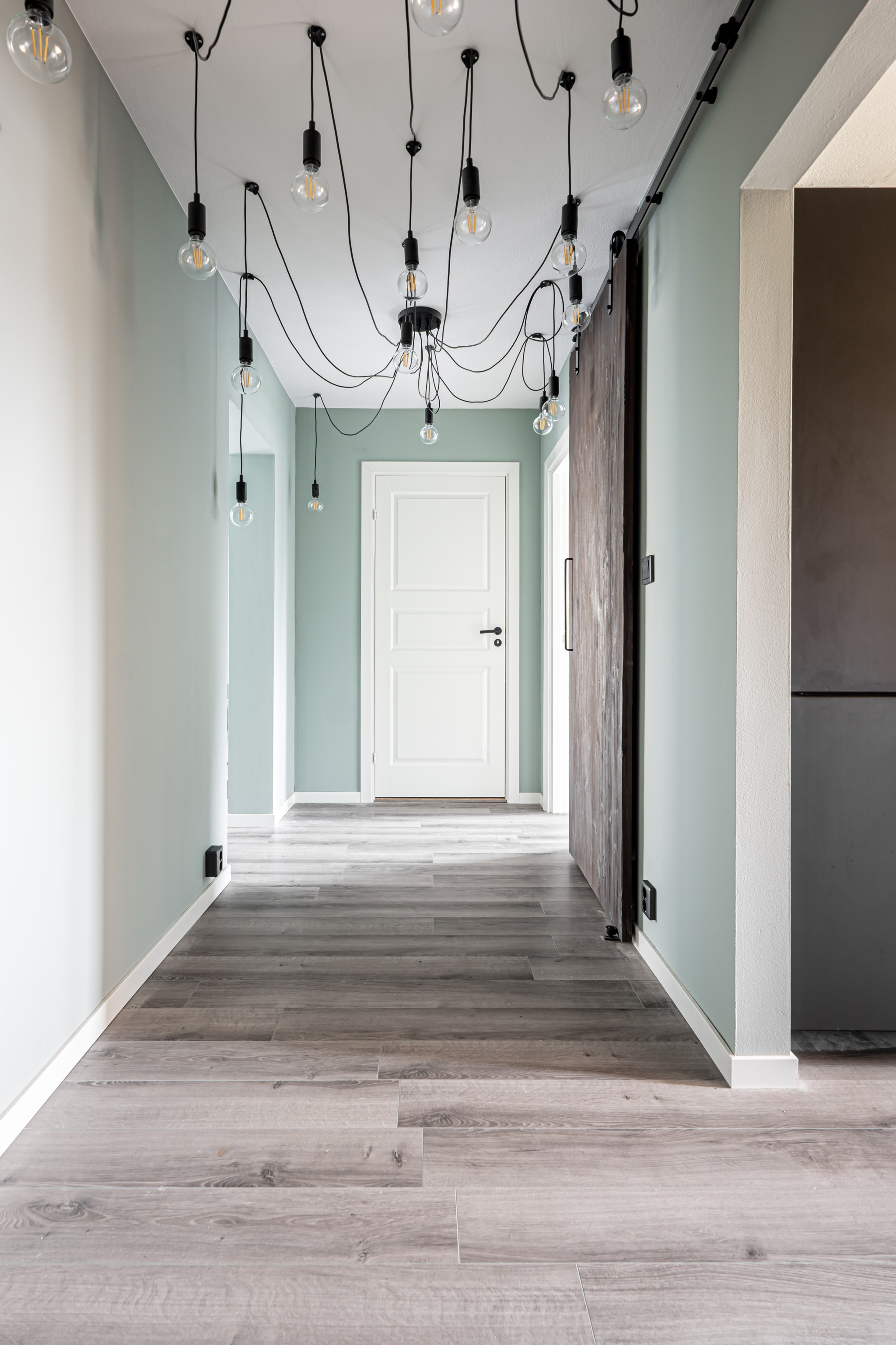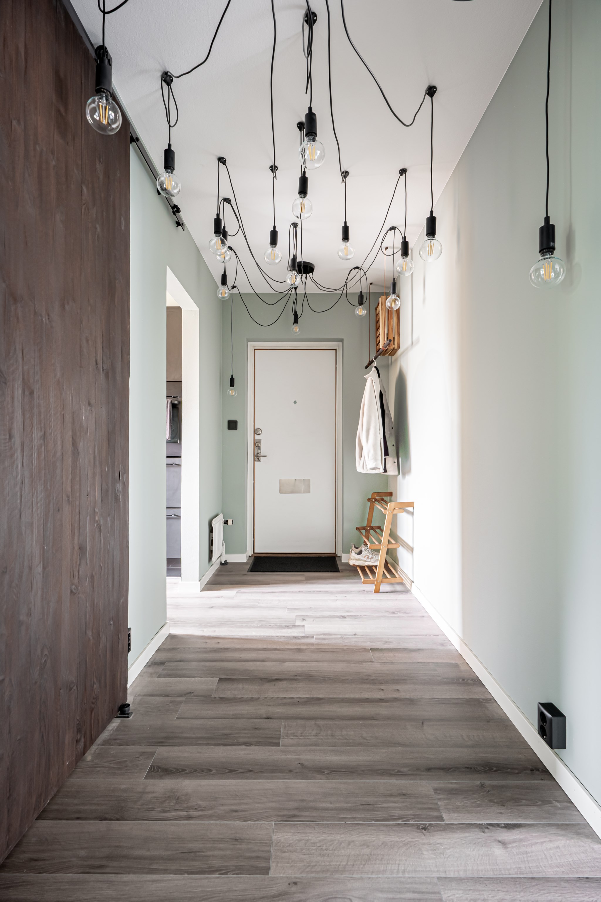 Välkommen in i hallen som ger ett stilrent första intryck. Här finns gott om plats för avhängning direkt innanför dörren samt bakom en platsbesparande skjutdörr några steg in i hallen.