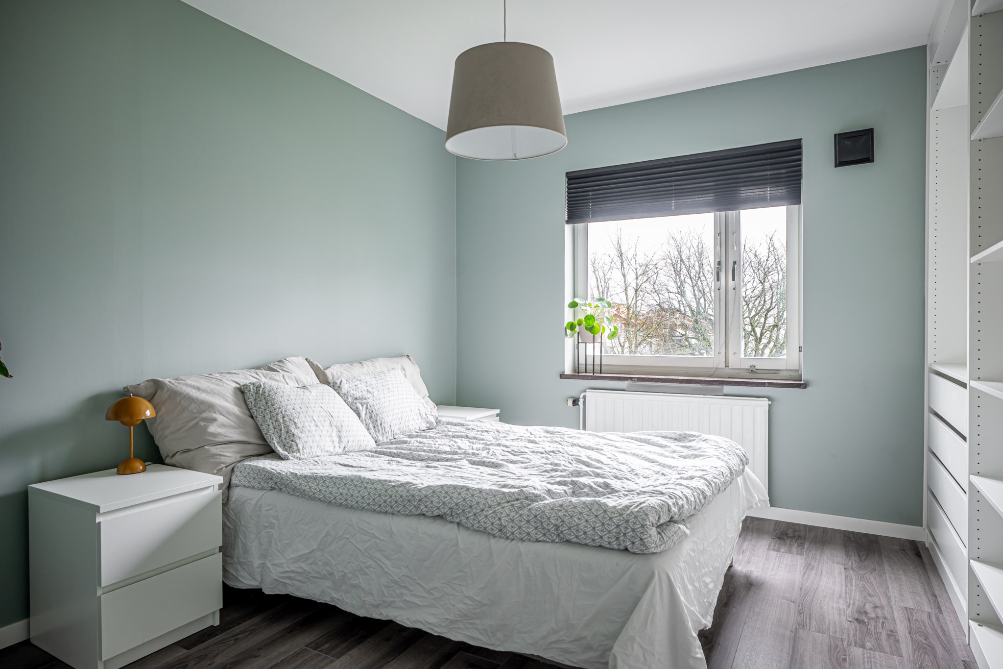 Rofyllt sovrum med plats för dubbelsäng. Förvaring erbjuds i garderobslösning längs ena väggen och rummet har ett behagligt ljusinsläpp från fönster.
